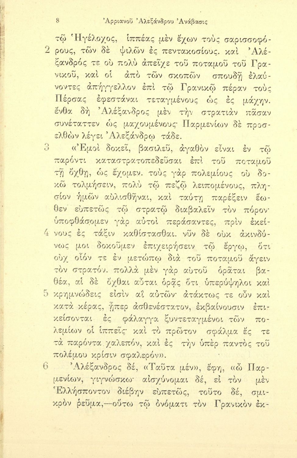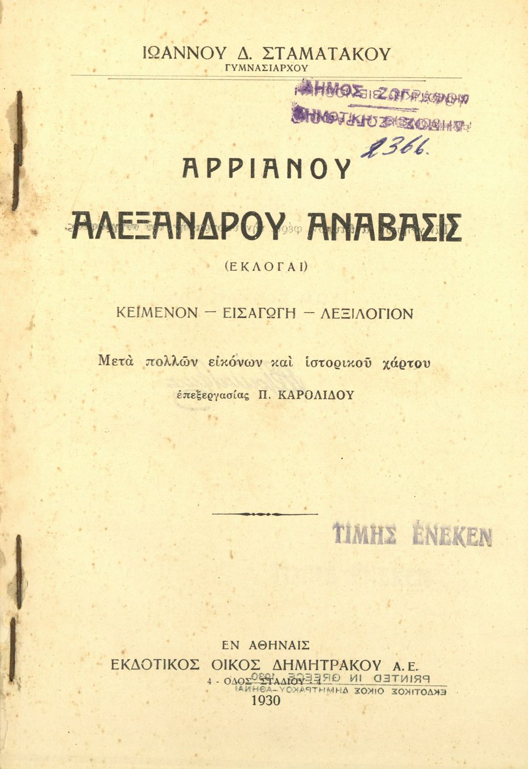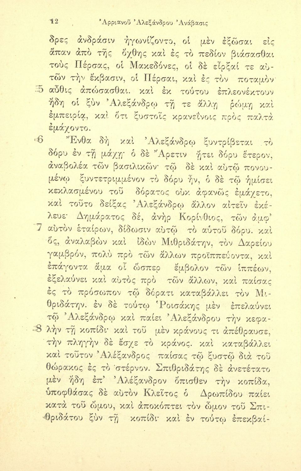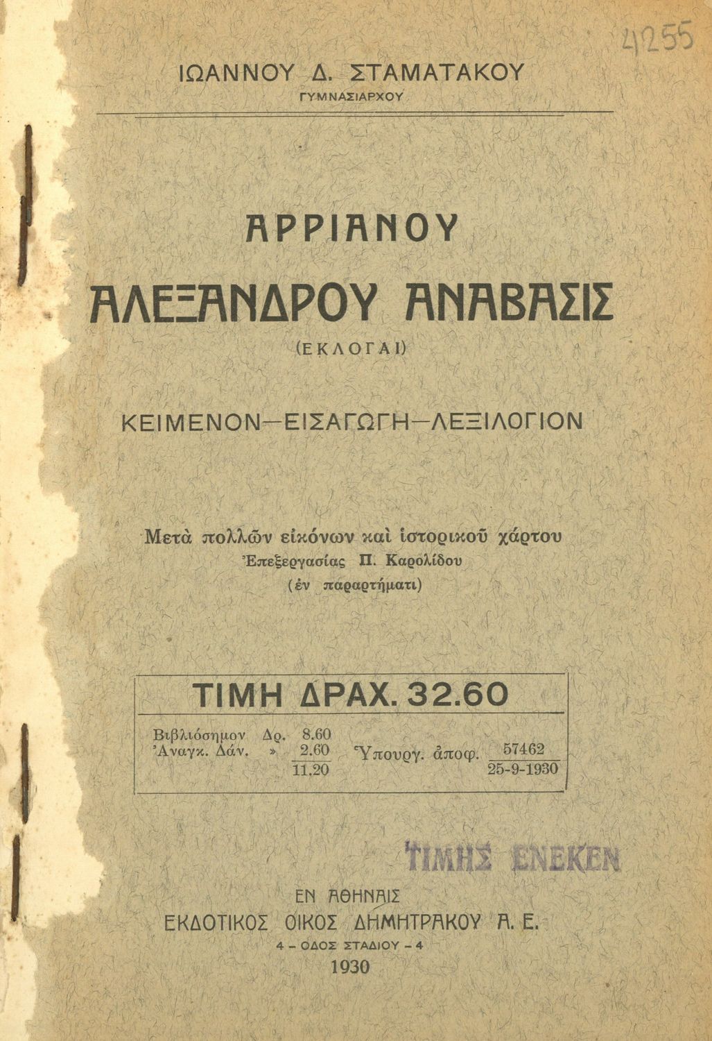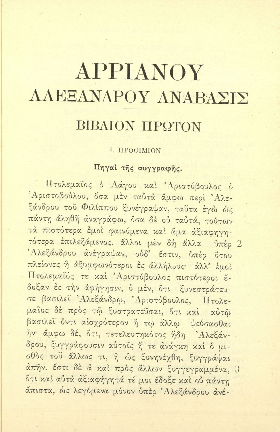 Σχολικό εγχειρίδιο Αρχαίων Ελληνικών Γ΄ Γυμνασίου που περιλαμβάνει το έργο του Αρριανού Αλεξάνδρου Ανάβασις, εισαγωγή στη βιογραφία και εργογραφία του Αρριανού, λεξιλόγιο και λεξιλογικά σχόλια, εικόνες στρατιωτών και όπλων της περιόδου.