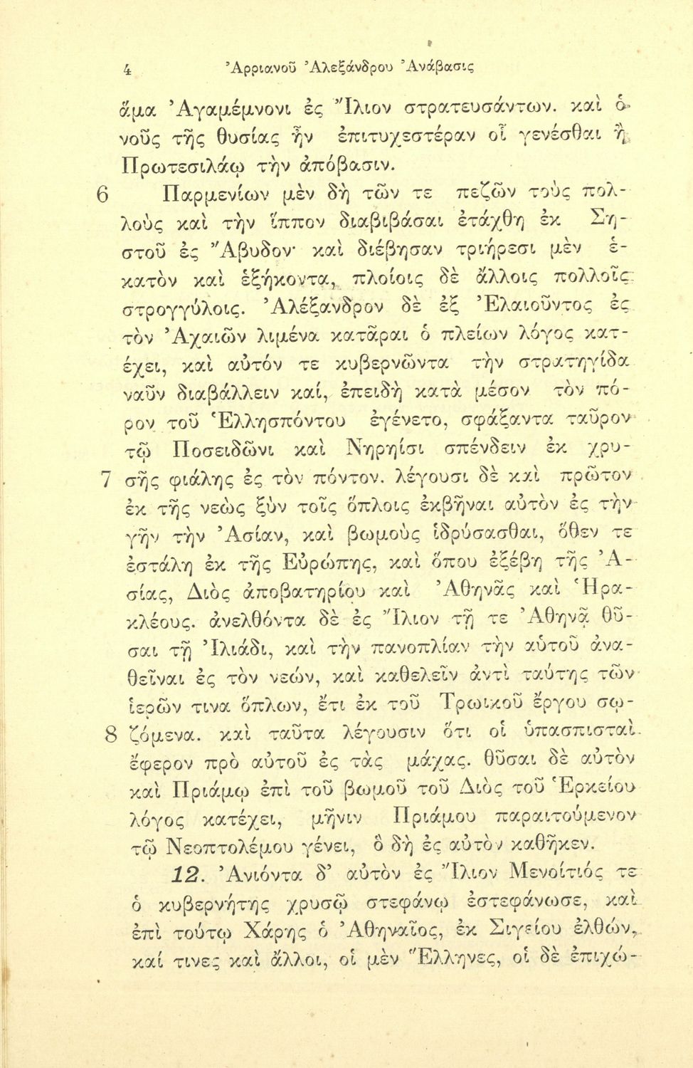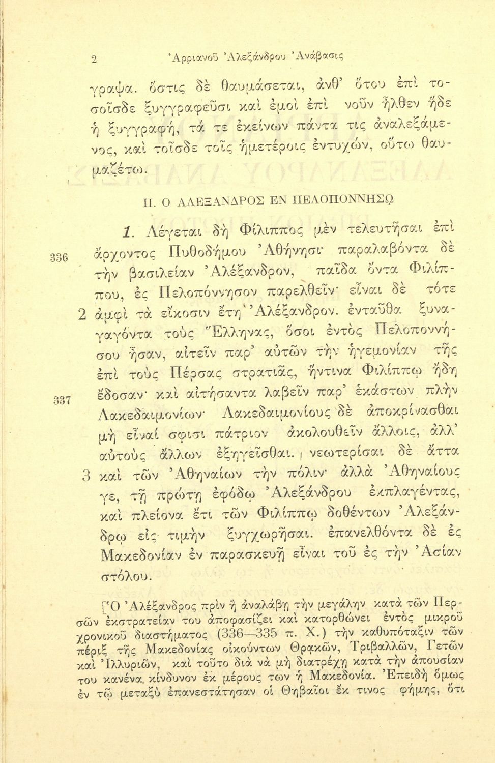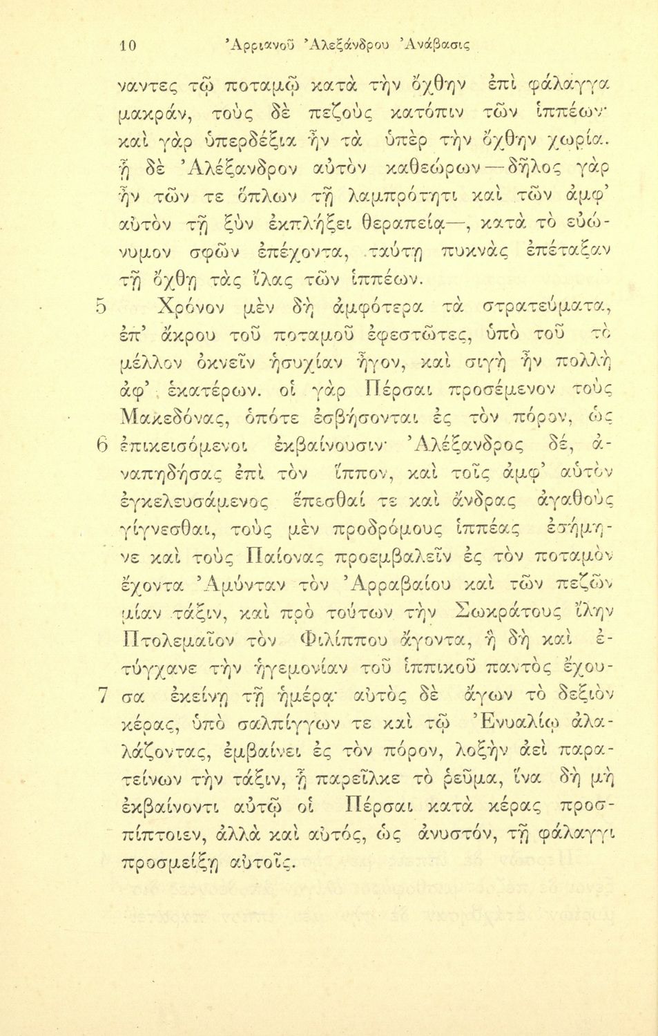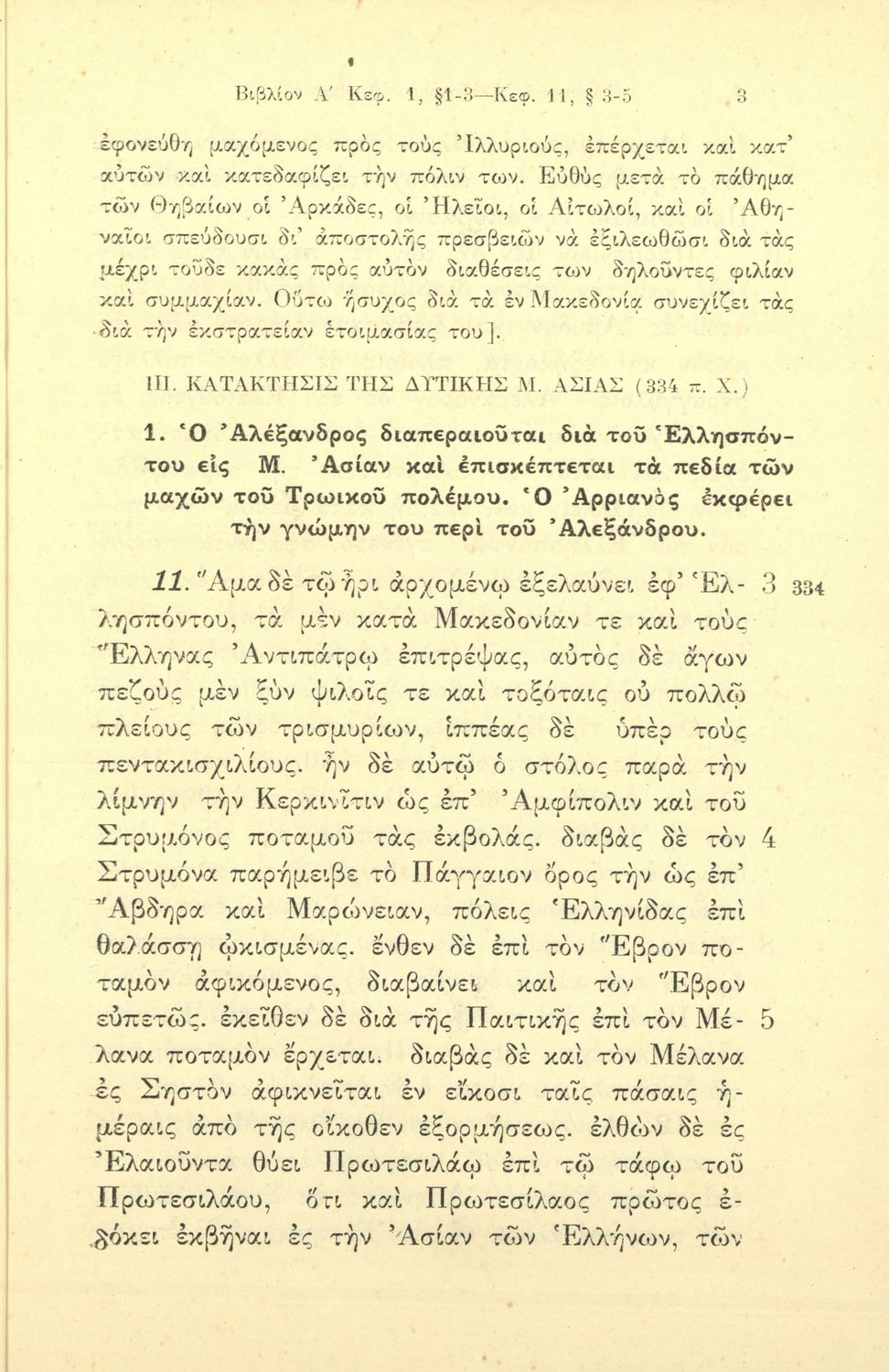 Σχολικό εγχειρίδιο Αρχαίων Ελληνικών Γ΄ Γυμνασίου που περιλαμβάνει το έργο του Αρριανού Αλεξάνδρου Ανάβασις, εισαγωγή στη βιογραφία και εργογραφία του Αρριανού, λεξιλόγιο και λεξιλογικά σχόλια, εικόνες στρατιωτών και όπλων της περιόδου.