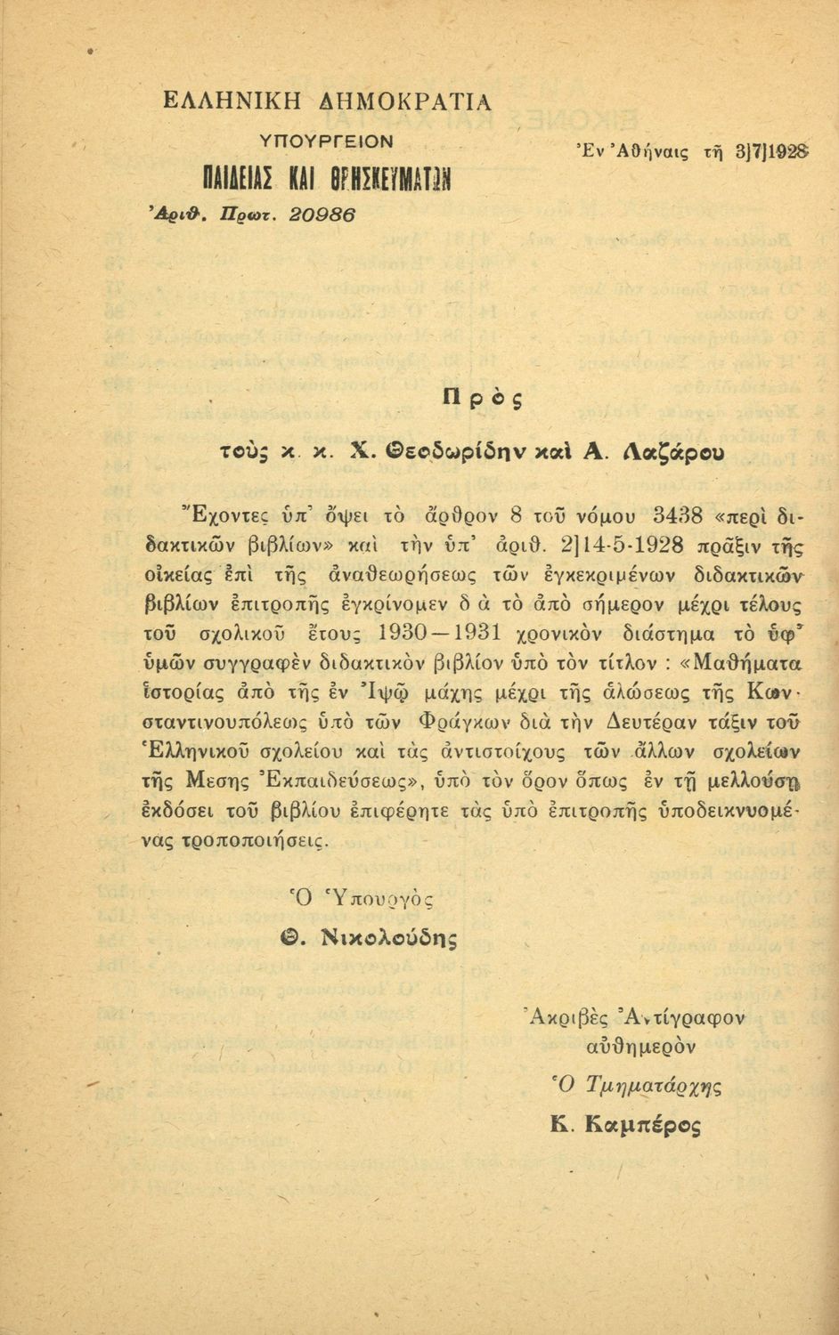 Υπουργική απόφαση / Σύμβαση: 20986/3-7-1928