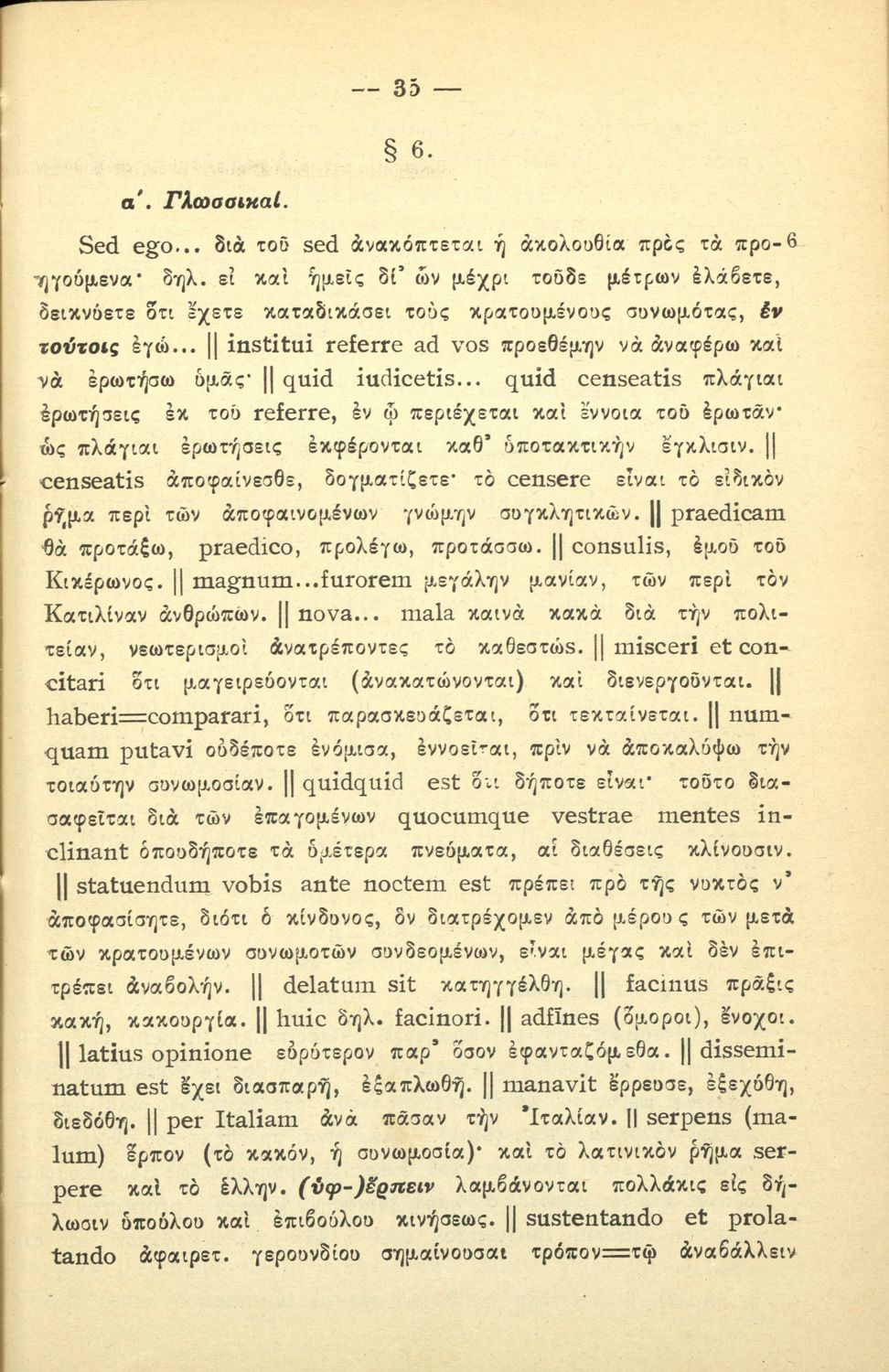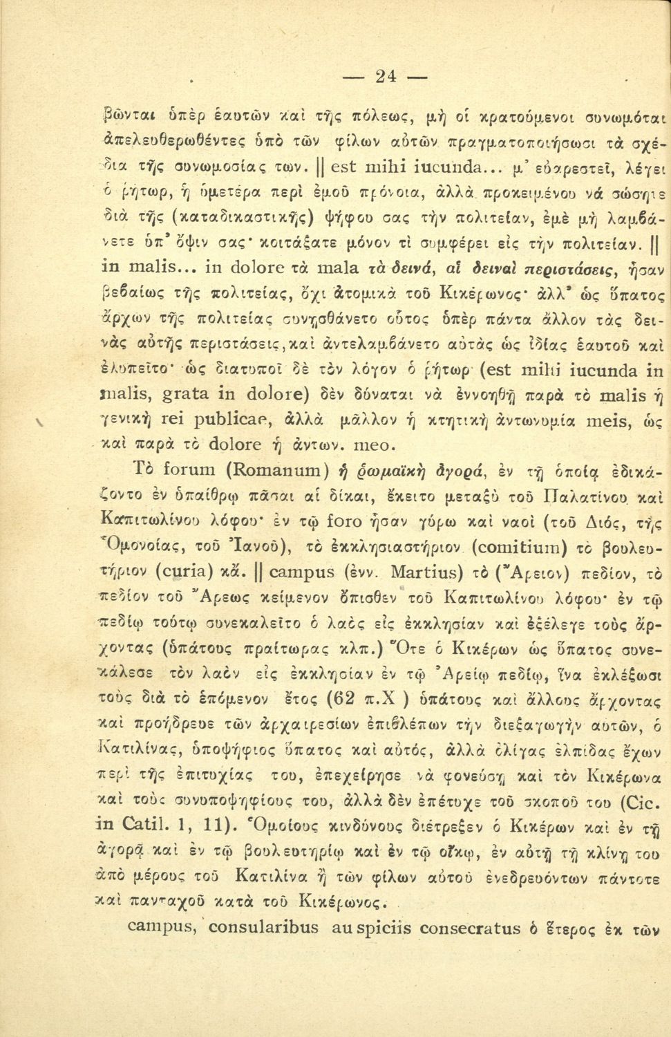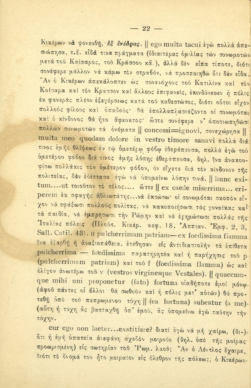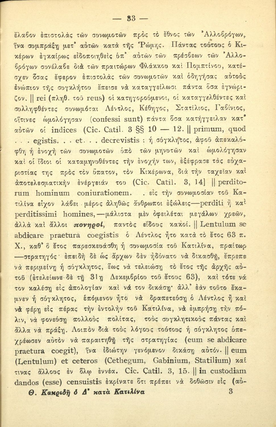 Σχολικό εγχειρίδιο Λατινικών για τη Γ΄ Γυμνασίου που περιλαμβάνει κείμενο, βιογραφικό σημείωμα του Κικέρωνα, εισαγωγικές παρατηρήσεις και ερμηνευτικές σημειώσεις.