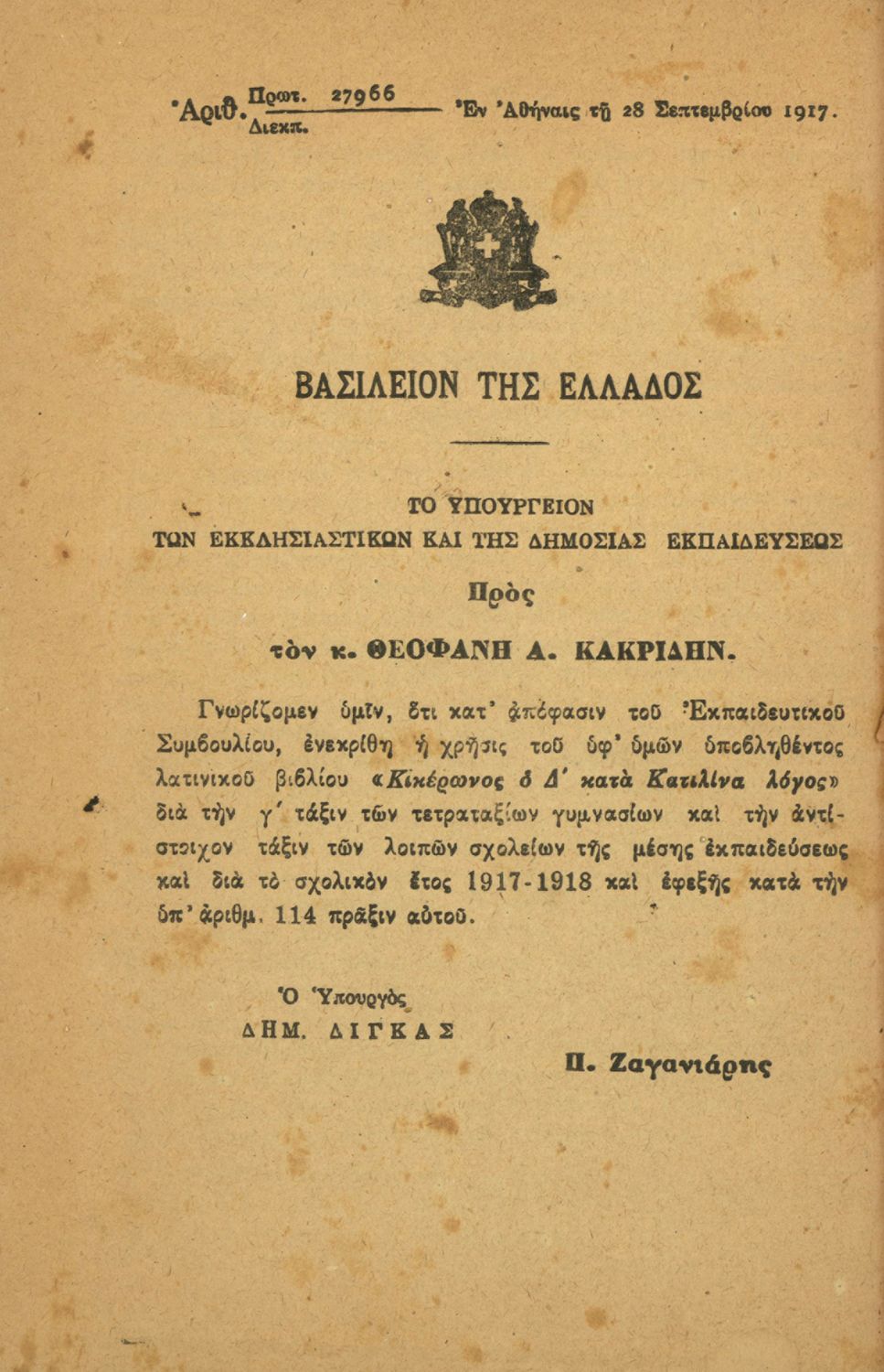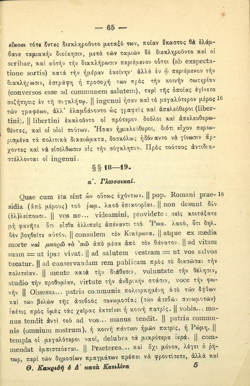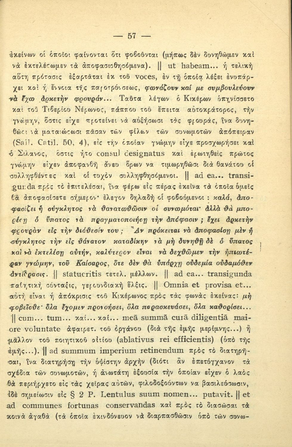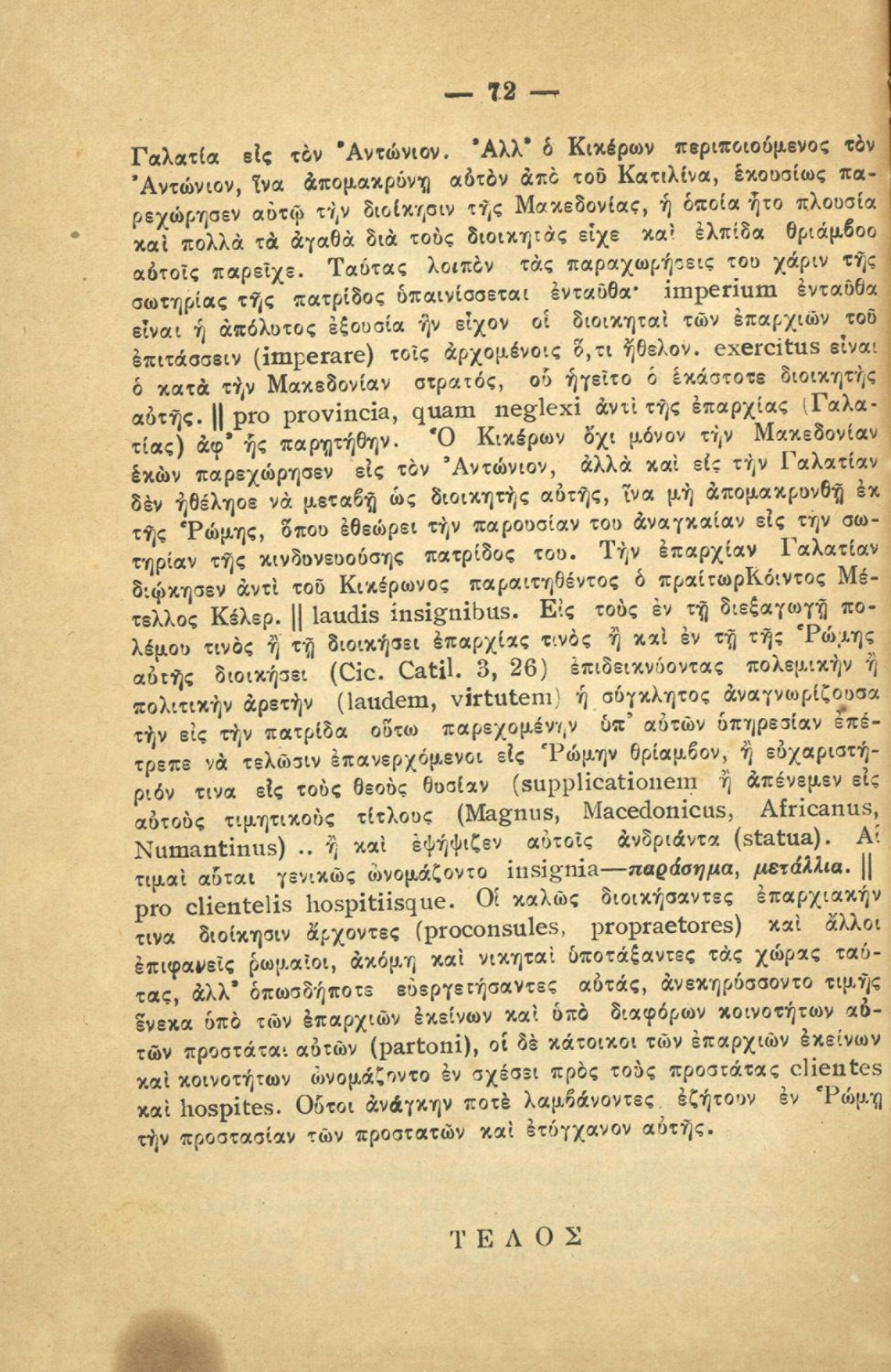 Σχολικό εγχειρίδιο Λατινικών για τη Γ΄ Γυμνασίου που περιλαμβάνει κείμενο, βιογραφικό σημείωμα του Κικέρωνα, εισαγωγικές παρατηρήσεις και ερμηνευτικές σημειώσεις.