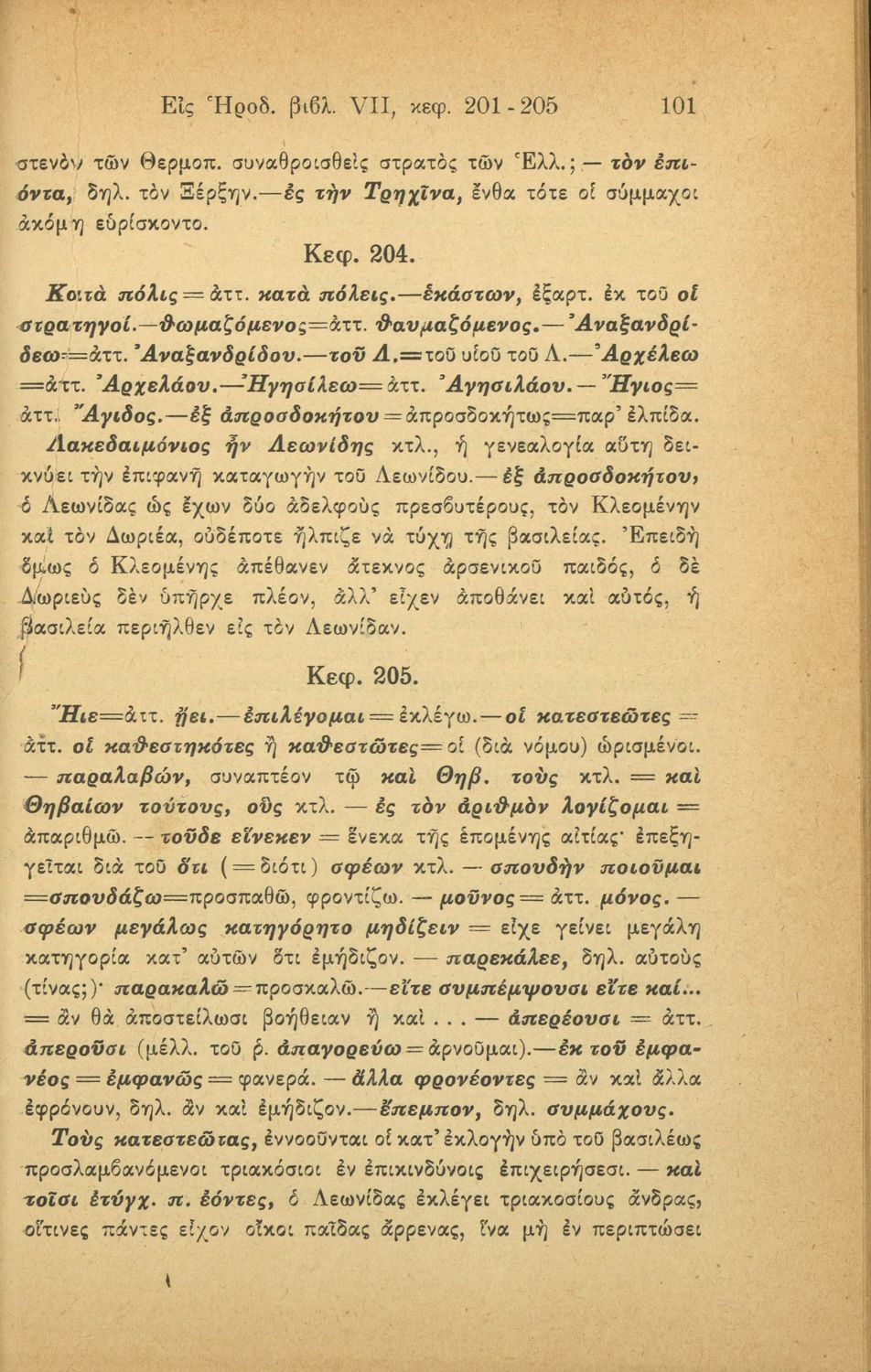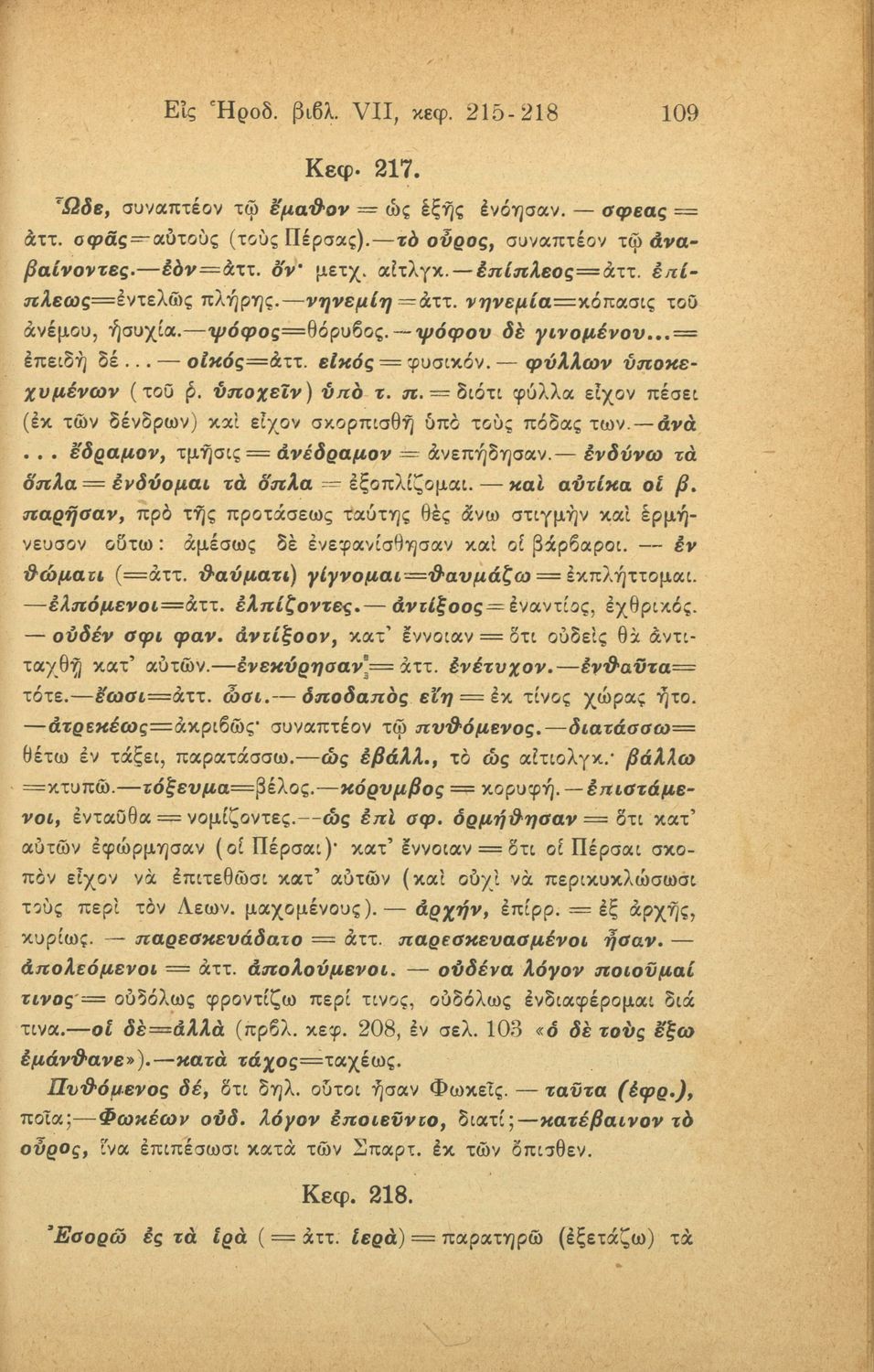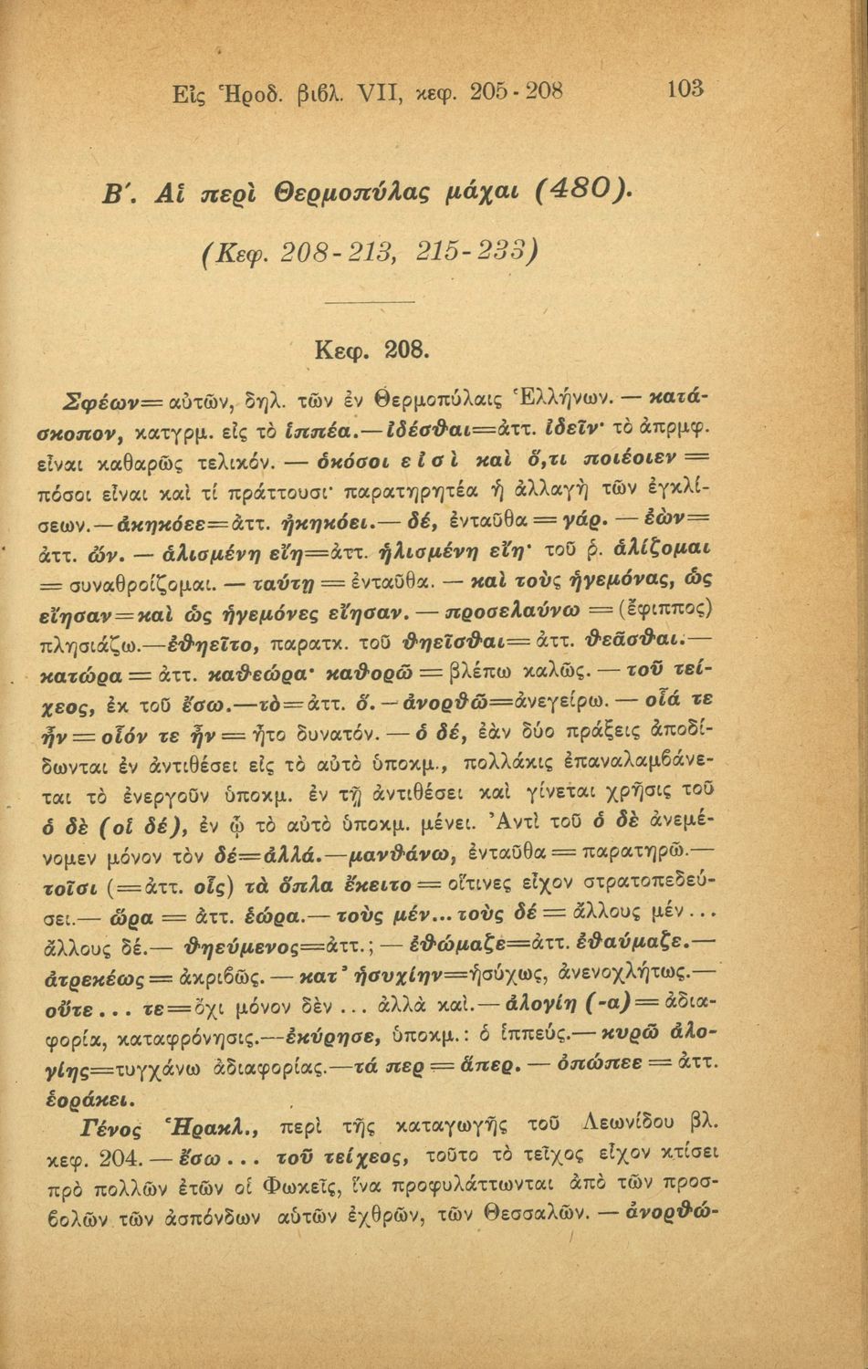Σχολικό εγχειρίδιο Αρχαίων Ελληνικών Α΄ Γυμνασίου και Α' Διδασκαλείου που περιλαμβάνει αποσπάσματα από το έργο του Ηρόδοτου, ερμηνευτικές σημειώσεις, πραγματολογικά, λεξικολογικά και γραμματικά σχόλια.