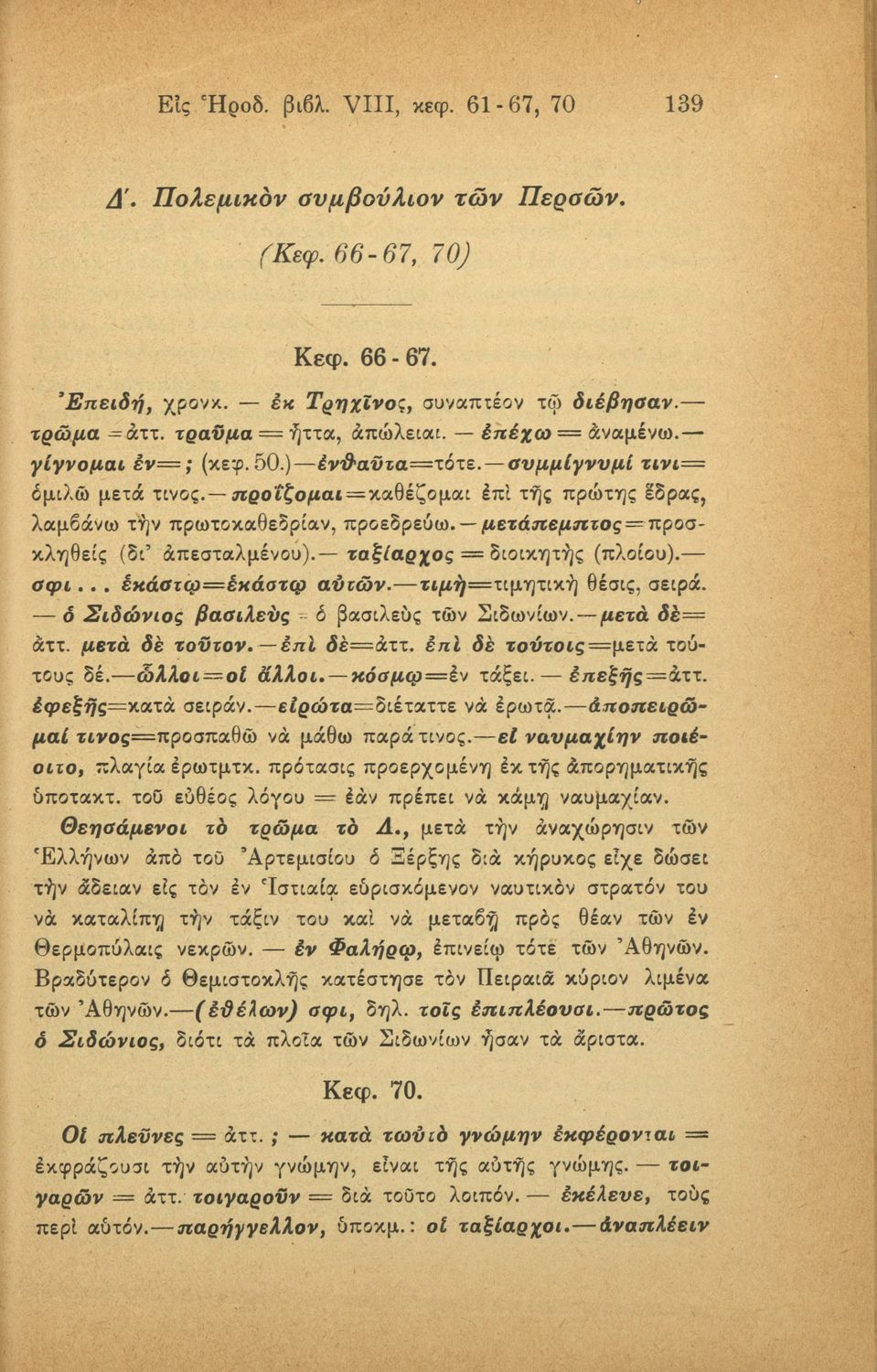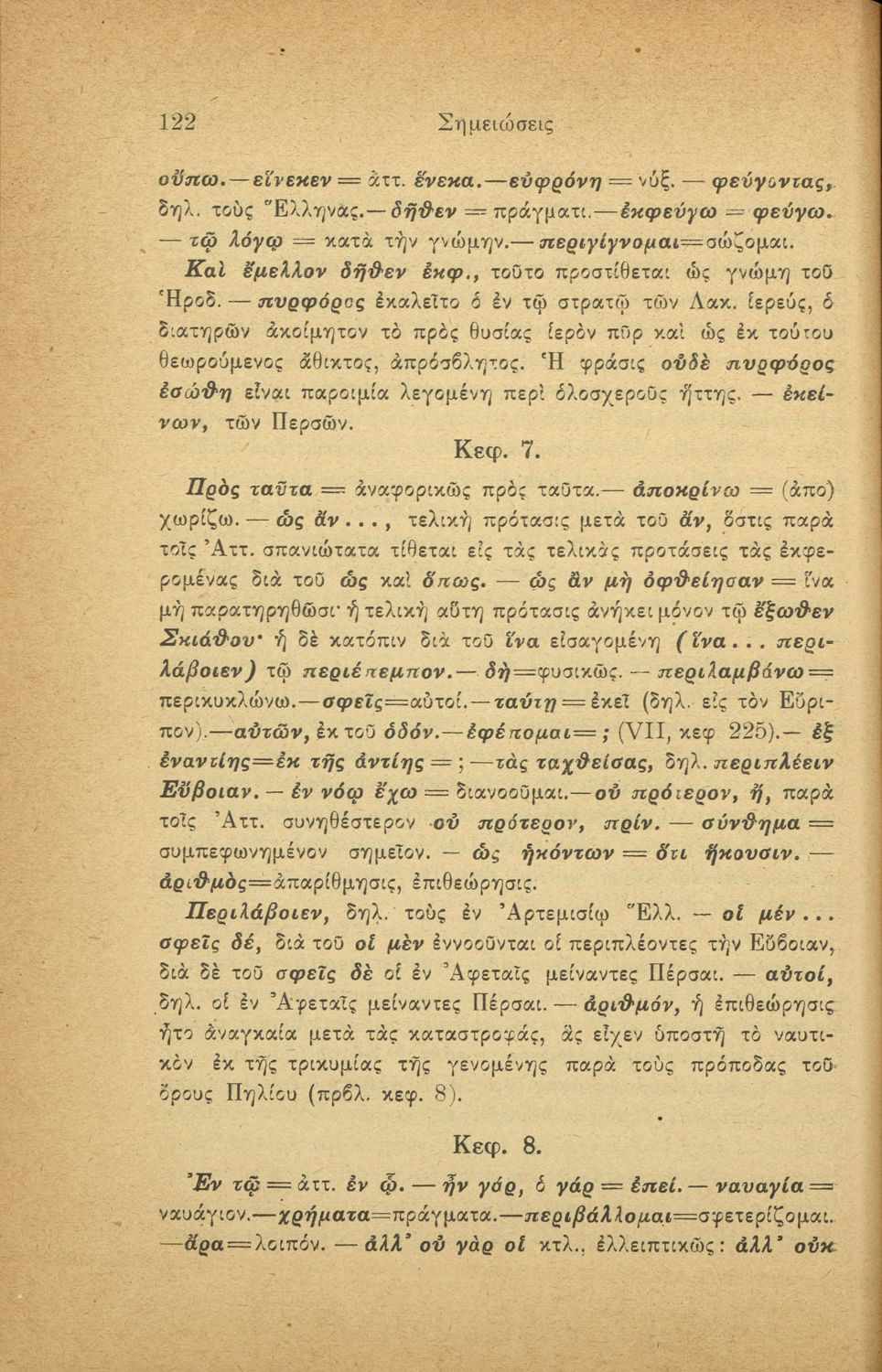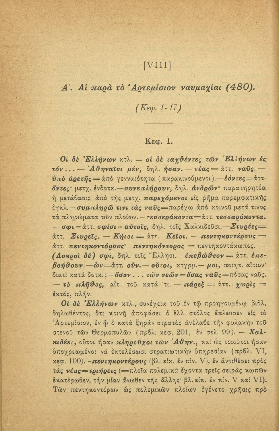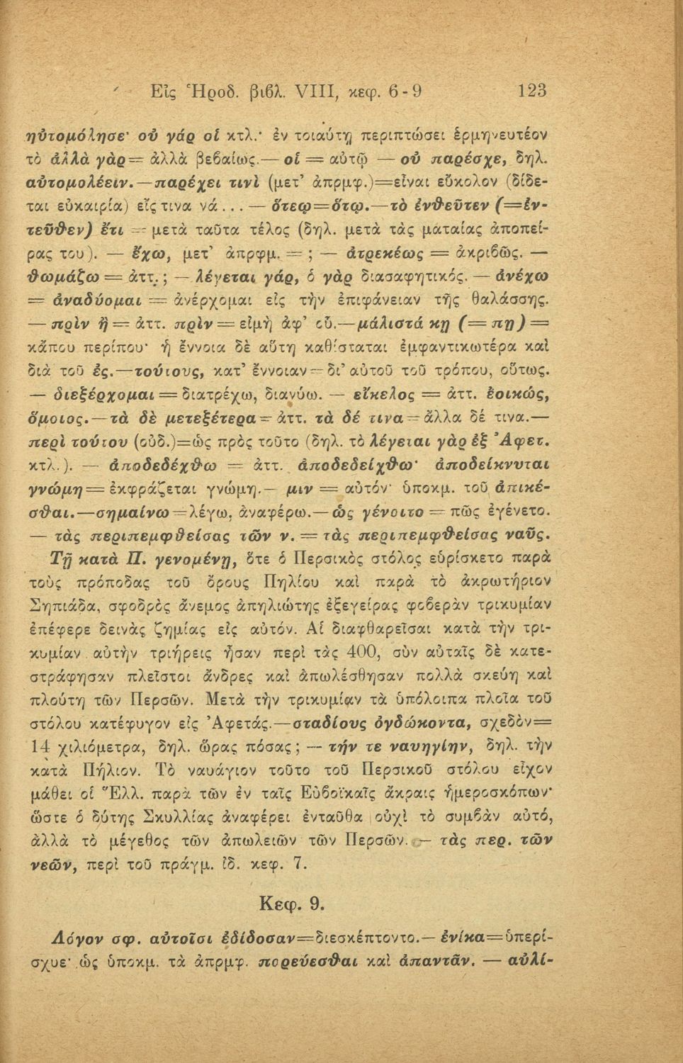 Σχολικό εγχειρίδιο Αρχαίων Ελληνικών Α΄ Γυμνασίου και Α' Διδασκαλείου που περιλαμβάνει αποσπάσματα από το έργο του Ηρόδοτου, ερμηνευτικές σημειώσεις, πραγματολογικά, λεξικολογικά και γραμματικά σχόλια.