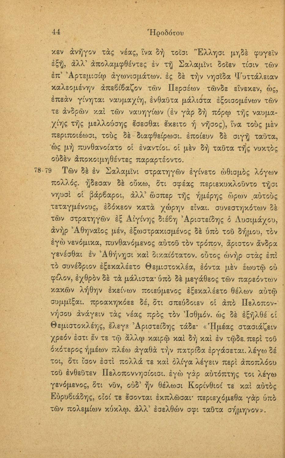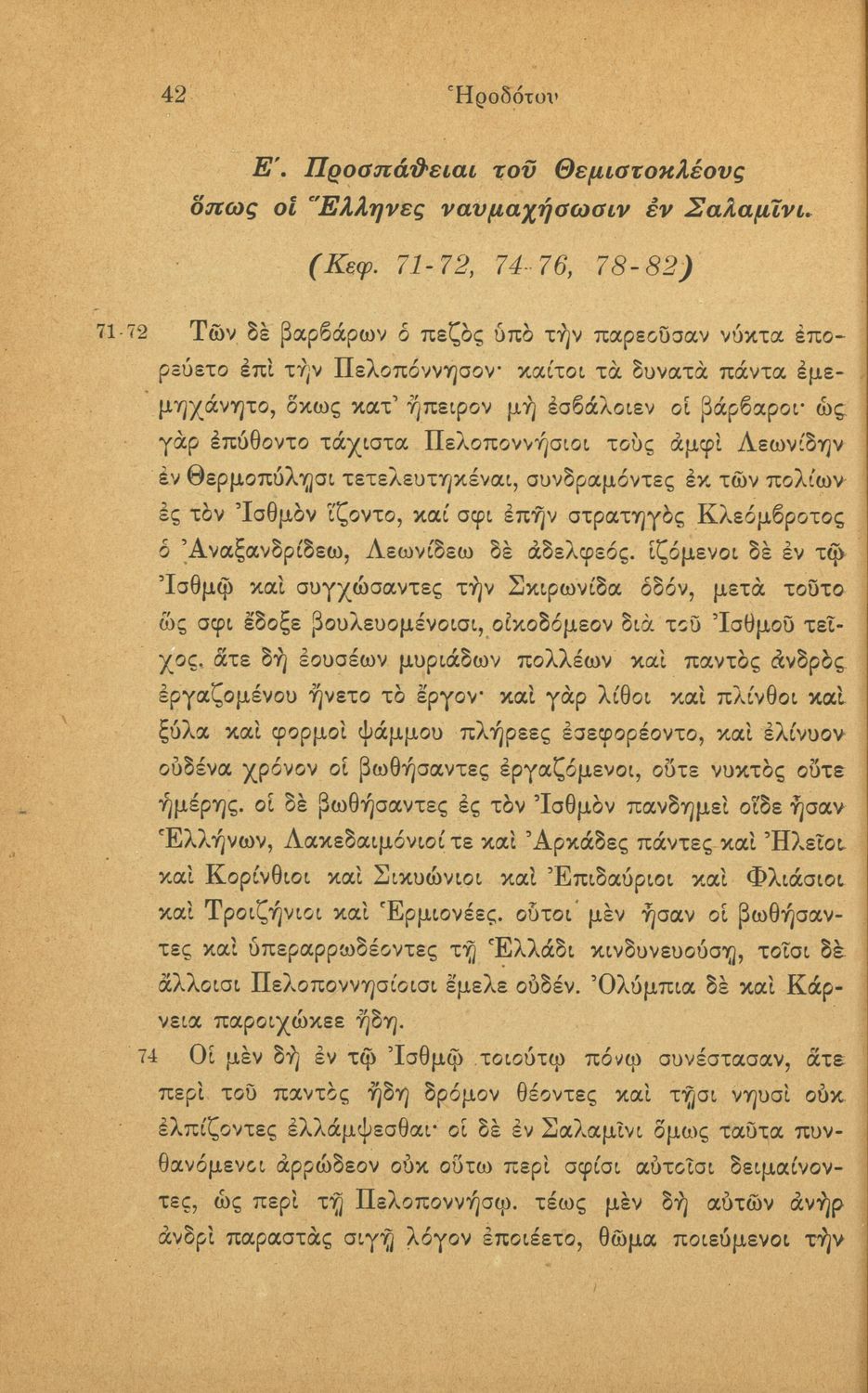Σχολικό εγχειρίδιο Αρχαίων Ελληνικών Α΄ Γυμνασίου και Α' Διδασκαλείου που περιλαμβάνει αποσπάσματα από το έργο του Ηρόδοτου, ερμηνευτικές σημειώσεις, πραγματολογικά, λεξικολογικά και γραμματικά σχόλια.
