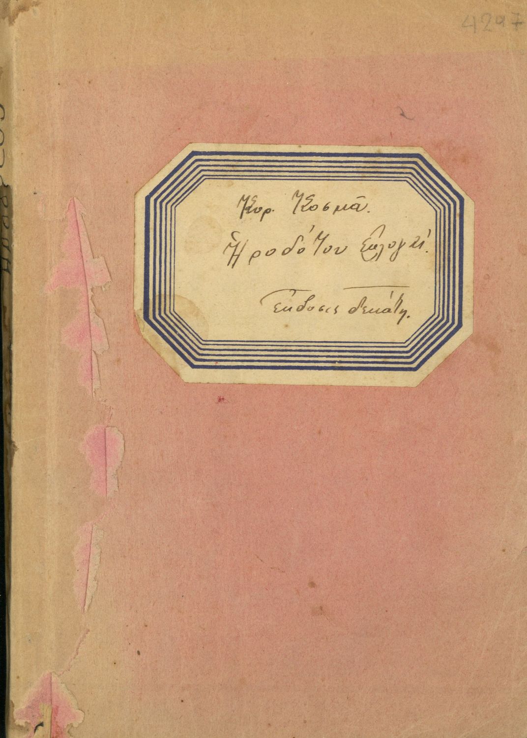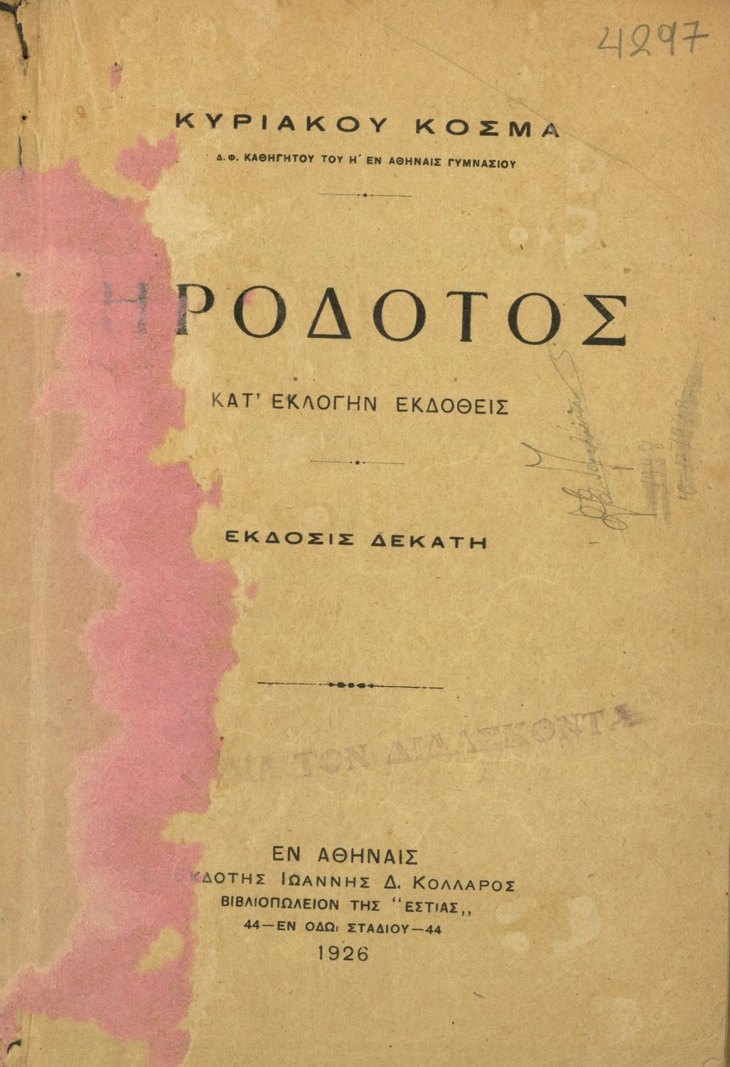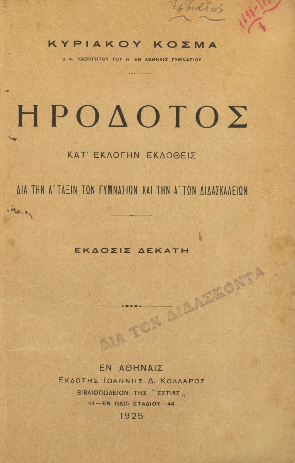 Τίτλος: Ηρόδοτος κατ' εκλογήν εκδοθείς διά την Α΄ τάξιν των Γυμνασίων και των Α΄ των Διδασκαλείων