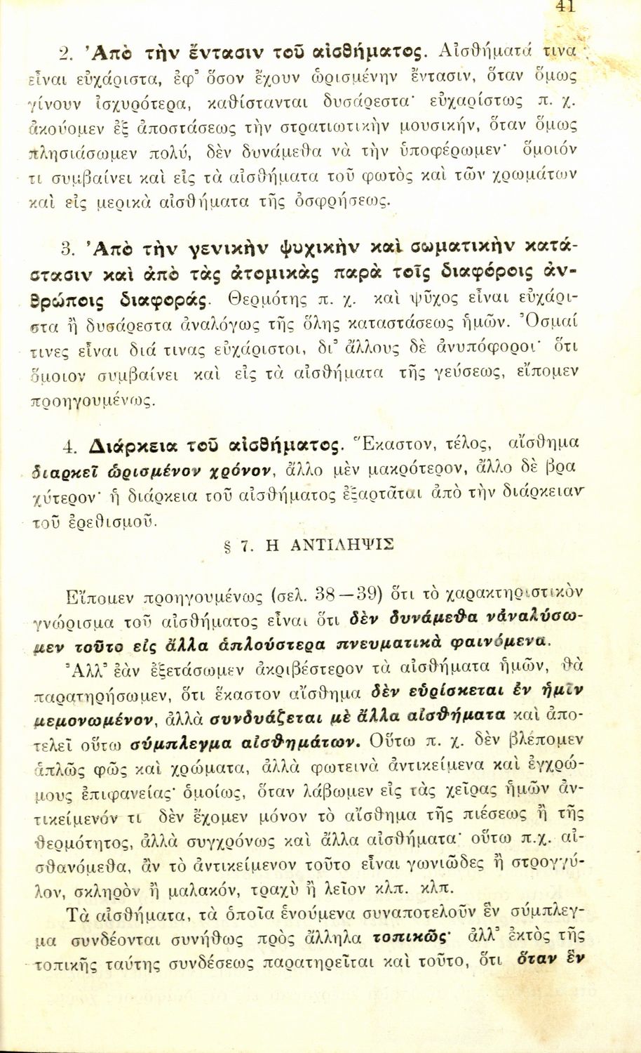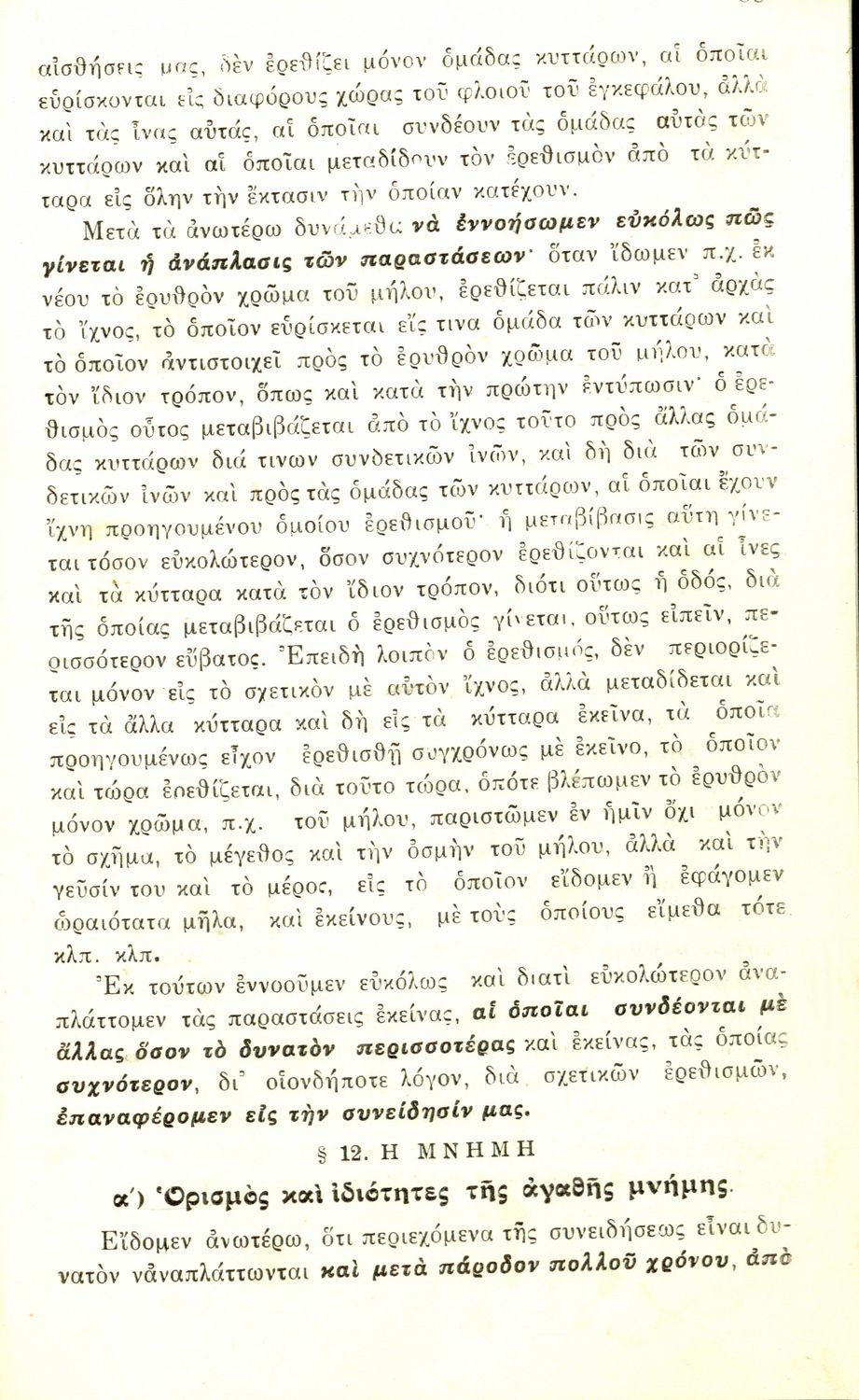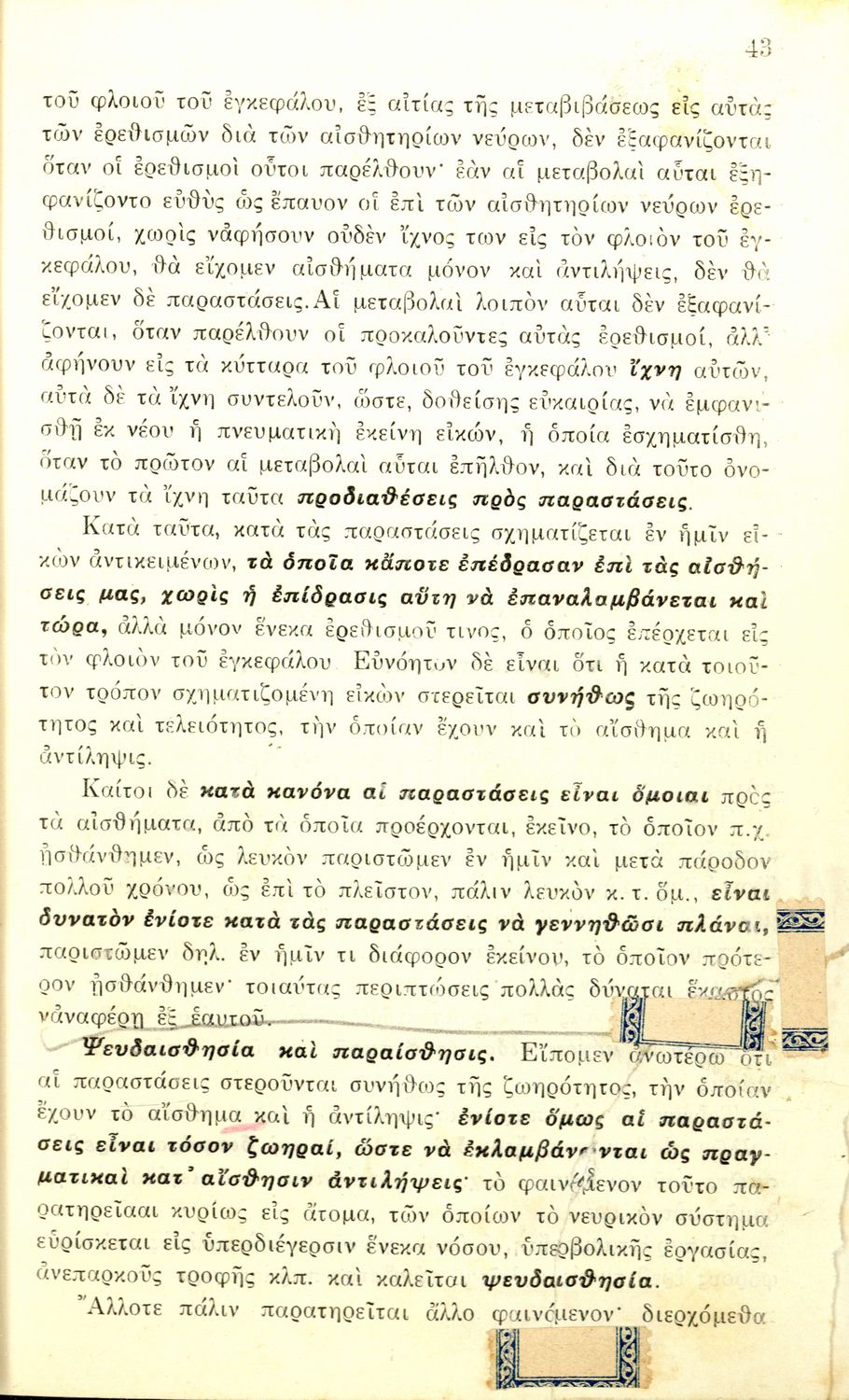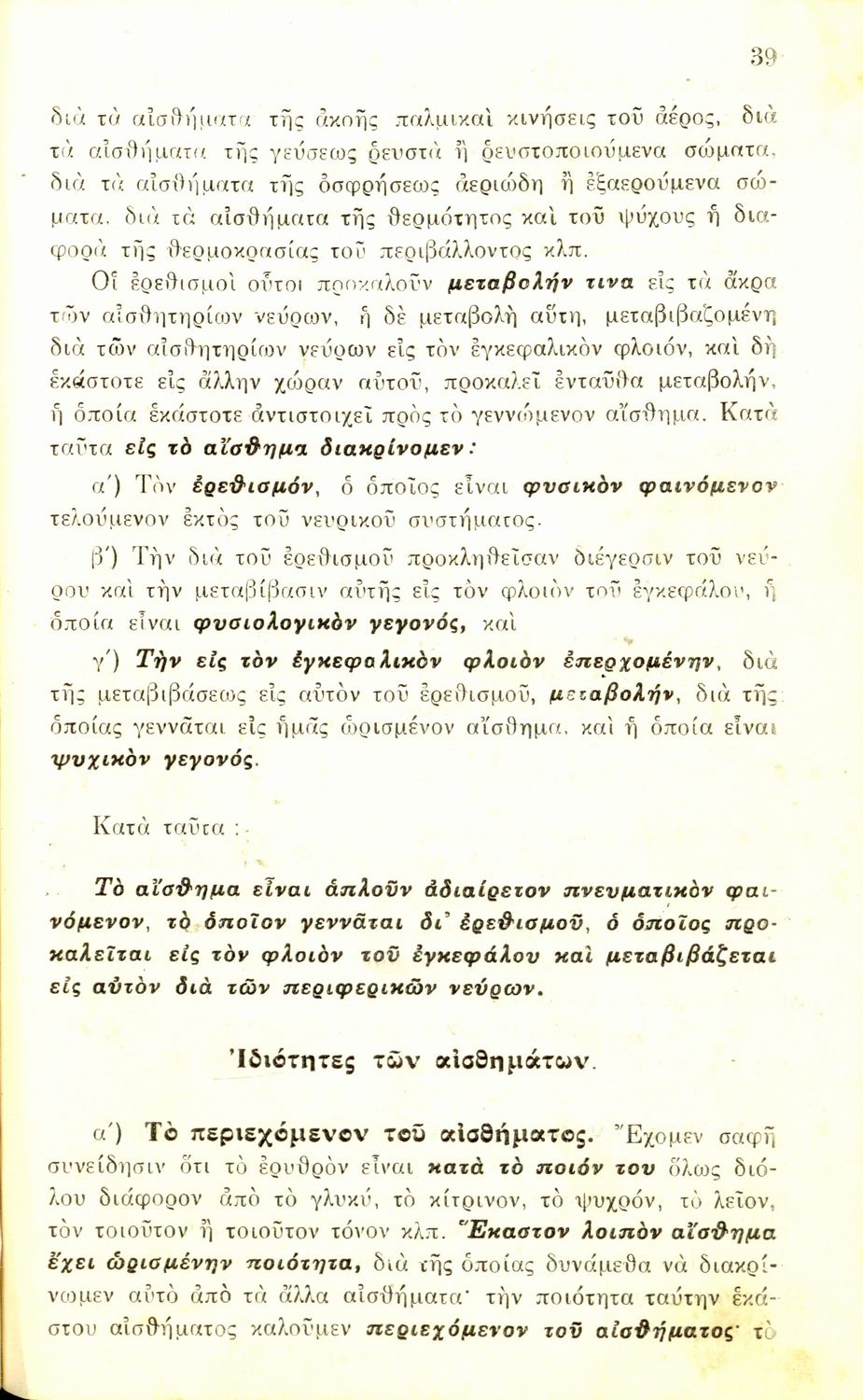 Σχολικό εγχειρίδιο Πειραματικής Ψυχολογίας για τη Γ΄ Γυμνασίου χωρισμένο σε τρία τμήματα: το παριστάναι, το συναισθάνεσθαι, και το βούλεσθαι.