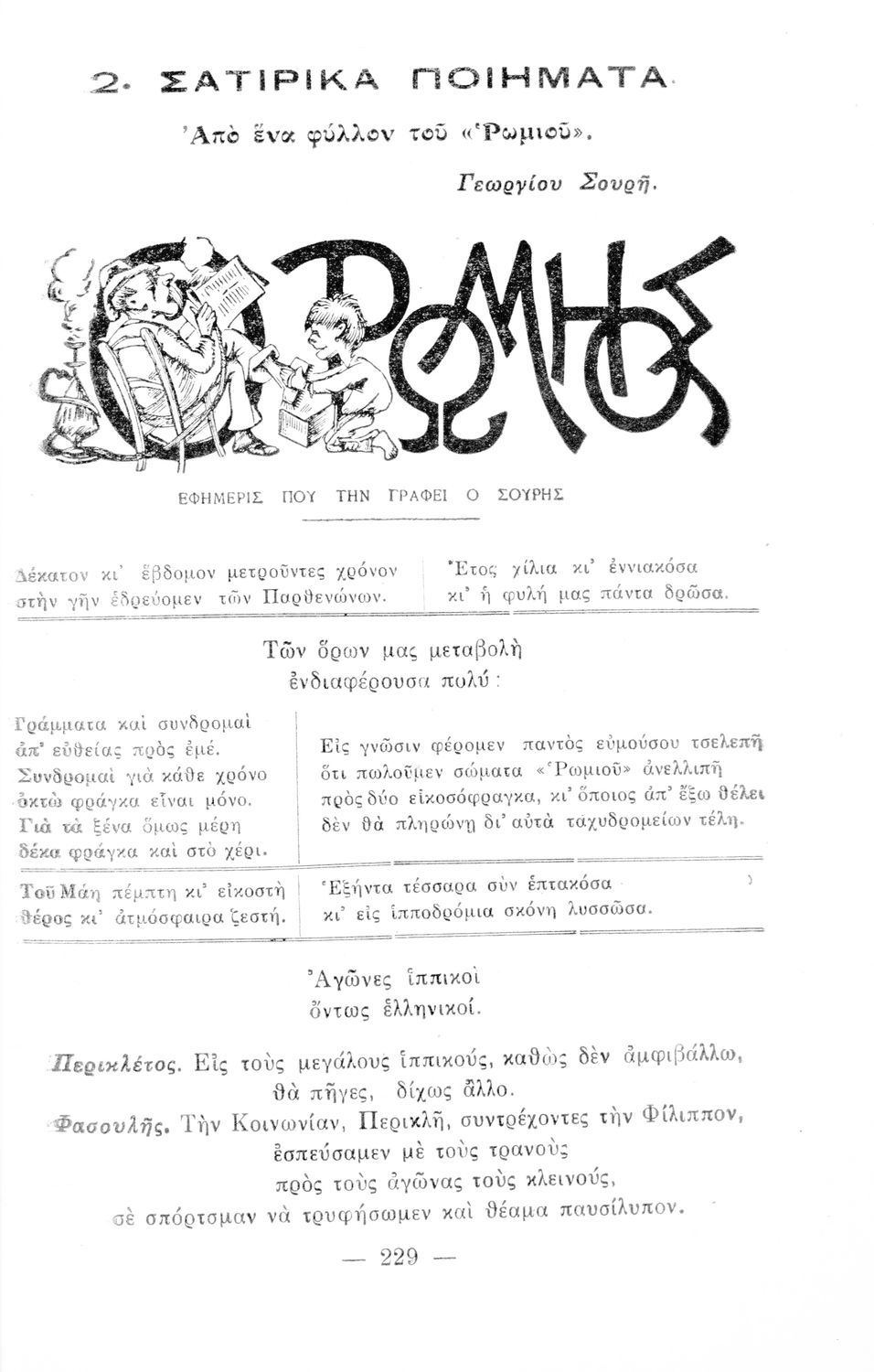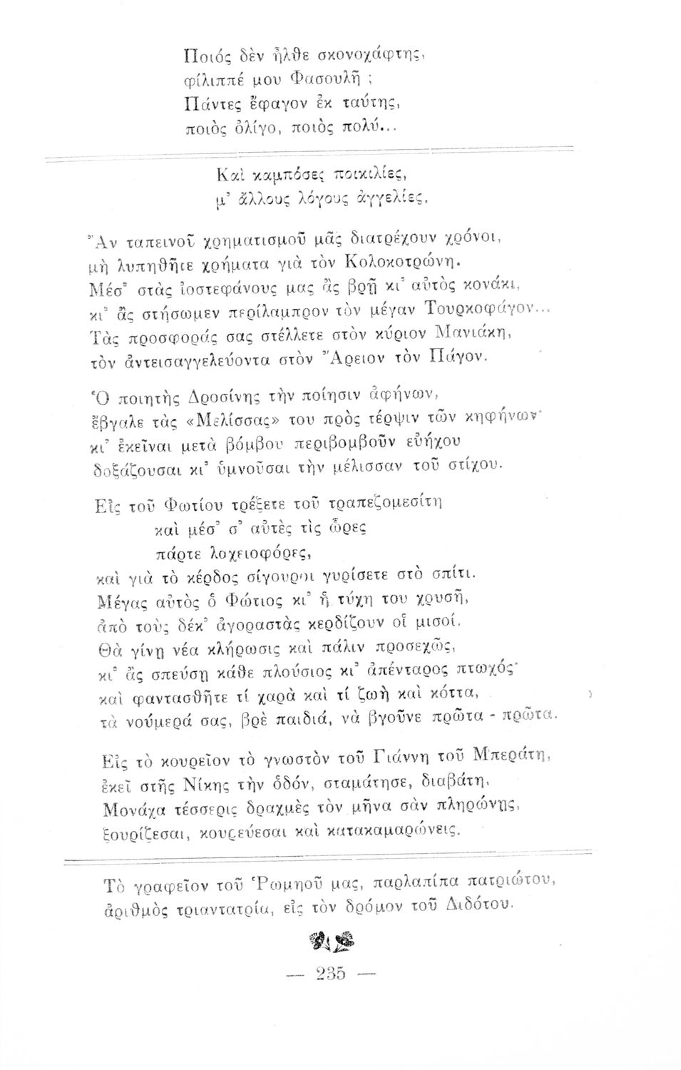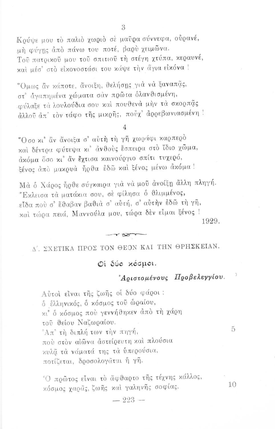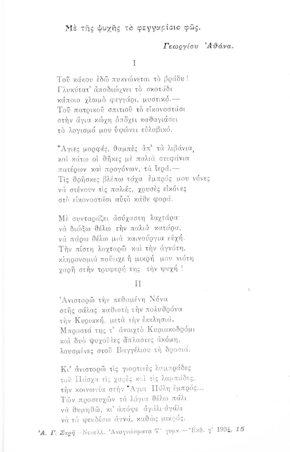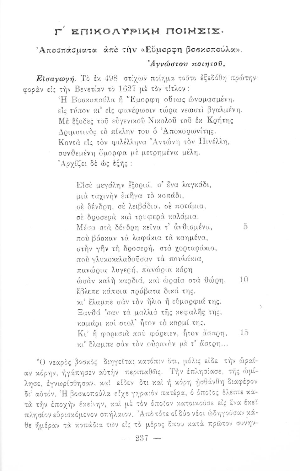 Σχολικό εγχειρίδιο για την Β΄ Γυμνασίου και την Γ΄ Αστικού Θηλέων για το μάθημα των Νέων Ελληνικών. Το εγχειρίδιο αποτελείται από κείμενα πεζού λόγου, επικολυρικά ποιήματα, ωδές, ηθογραφικά διηγήματα, ρητορικά