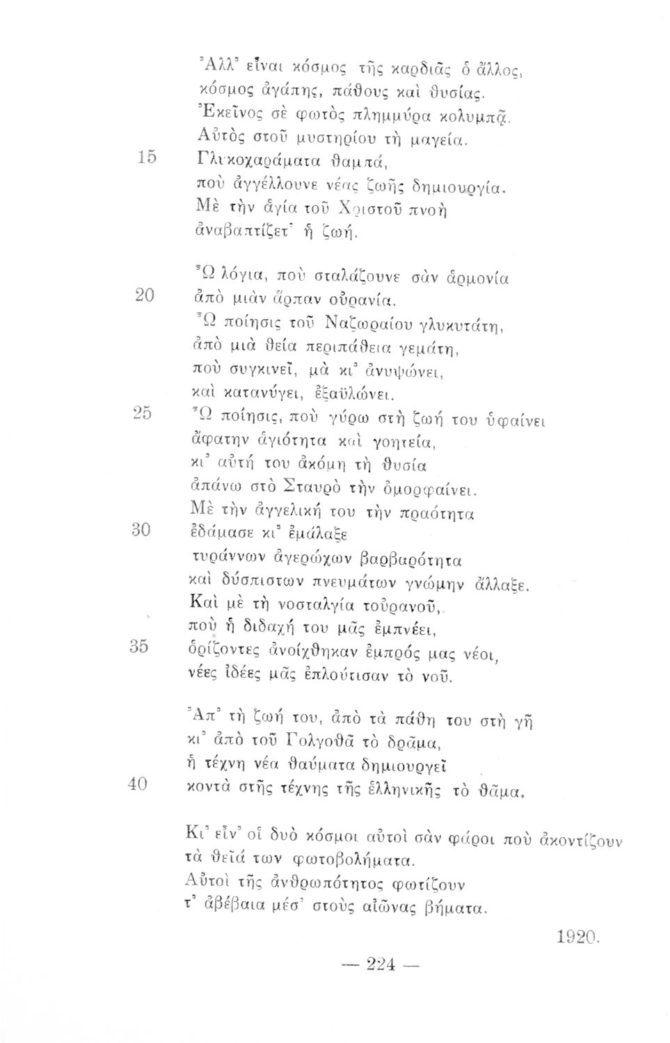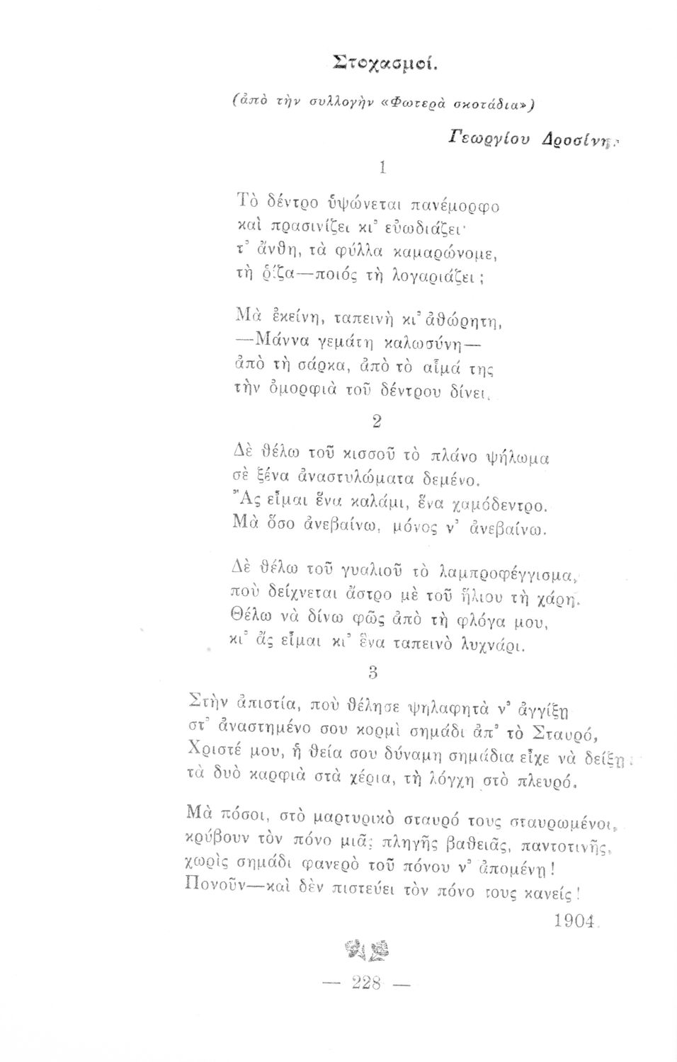 Σχολικό εγχειρίδιο Νέων Ελληνικών ΣΤ΄ Γυμνασίου που περιλαμβάνει ποιήματα και πεζά Ελλήνων συγγραφέων εμπνευσμένα από την σύγχρονη ελληνική ιστορία, τη θρησκευτική παράδοση, την οικογενειακή ζωή, και την ελληνική φύση. Περιέχει και παράρτημα με βιογραφίες και εργογραφίες των δημιουργών και με επεξηγήσεις ορισμών και λέξεων.