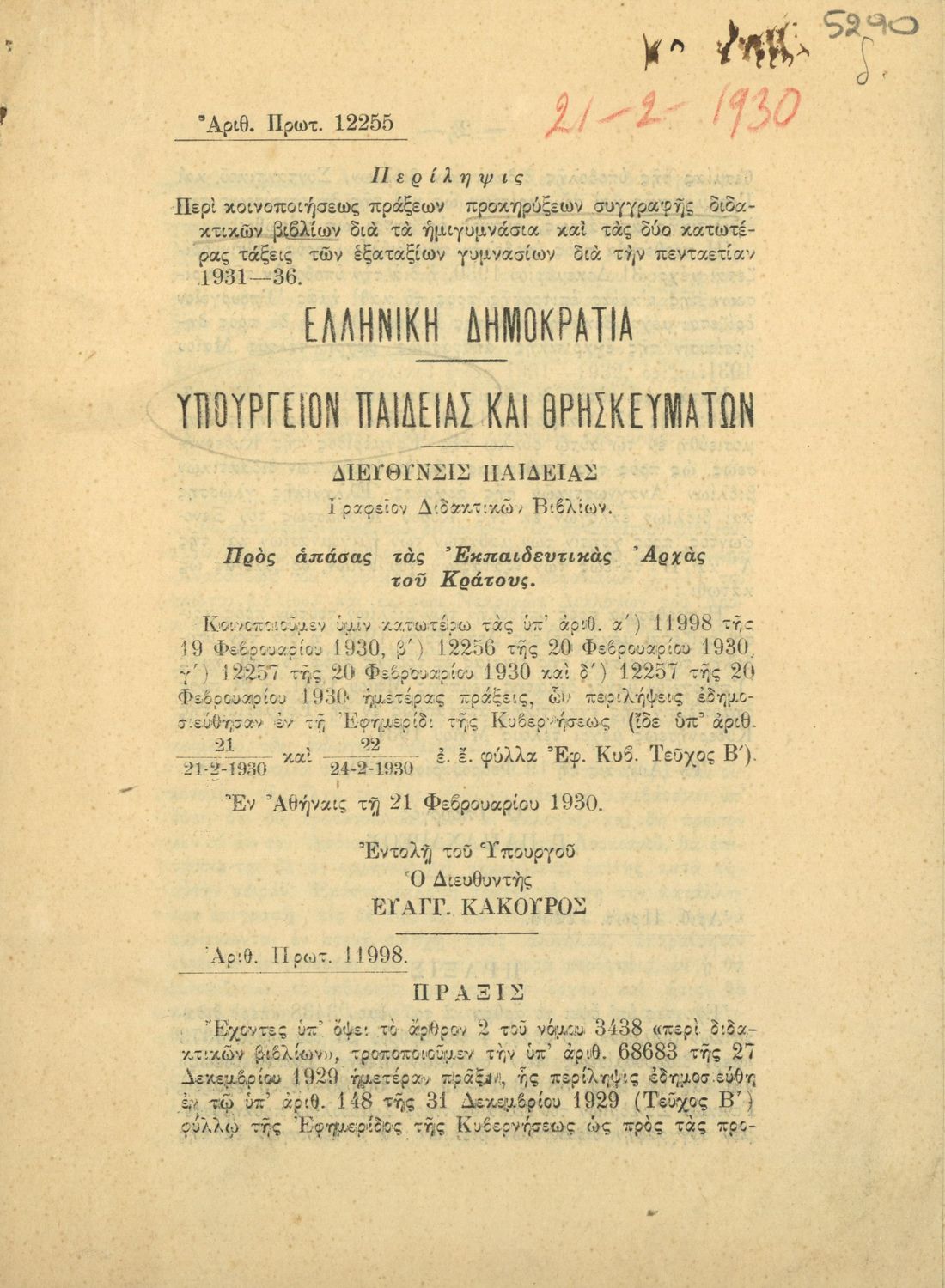 Τίτλος: Περίληψις περί κοινοποιήσεως πράξεων και προκηρύξεων συγγραφής διδακτικών βιβλίων διά τα Ημιγυμνάσια και τας δύο κατωτέρας τάξεις των Εξαταξίων Γυμνασίων διά την πενταετίαν 1931-1936