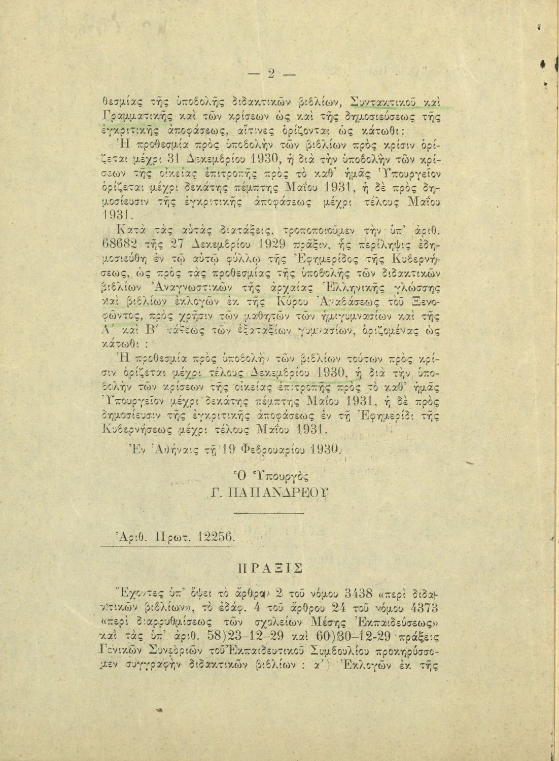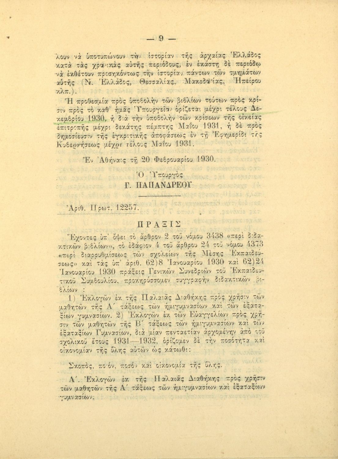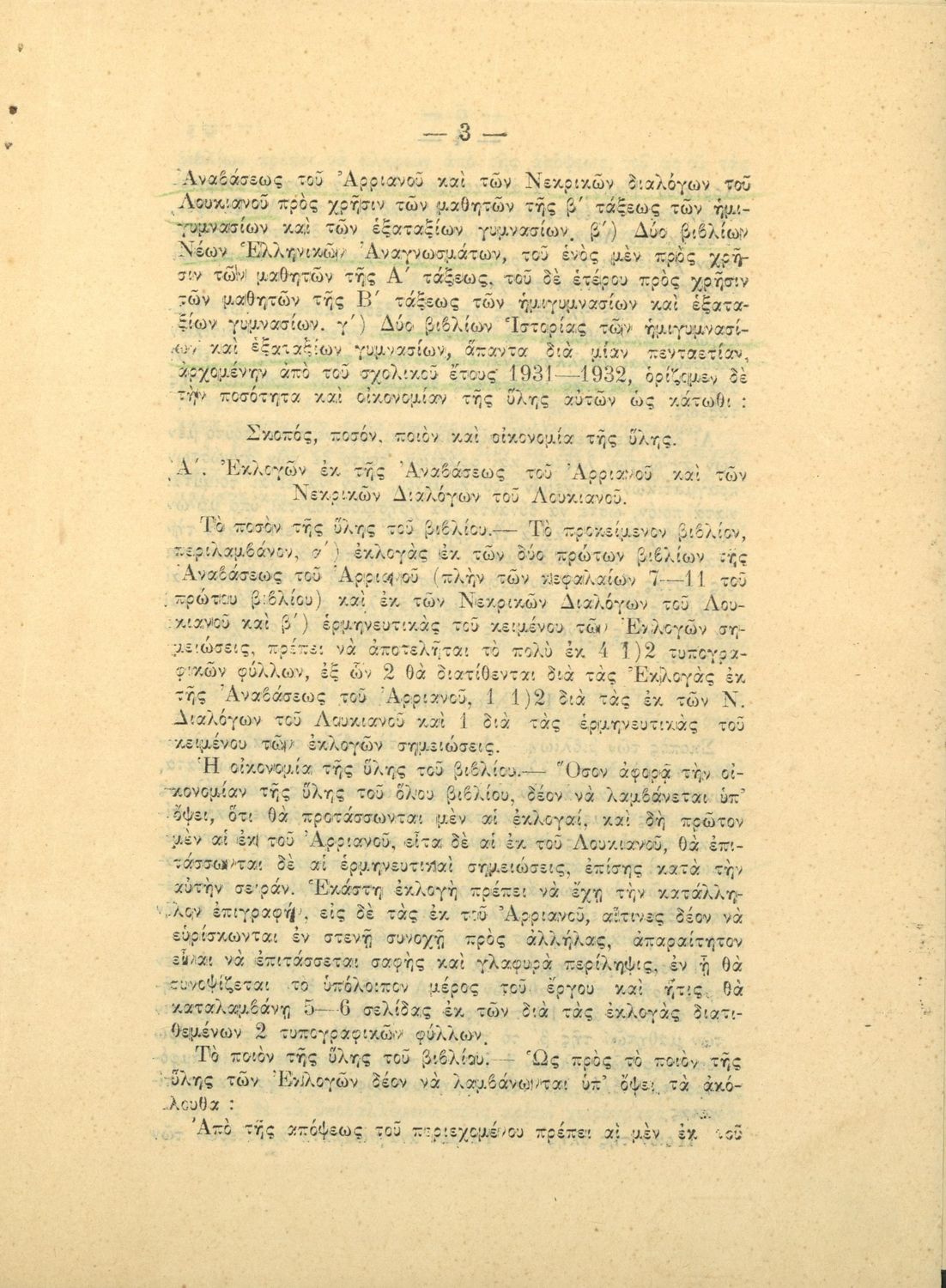 Περίληψις περί κοινοποιήσεως πράξεων και προκηρύξεων συγγραφής διδακτικών βιβλίων διά τα Ημιγυμνάσια και τας δύο κατωτέρας τάξεις των Εξαταξίων Γυμνασίων διά την πενταετίαν 1931-1936