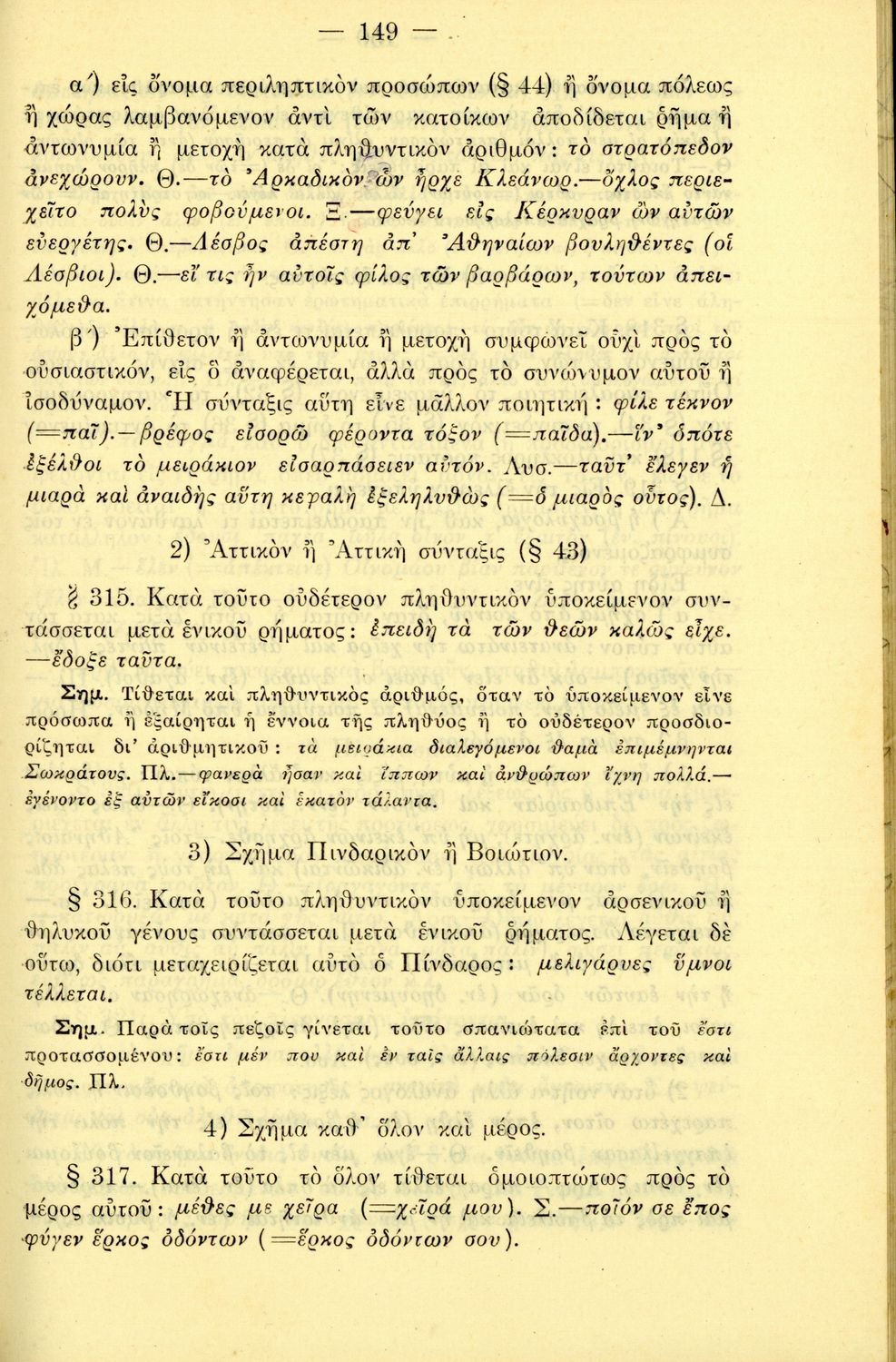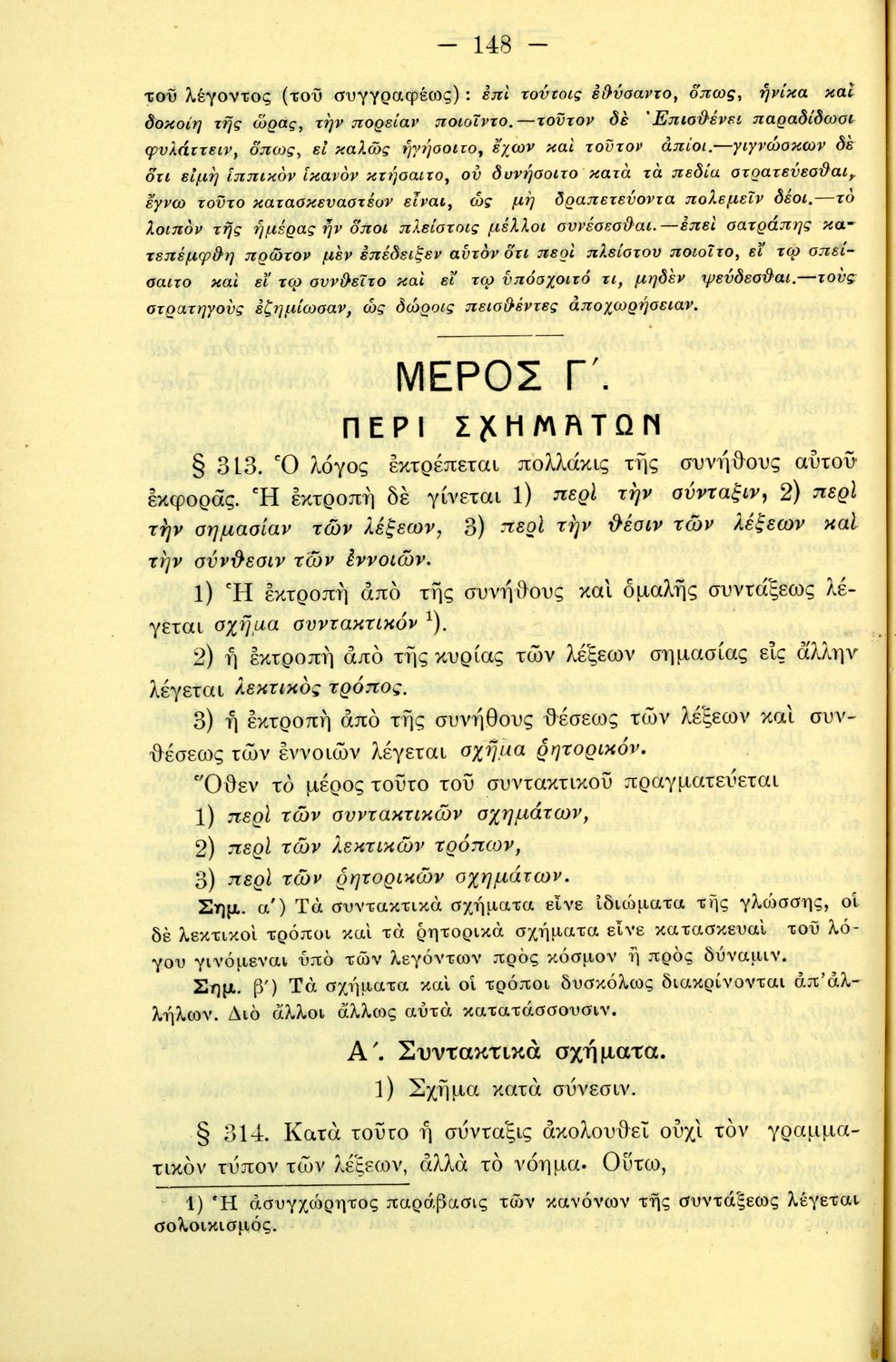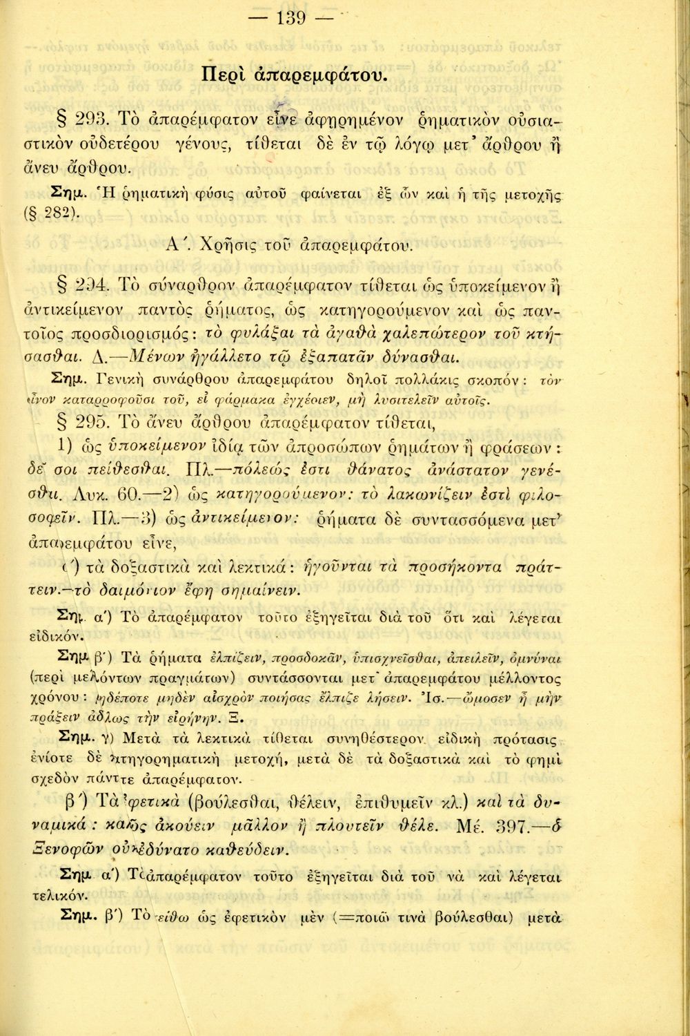 Σχολικό εγχειρίδιο Αρχαίων Ελληνικών για τα Ελληνικά Σχολεία, Παρθεναγωγεία και Γυμνάσια που περιέχει τους κανόνες γραμματικής και είναι χωρισμένο σε φθογγολογικό, τυπολογικό και ετυμολογικό μέρος.