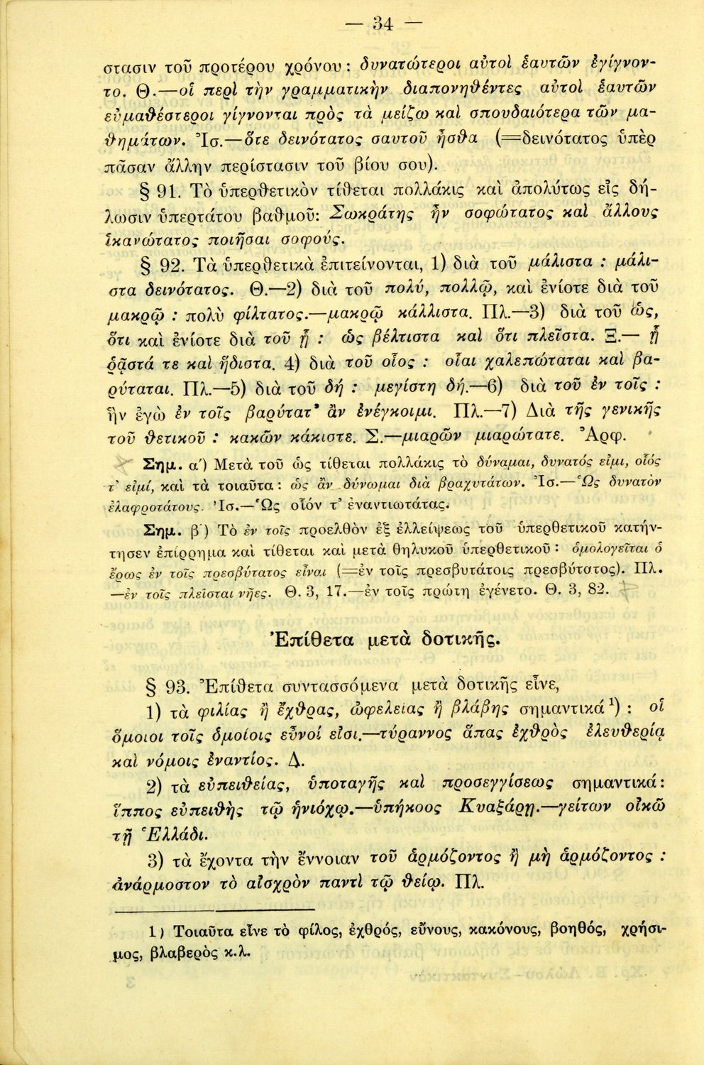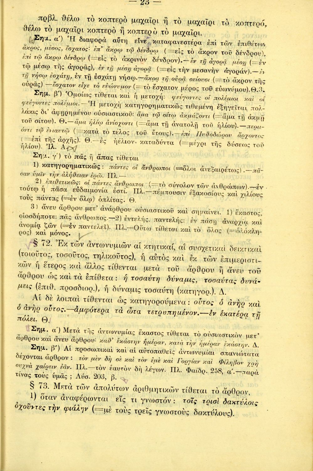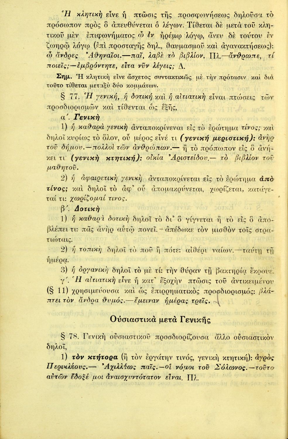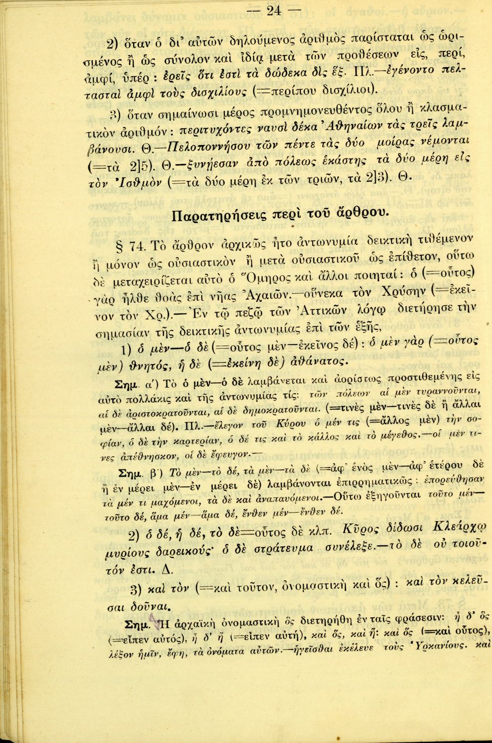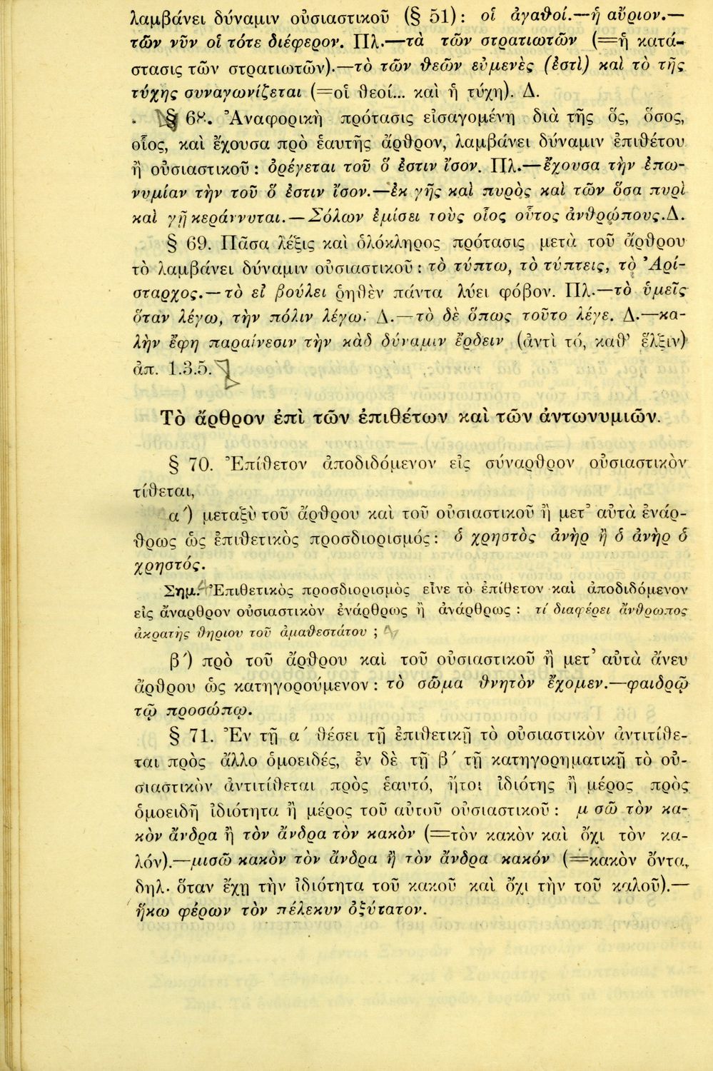 Σχολικό εγχειρίδιο Αρχαίων Ελληνικών για τα Ελληνικά Σχολεία, Παρθεναγωγεία και Γυμνάσια που περιέχει τους κανόνες γραμματικής και είναι χωρισμένο σε φθογγολογικό, τυπολογικό και ετυμολογικό μέρος.