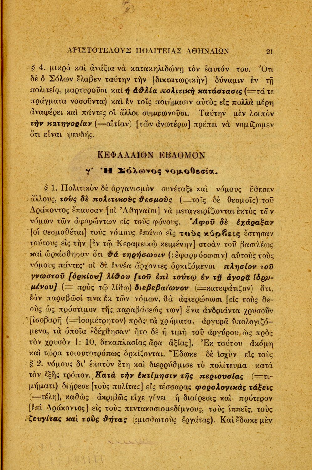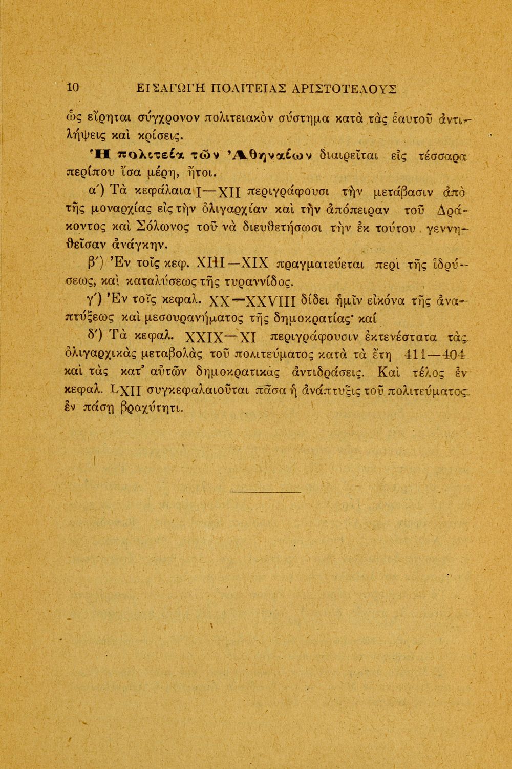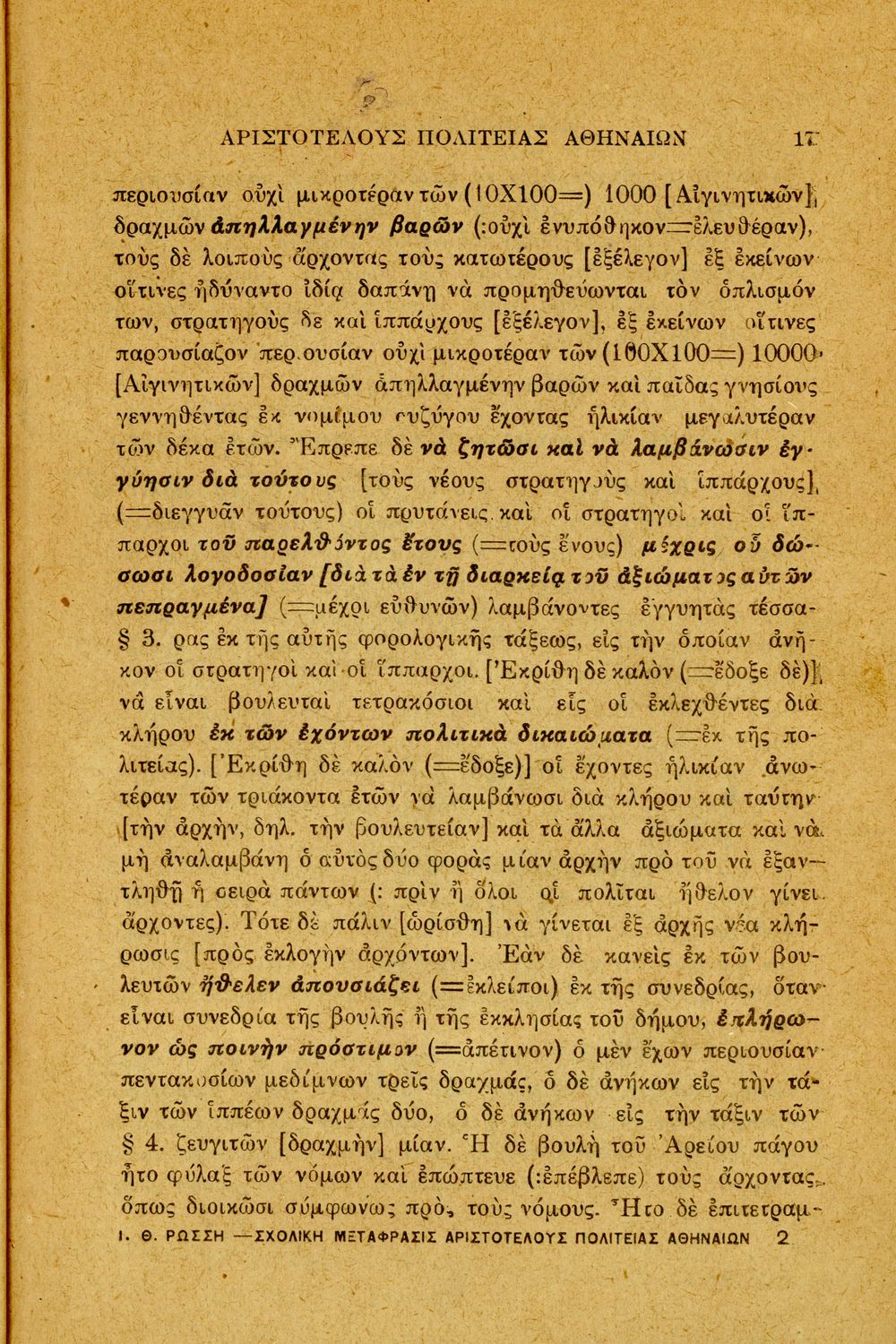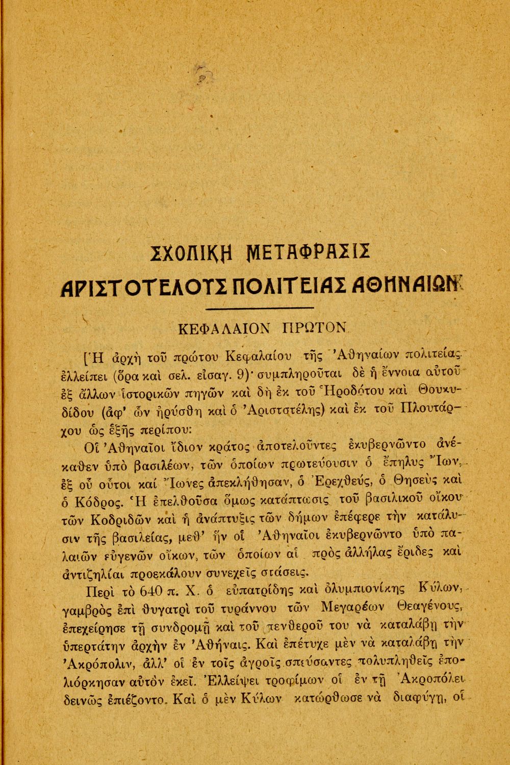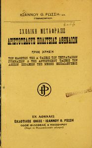 Σχολική μετάφρασις Αριστοτέλους Πολιτείας Αθηναίων προς χρήσιν των μαθητών της πρώτης τάξεως των Τετραταξίων Γυμνασίων και της αντιστοίχου τάξεως των λοιπών σχολείων της Μ. Εκπαιδεύσεως