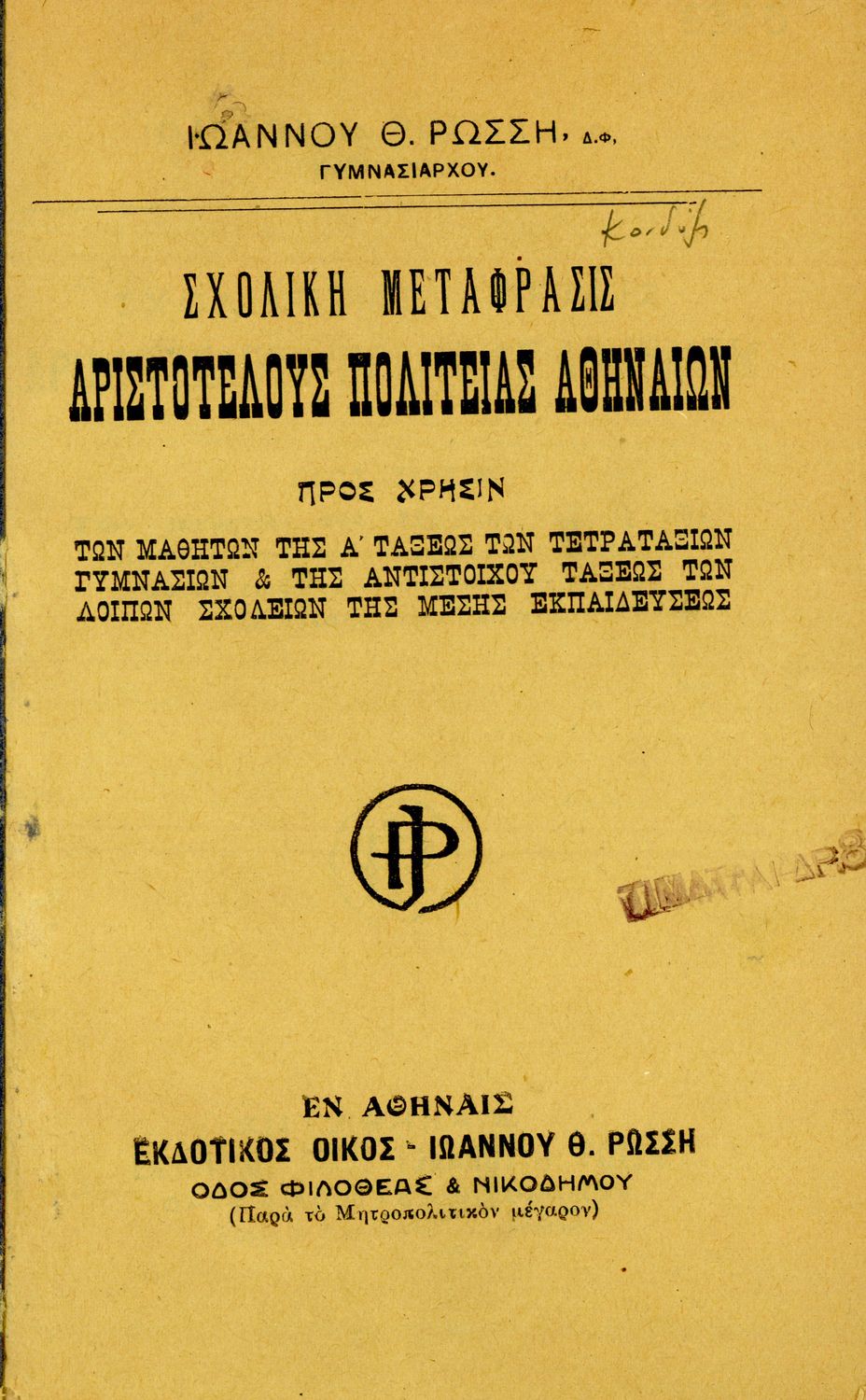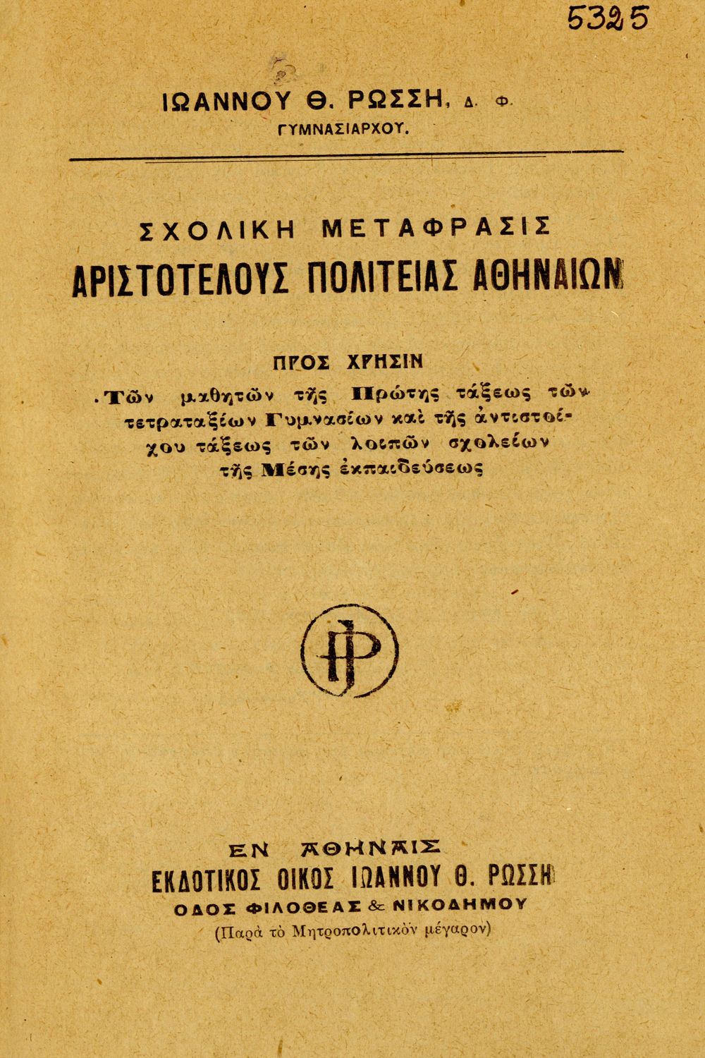 Τίτλος: Σχολική μετάφρασις Αριστοτέλους Πολιτείας Αθηναίων προς χρήσιν των μαθητών της πρώτης τάξεως των Τετραταξίων Γυμνασίων και της αντιστοίχου τάξεως των λοιπών σχολείων της Μ. Εκπαιδεύσεως