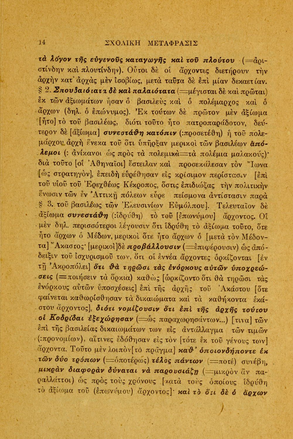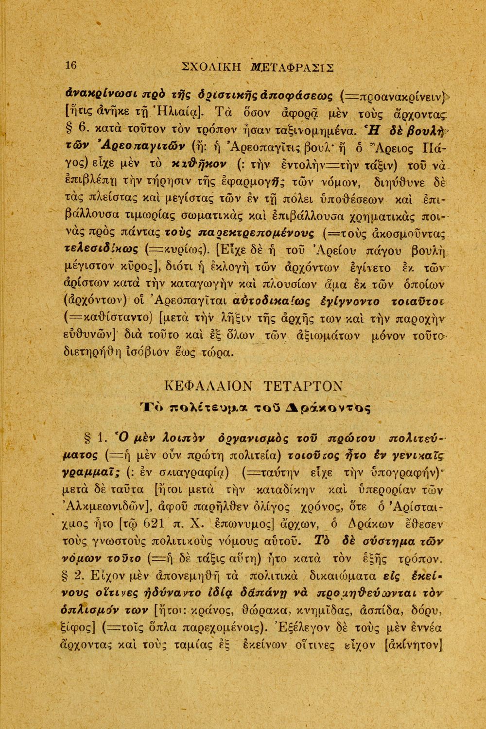 Μαθητικό βοήθημα Αρχαίων Ελληνικών που περιλαμβάνει εισαγωγή στην Αθηναίων Πολιτεία του Αριστοτέλη και μετάφραση.