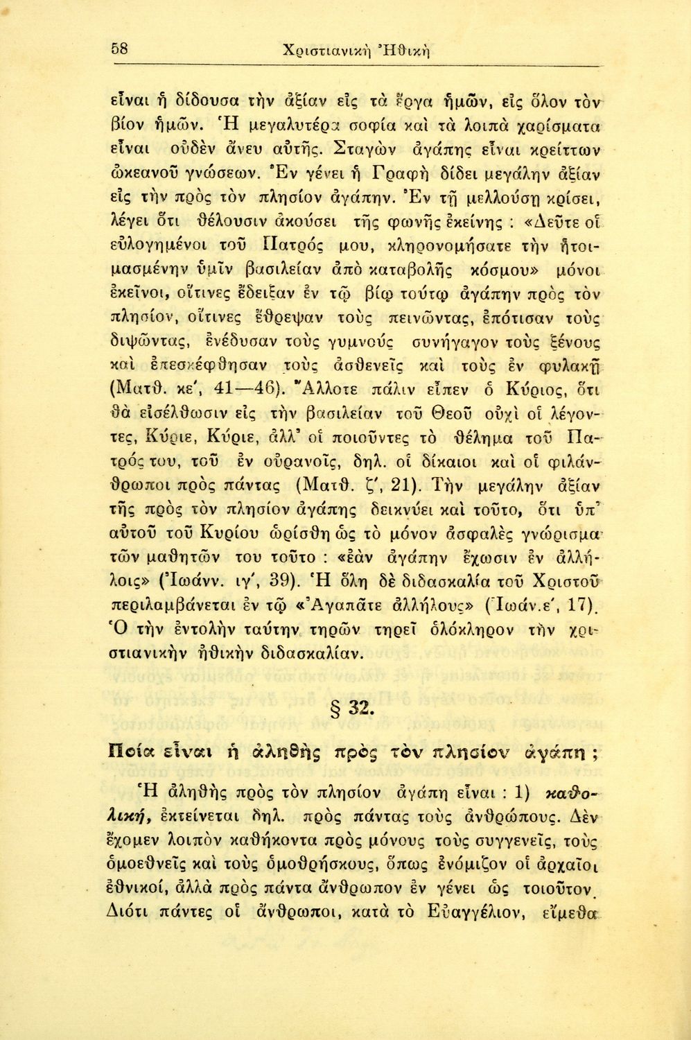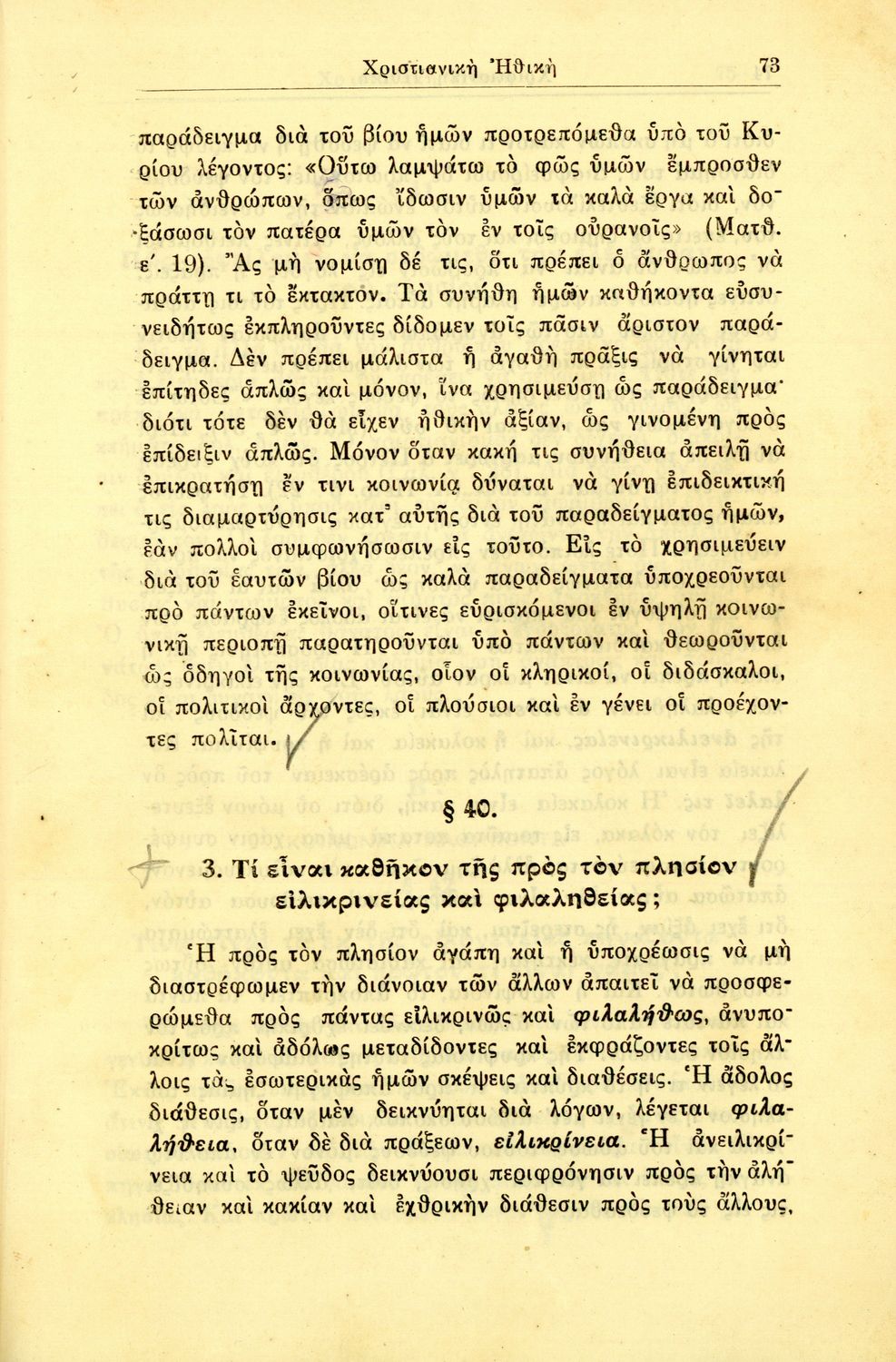 Βαθμίδα εκπαίδευσης: Δευτεροβάθμια Τάξη: Γυμνάσιο Μάθημα: Θρησκευτικά Γλώσσα: Καθαρεύουσα Παρουσίαση περιεχομένου: Σχολικό εγχειρίδιο Θρησκευτικών για τα Γυμνάσια που εστιάζει στη χριστιανική ηθική και αναλύει τα καθήκοντα του ανθρώπου προς τον Θεό, τους άλλους ανθρώπους και τον εαυτό του. |