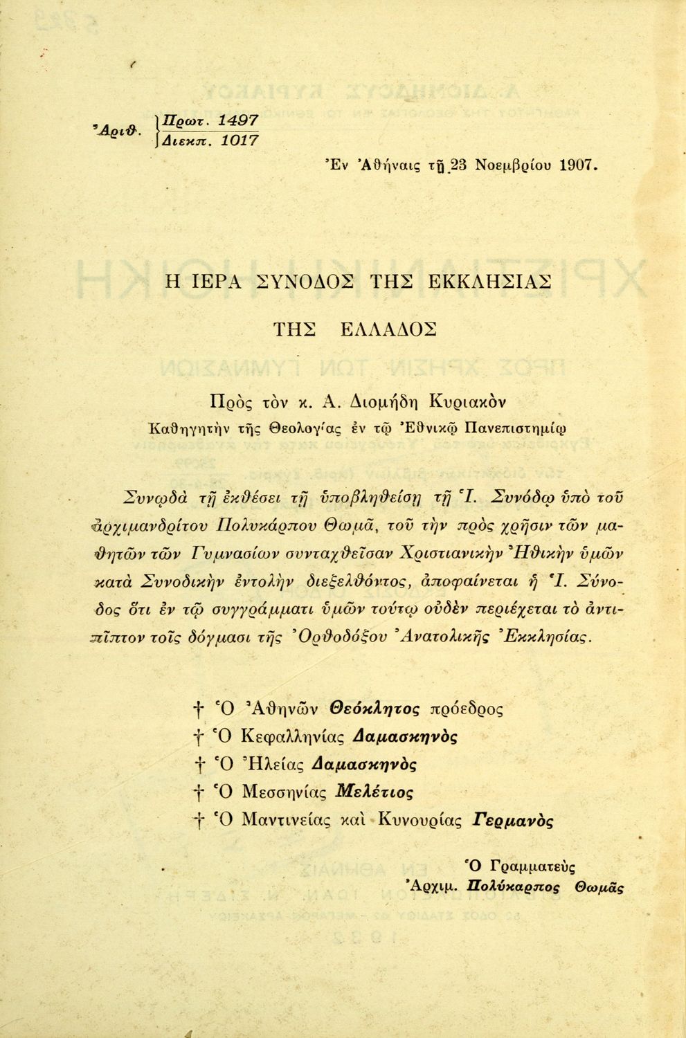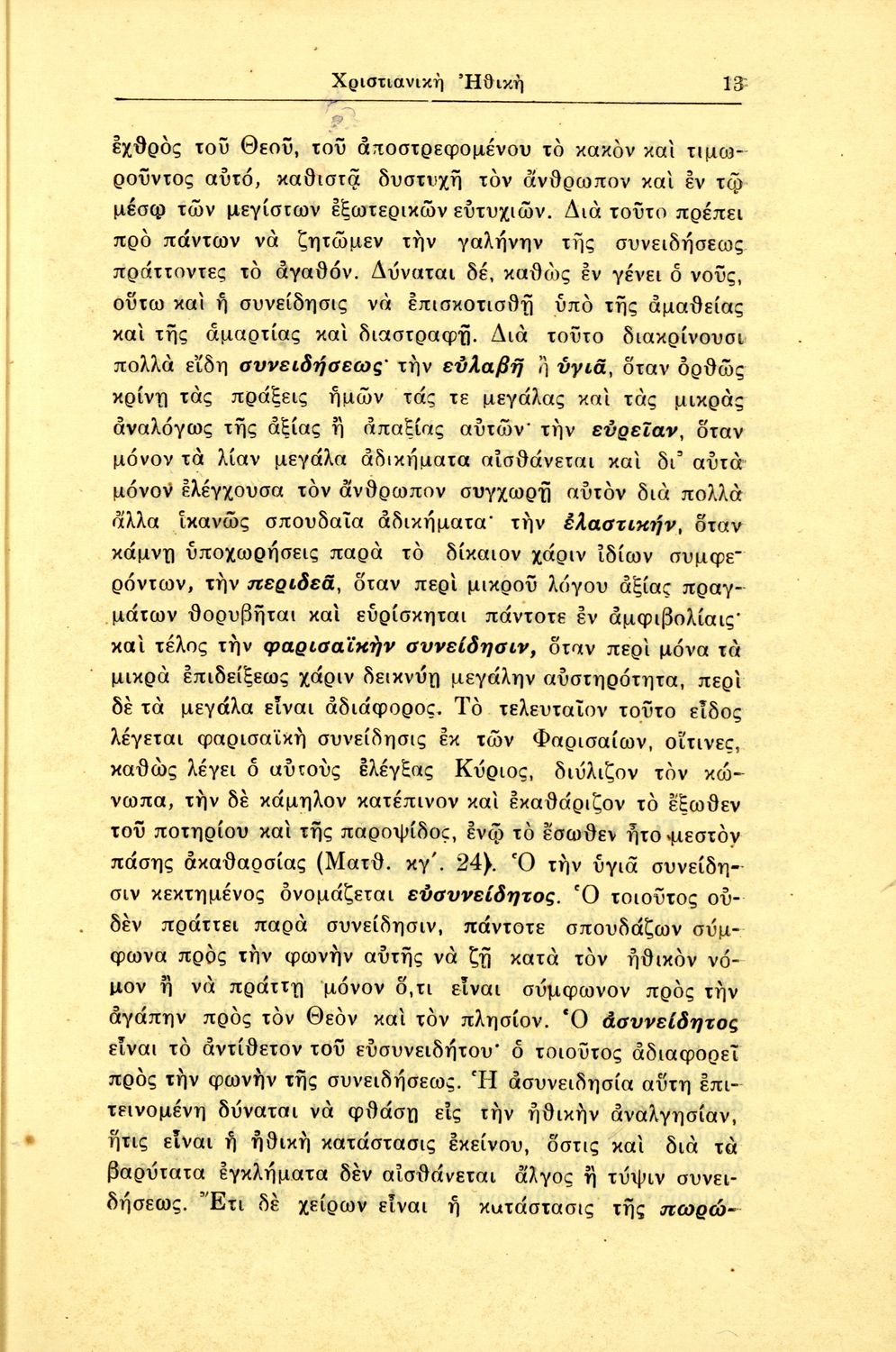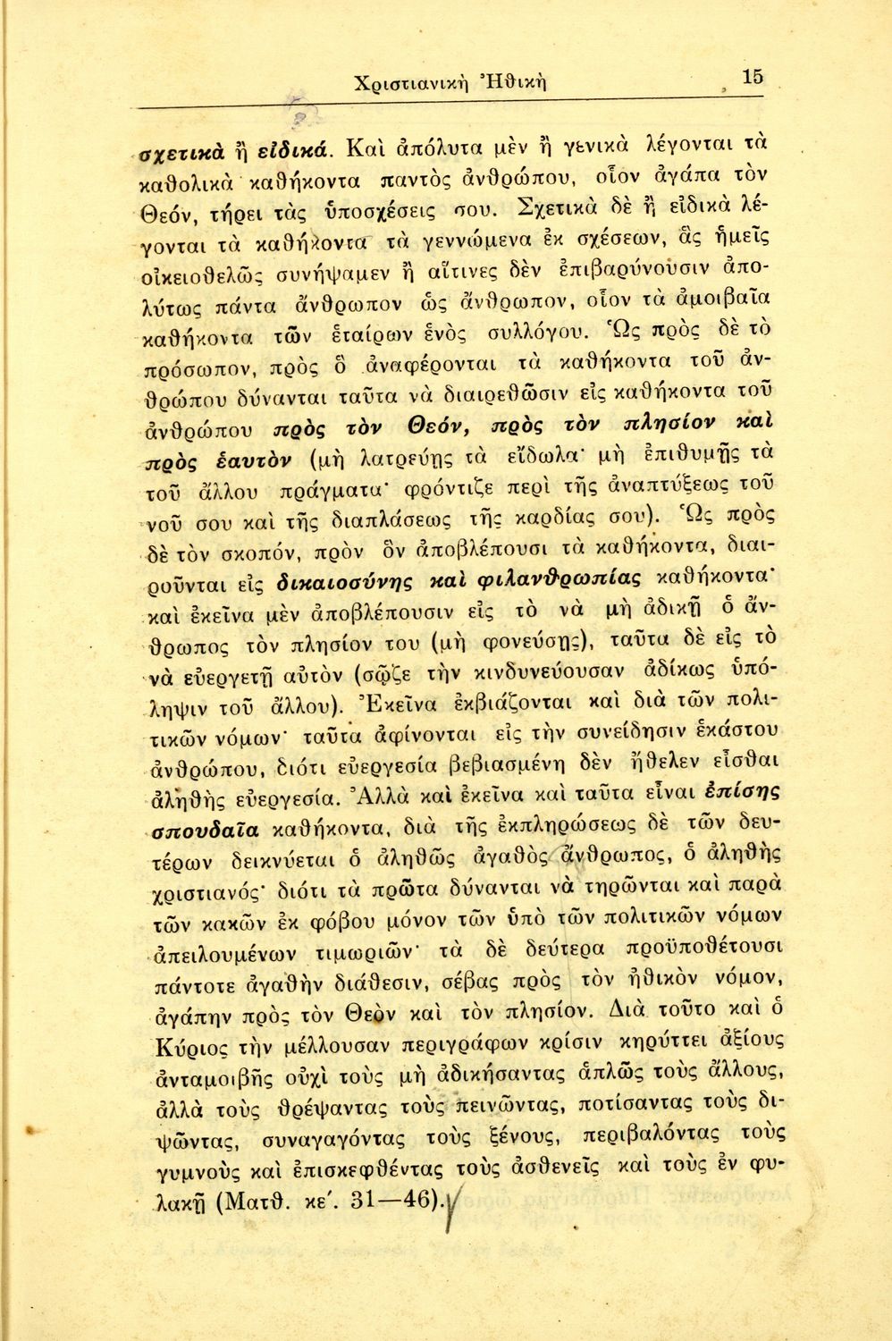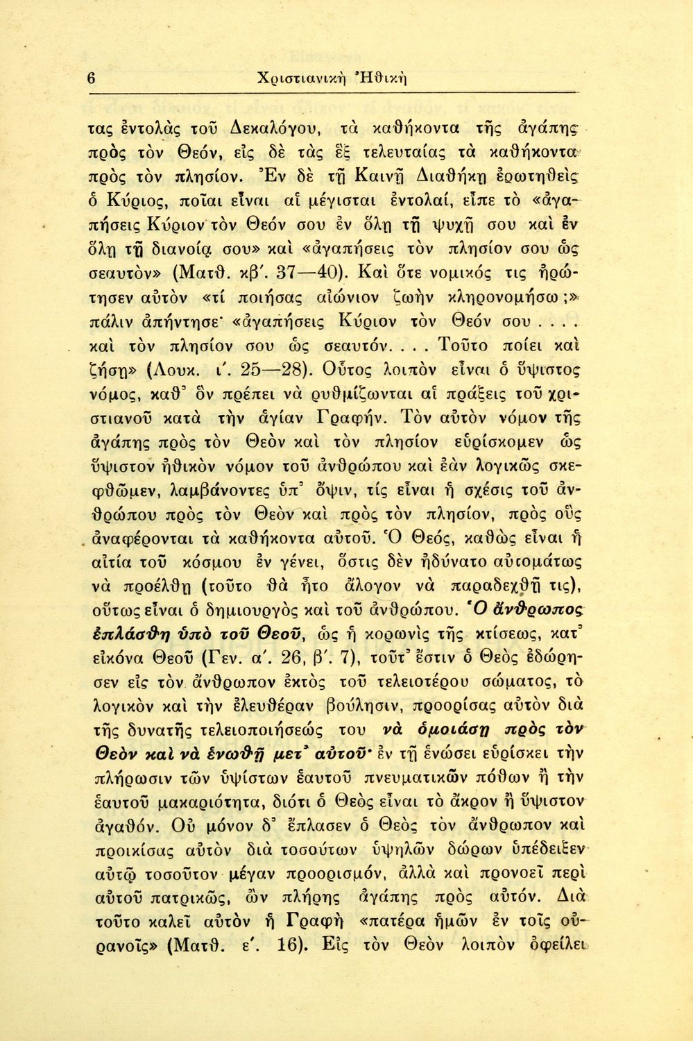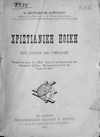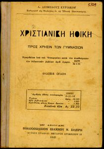 Βαθμίδα εκπαίδευσης: Δευτεροβάθμια Τάξη: Γυμνάσιο Μάθημα: Θρησκευτικά Γλώσσα: Καθαρεύουσα Παρουσίαση περιεχομένου: Σχολικό εγχειρίδιο Θρησκευτικών για τα Γυμνάσια που εστιάζει στη χριστιανική ηθική και αναλύει τα καθήκοντα του ανθρώπου προς τον Θεό, τους άλλους ανθρώπους και τον εαυτό του. |