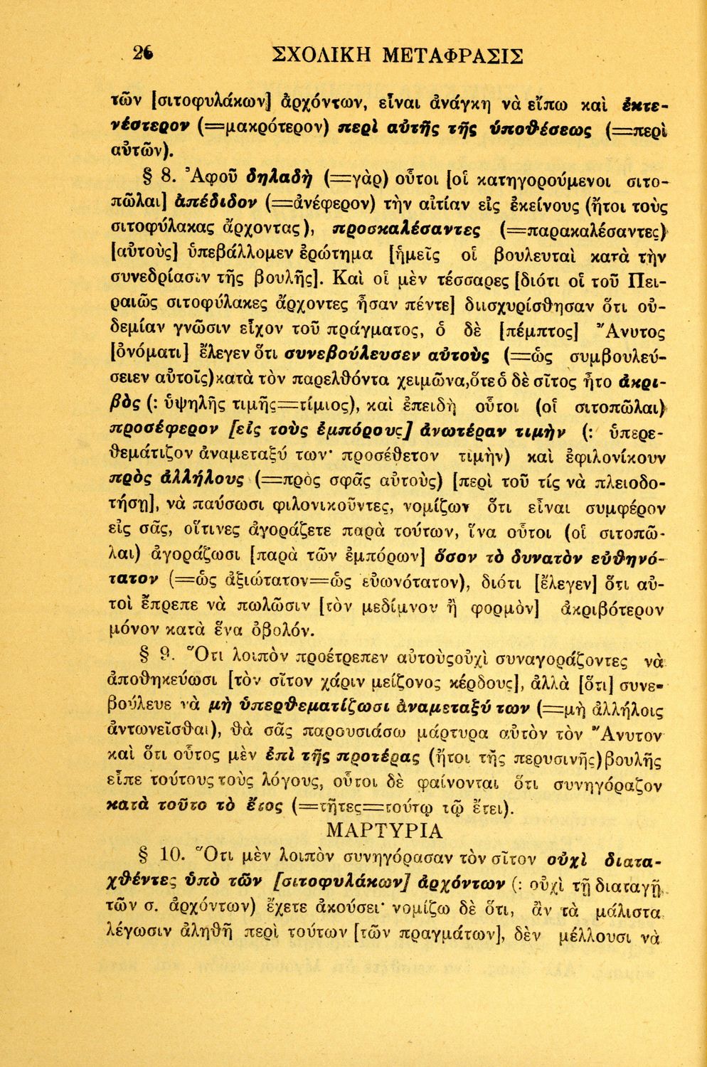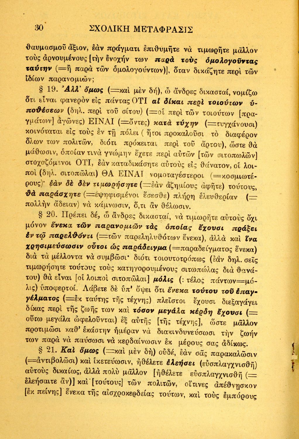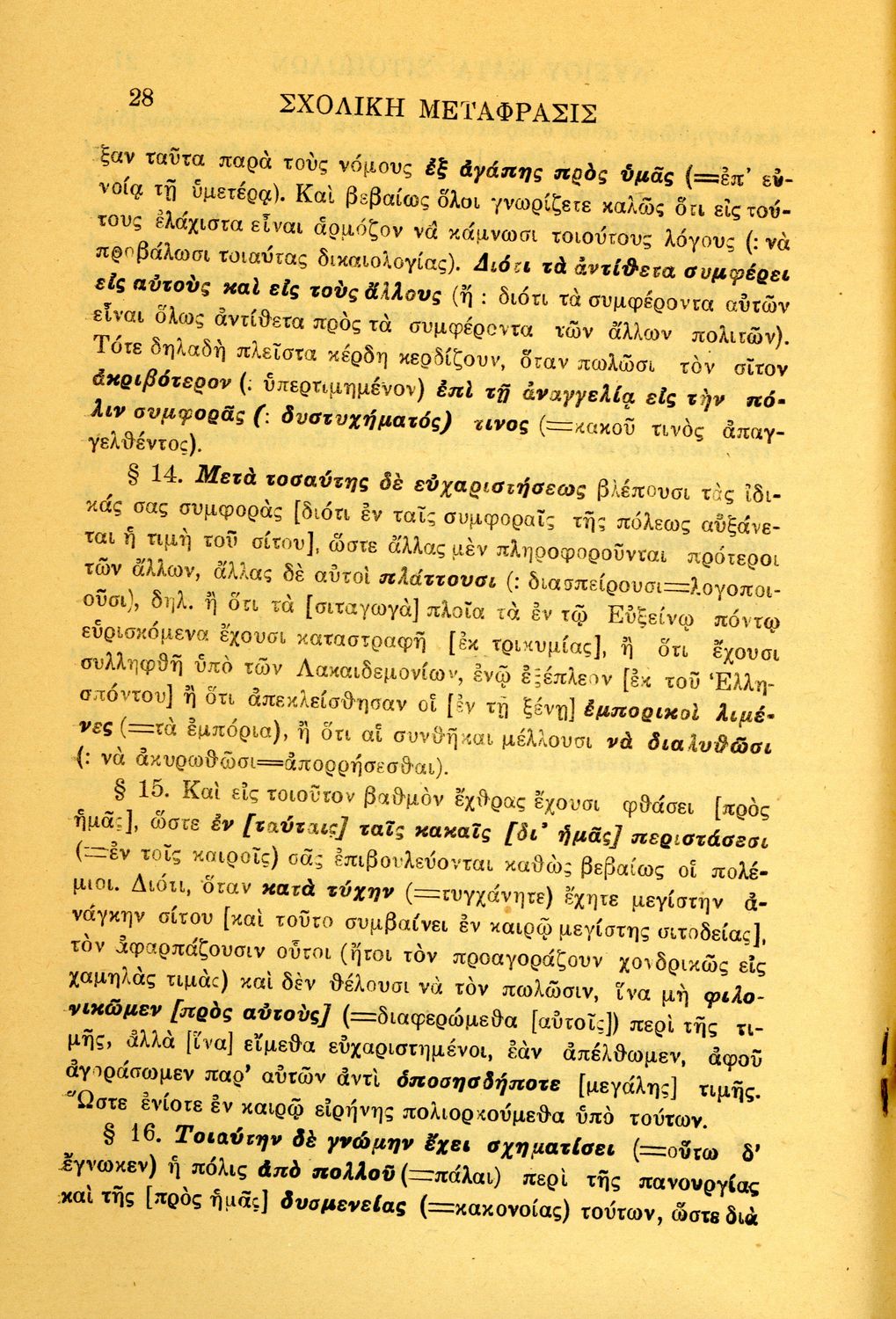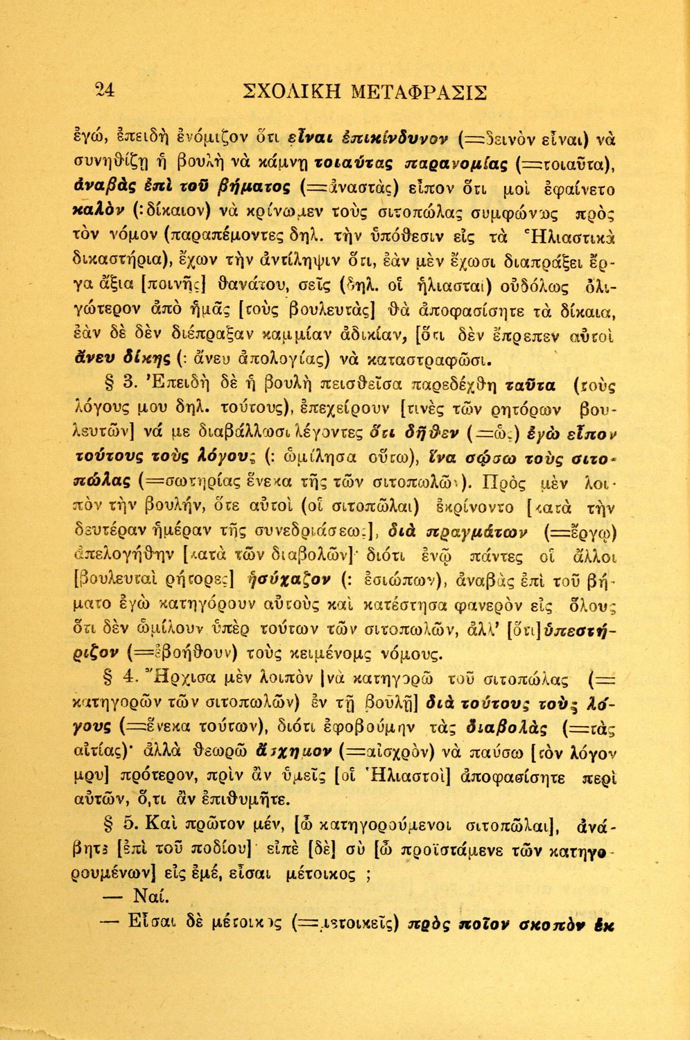 Μαθητικό βοήθημα Αρχαίων Ελληνικών της τρίτης τάξης των τετρατάξιων Γυμνασίων. Το βιβλίο περιέχει τα έργα του Δημοσθένη, Περί της ειρήνης και Α΄ Φιλιππικός από μετάφραση.