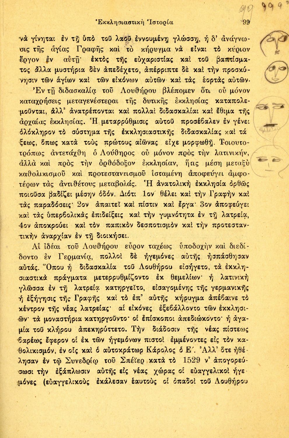 Το σύγγραμμα ήταν σχολικό εγχειρίδιο για το μαθήματα των Θρησκευτικών. Περιγράφει σημαντικά γεγονότα της θρησκευτικής ζωής ξεκινώντας από την Πεντηκοστή. Επίσης, αναφέρεται σε θέματα διοίκησης της εκκλησίας ...