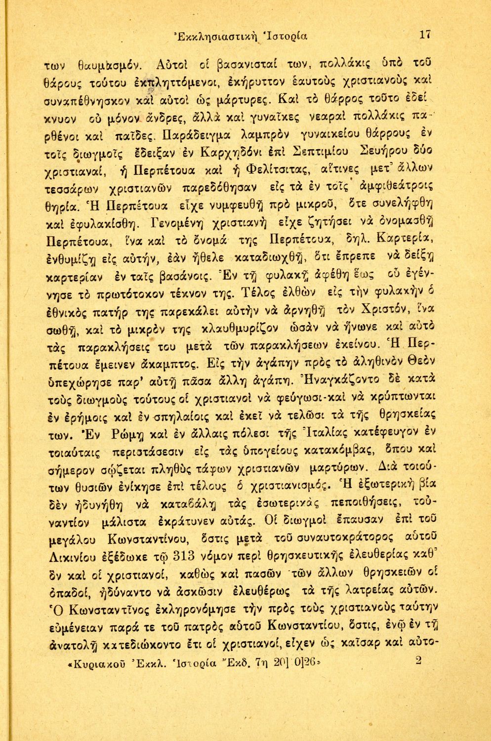 Το σύγγραμμα ήταν σχολικό εγχειρίδιο για το μαθήματα των Θρησκευτικών. Περιγράφει σημαντικά γεγονότα της θρησκευτικής ζωής ξεκινώντας από την Πεντηκοστή. Επίσης, αναφέρεται σε θέματα διοίκησης της εκκλησίας ...