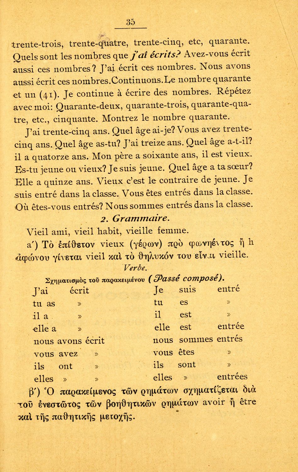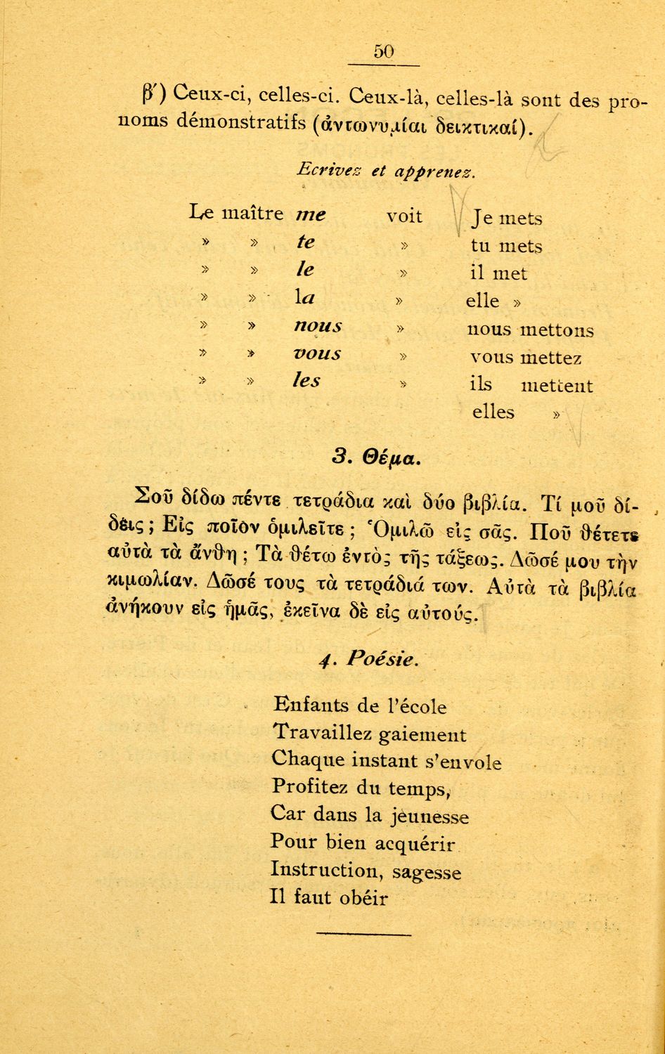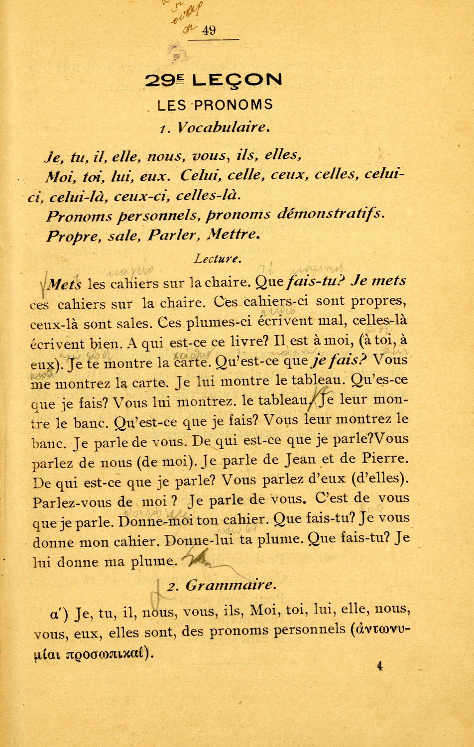 Σχολικό εγχειρίδιο Γαλλικών για τις Β΄ και Γ' Ελληνικού Σχολείου, Αστικού Σχολείου και Παρθεναγωγείου που περιλαμβάνει κείμενα, κανόνες γραμματικής και συντακτικού, και λεξιλογικά και πραγματολογικά σχόλια.