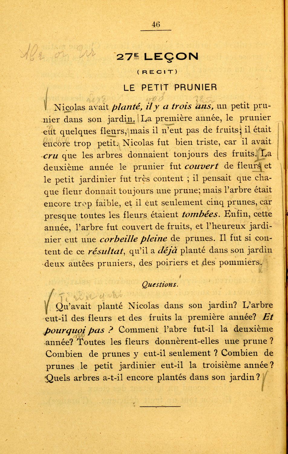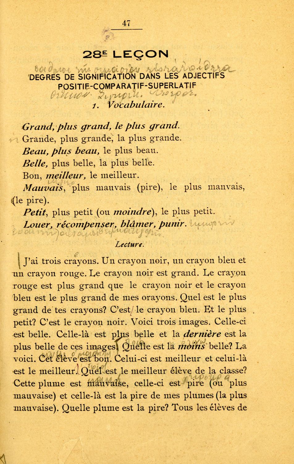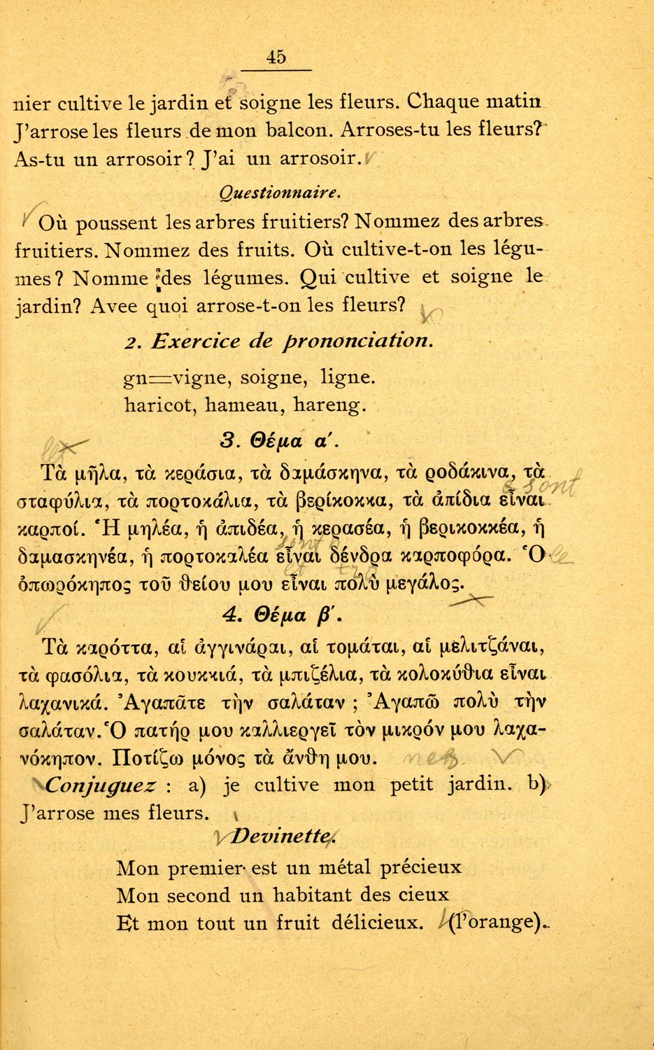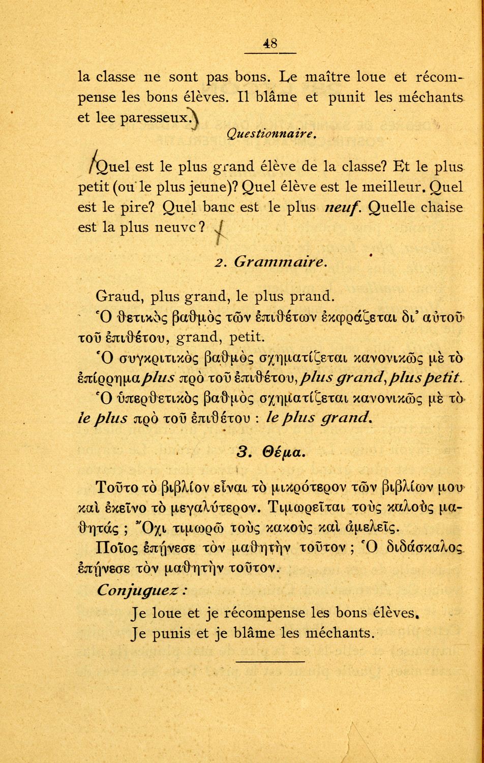Σχολικό εγχειρίδιο Γαλλικών για τις Β΄ και Γ' Ελληνικού Σχολείου, Αστικού Σχολείου και Παρθεναγωγείου που περιλαμβάνει κείμενα, κανόνες γραμματικής και συντακτικού, και λεξιλογικά και πραγματολογικά σχόλια.