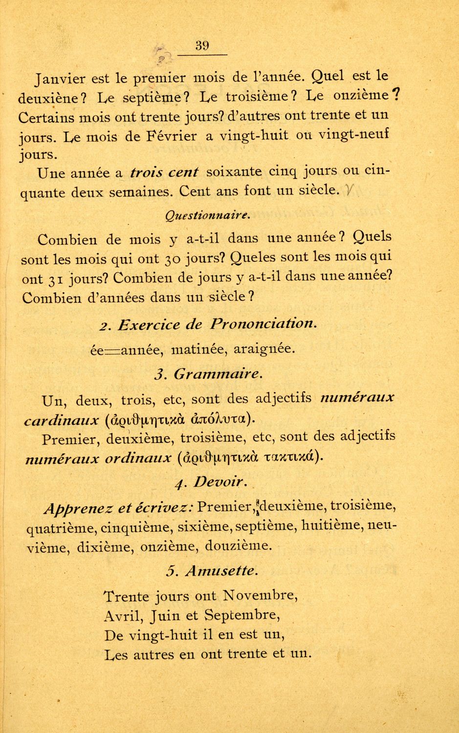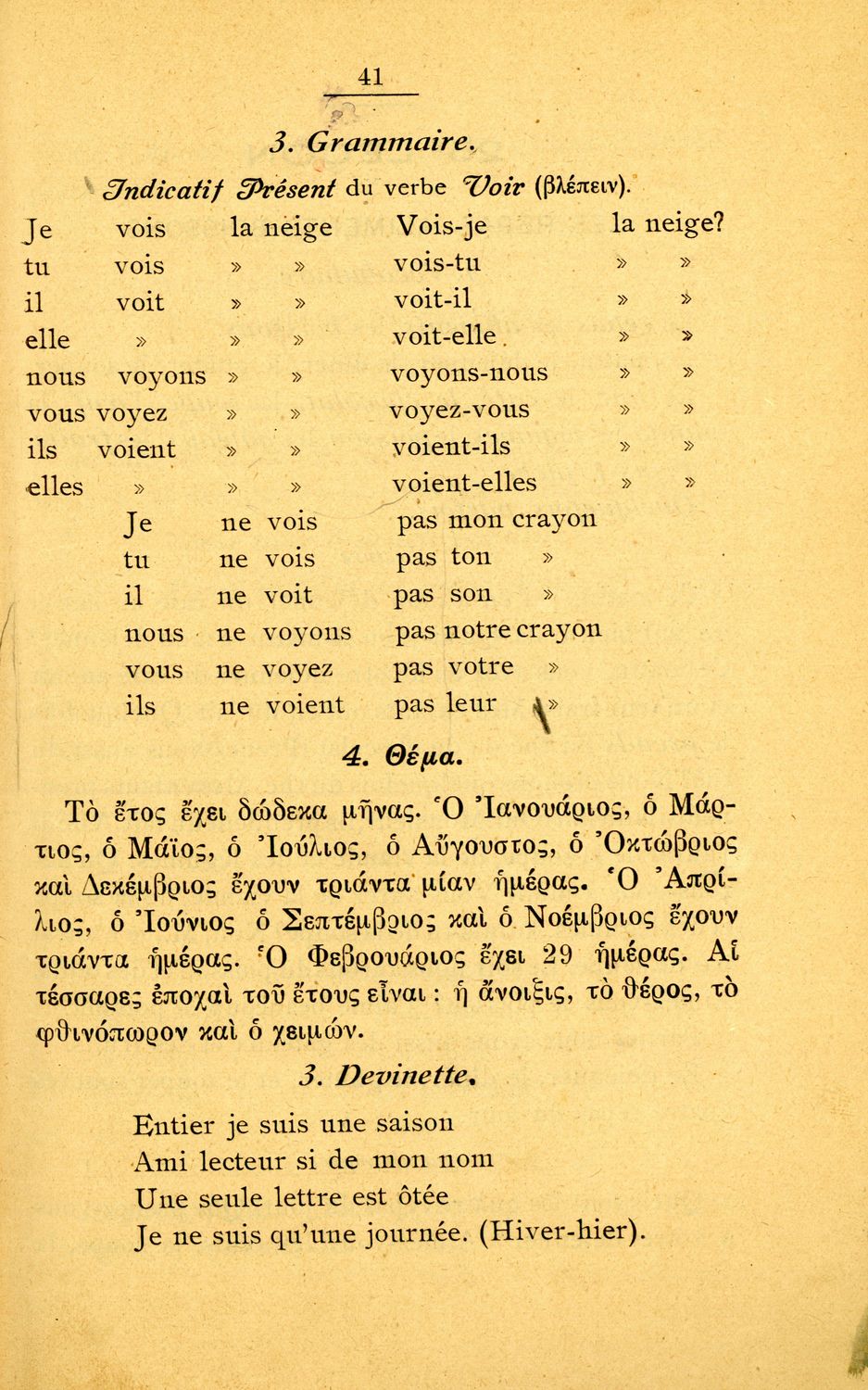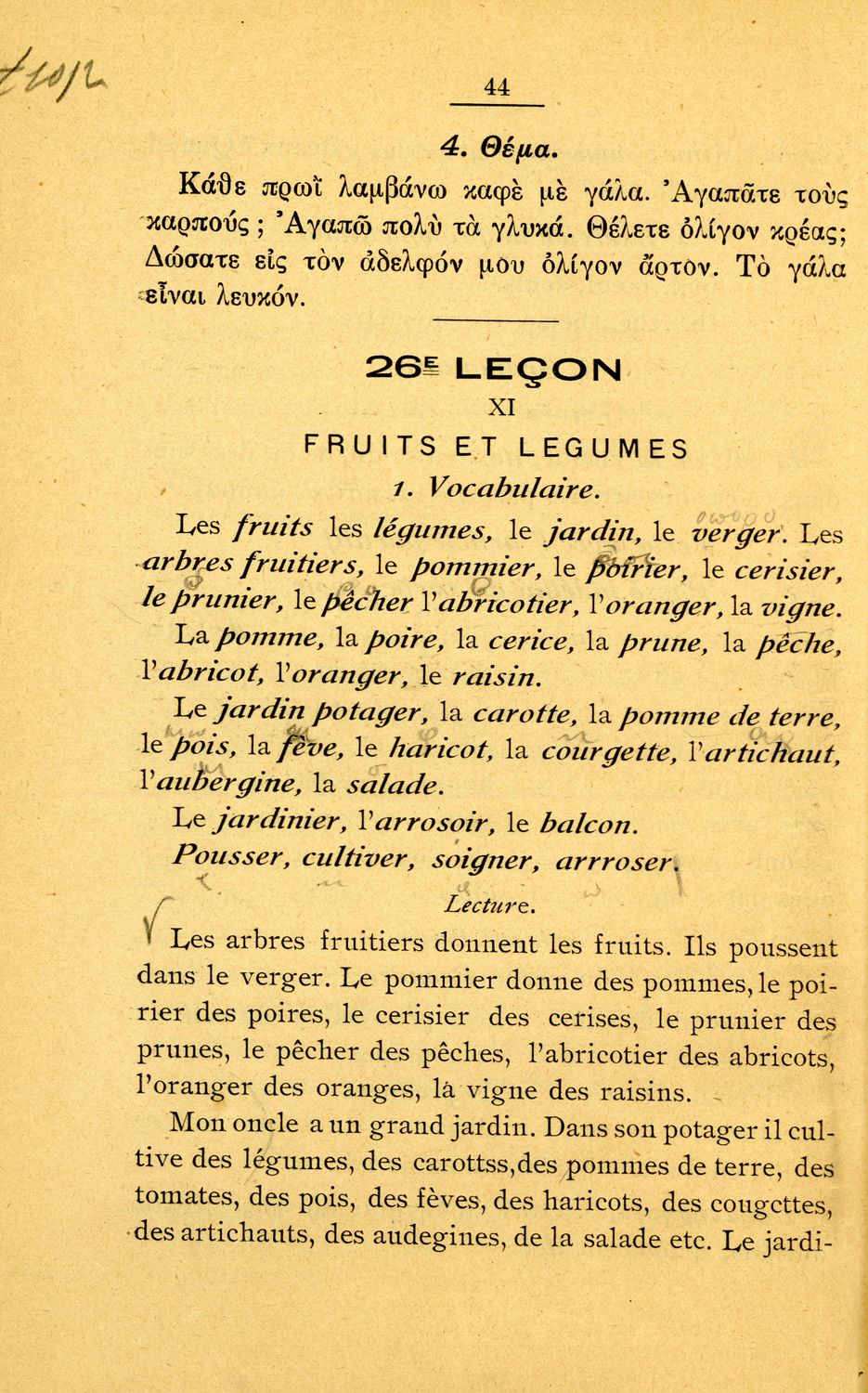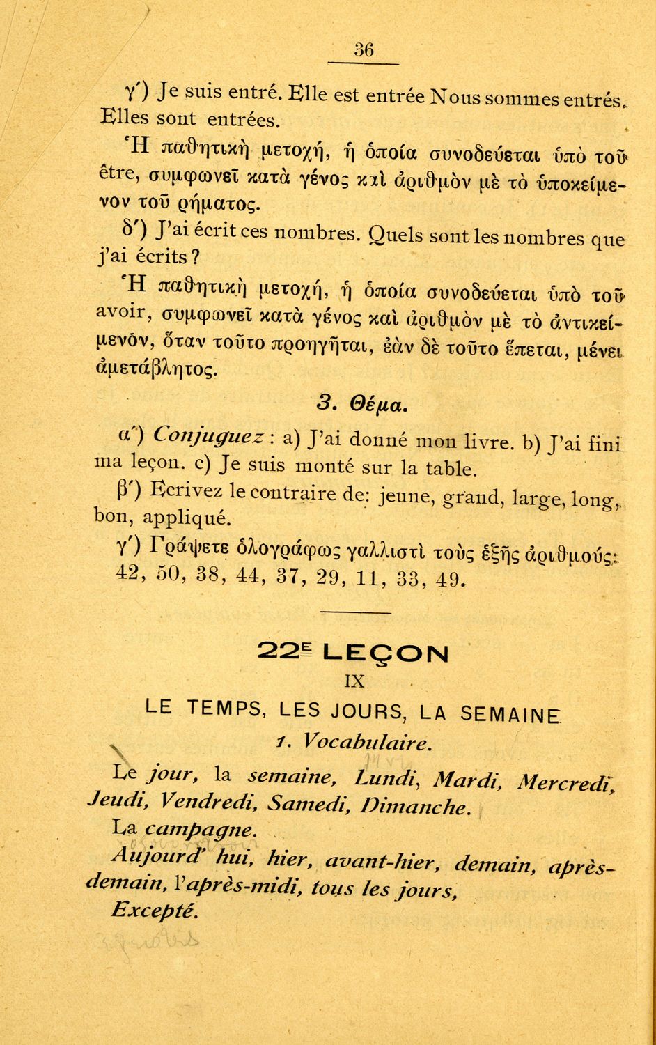 Σχολικό εγχειρίδιο Γαλλικών για τη Β' Ελληνικού Σχολείου, και τα Αστικά Σχολεία και Παρθεναγωγεία που περιλαμβάνει τους βασικούς κανόνες διδασκαλίας της γαλλικής γλώσσας, κανόνες τονισμού, γραμματικής και συντακτικού, το γαλλικό αλφάβητο και λεξιλόγιο.