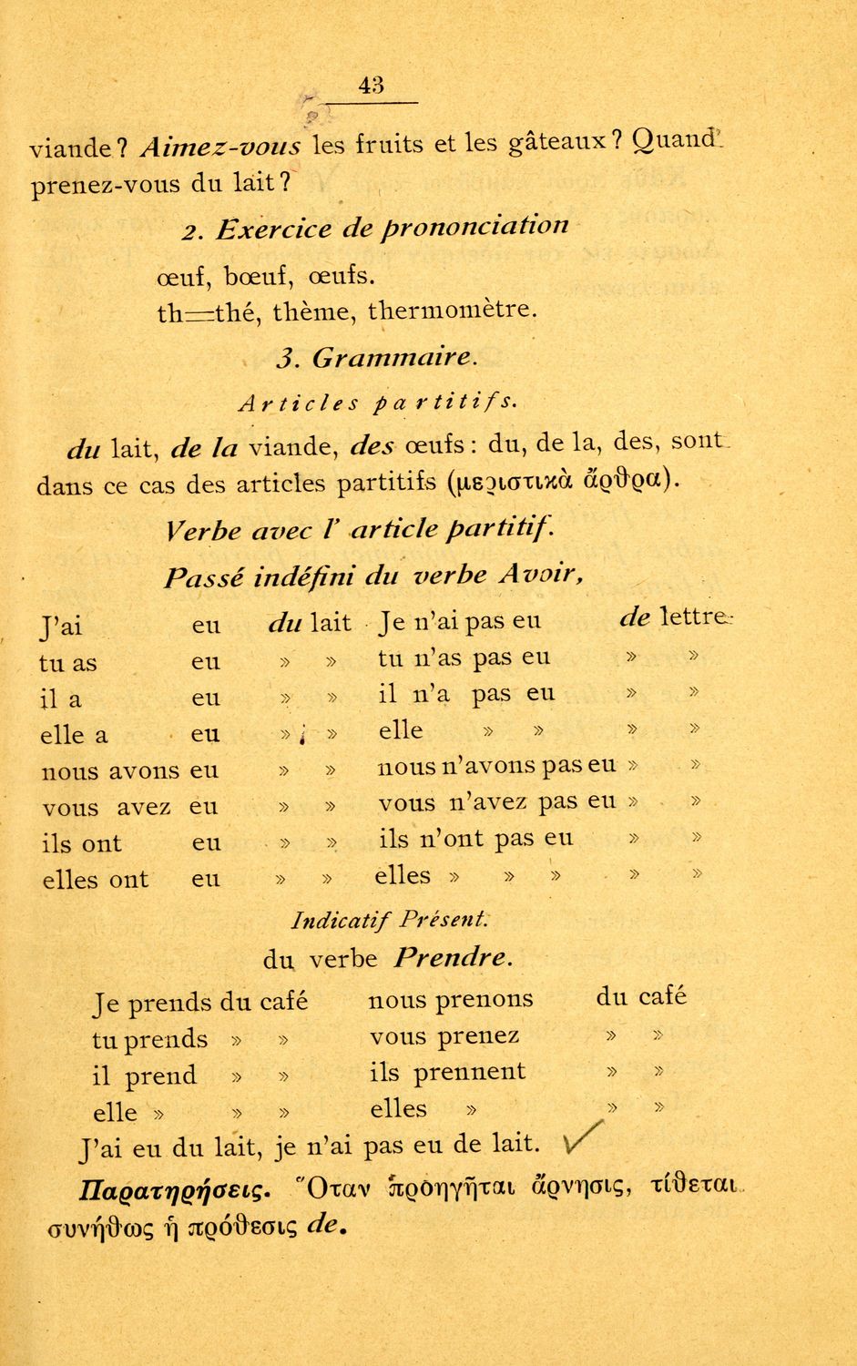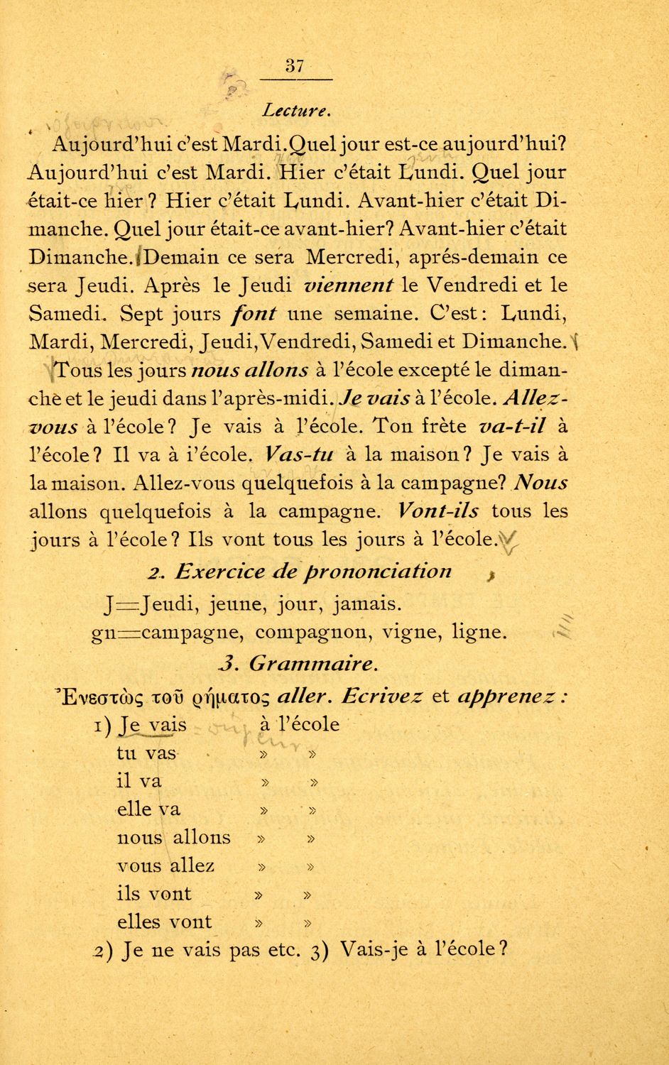 Σχολικό εγχειρίδιο Γαλλικών Β΄ και Γ' Ελληνικού Σχολείου, Αστικού Σχολείου και Παρθεναγωγείου που περιλαμβάνει κείμενα, κανόνες γραμματικής και συντακτικού, ερωτήσεις και ασκήσεις κατανόησης, και λεξιλογικά ...