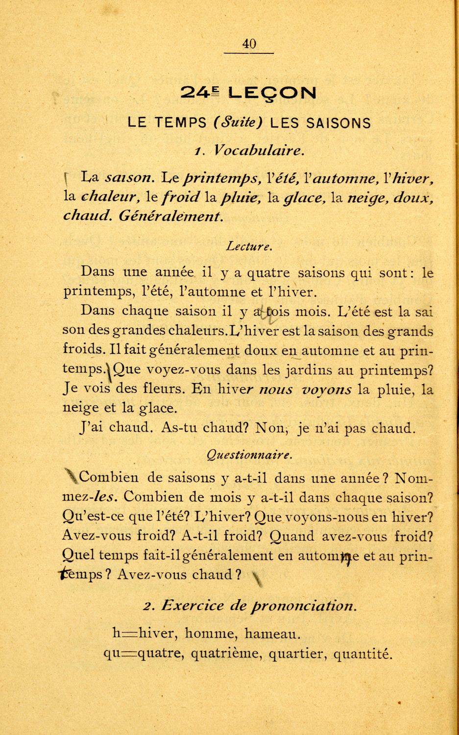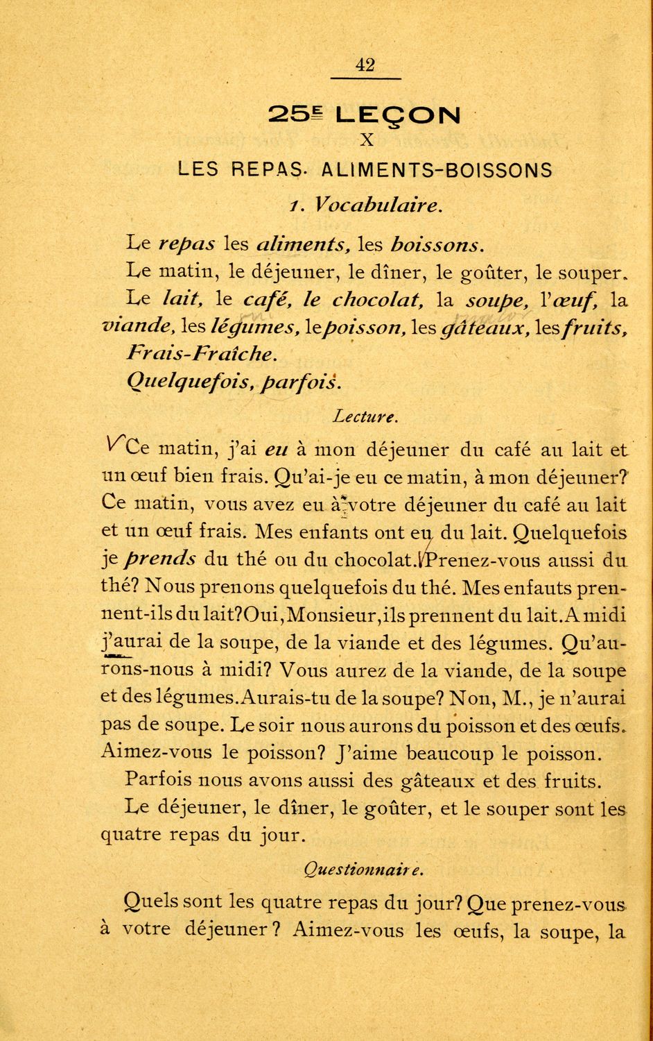 Σχολικό εγχειρίδιο Γαλλικών που περιλαμβάνει 54 κείμενα για τη διδασκαλία των γραμματικών και συντακτικών φαινομένων και της ορθογραφίας, λεξιλόγιο και παράρτημα με τους κανόνες συλλαβισμού.