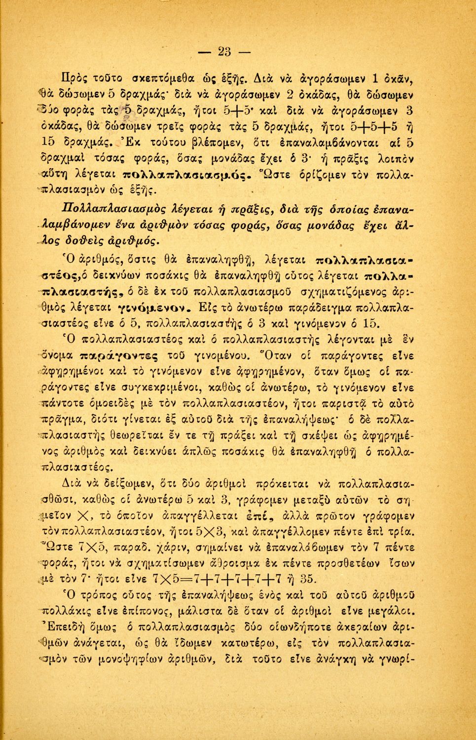 Σχολικό εγχειρίδιο Αριθμητικής για τα Ελληνικά και Αστικά Σχολεία και τα Παρθεναγωγεία που εστιάζει στις αριθμητικές πράξεις, τα κλάσματα, τους δεκαδικούς και συμμιγείς αριθμούς, και τις δυνάμεις. Περιέχει και στοιχεία λογιστικής.