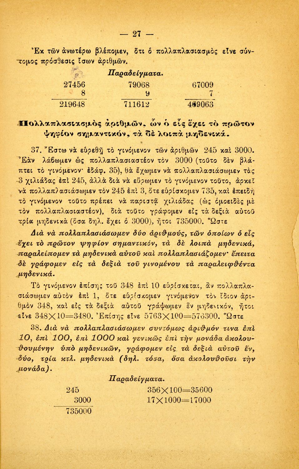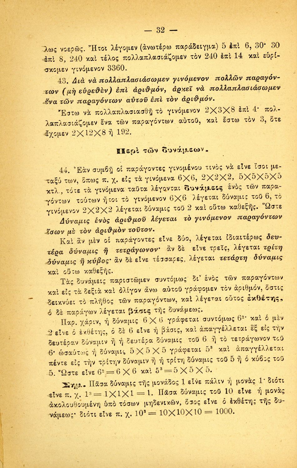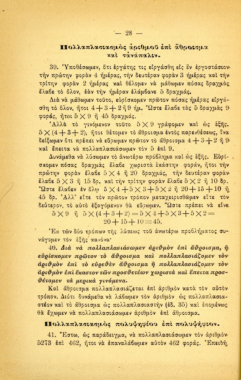Σχολικό εγχειρίδιο Αριθμητικής για τα Ελληνικά και Αστικά Σχολεία και τα Παρθεναγωγεία που εστιάζει στις αριθμητικές πράξεις, τα κλάσματα, τους δεκαδικούς και συμμιγείς αριθμούς, και τις δυνάμεις. Περιέχει και