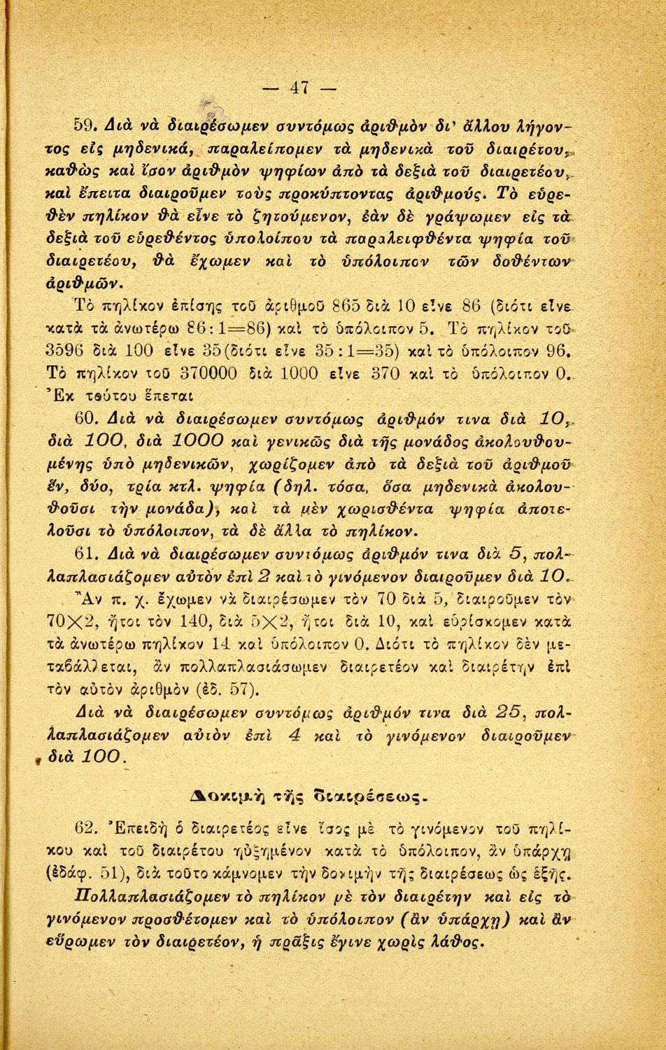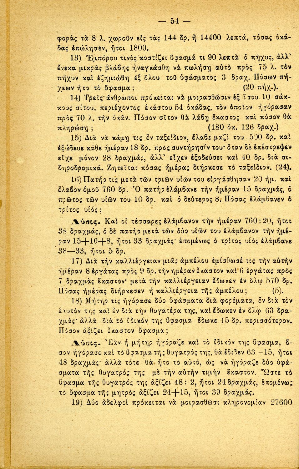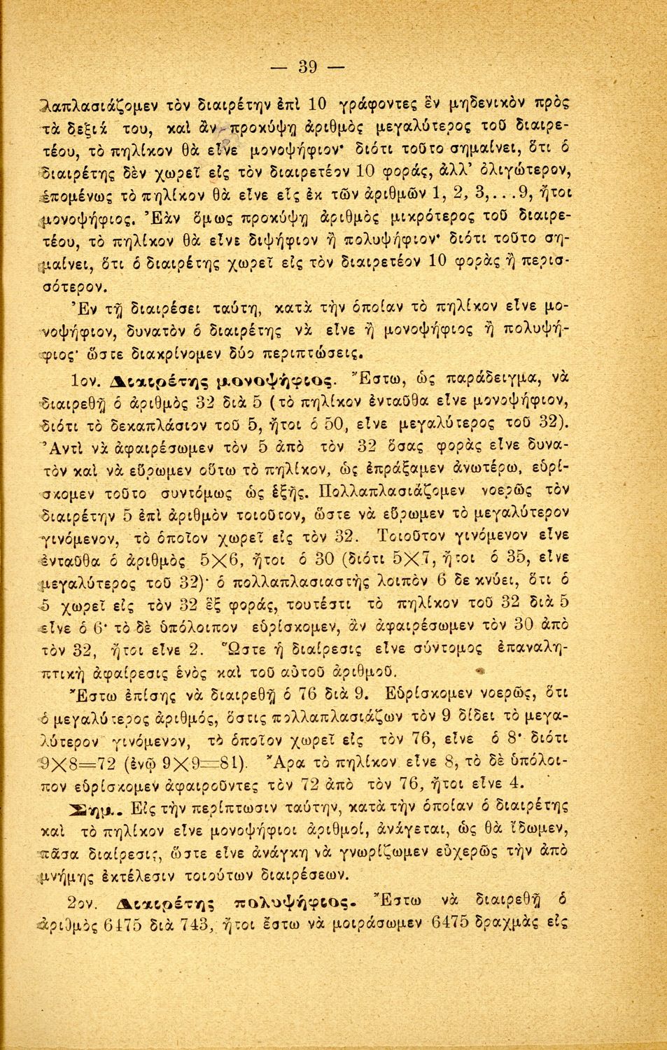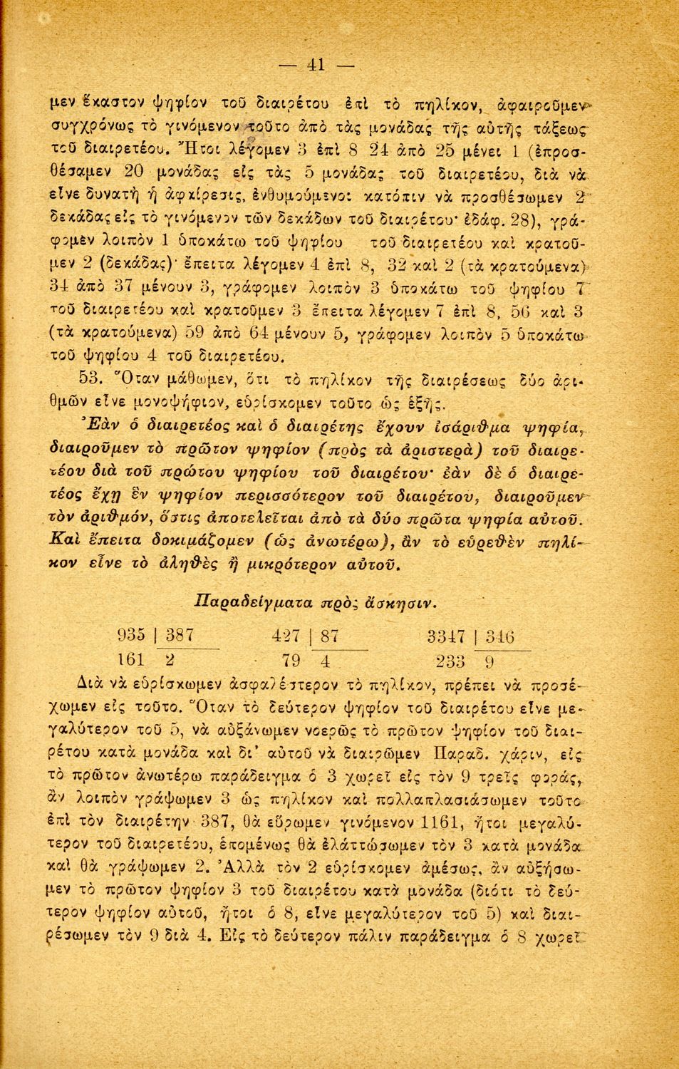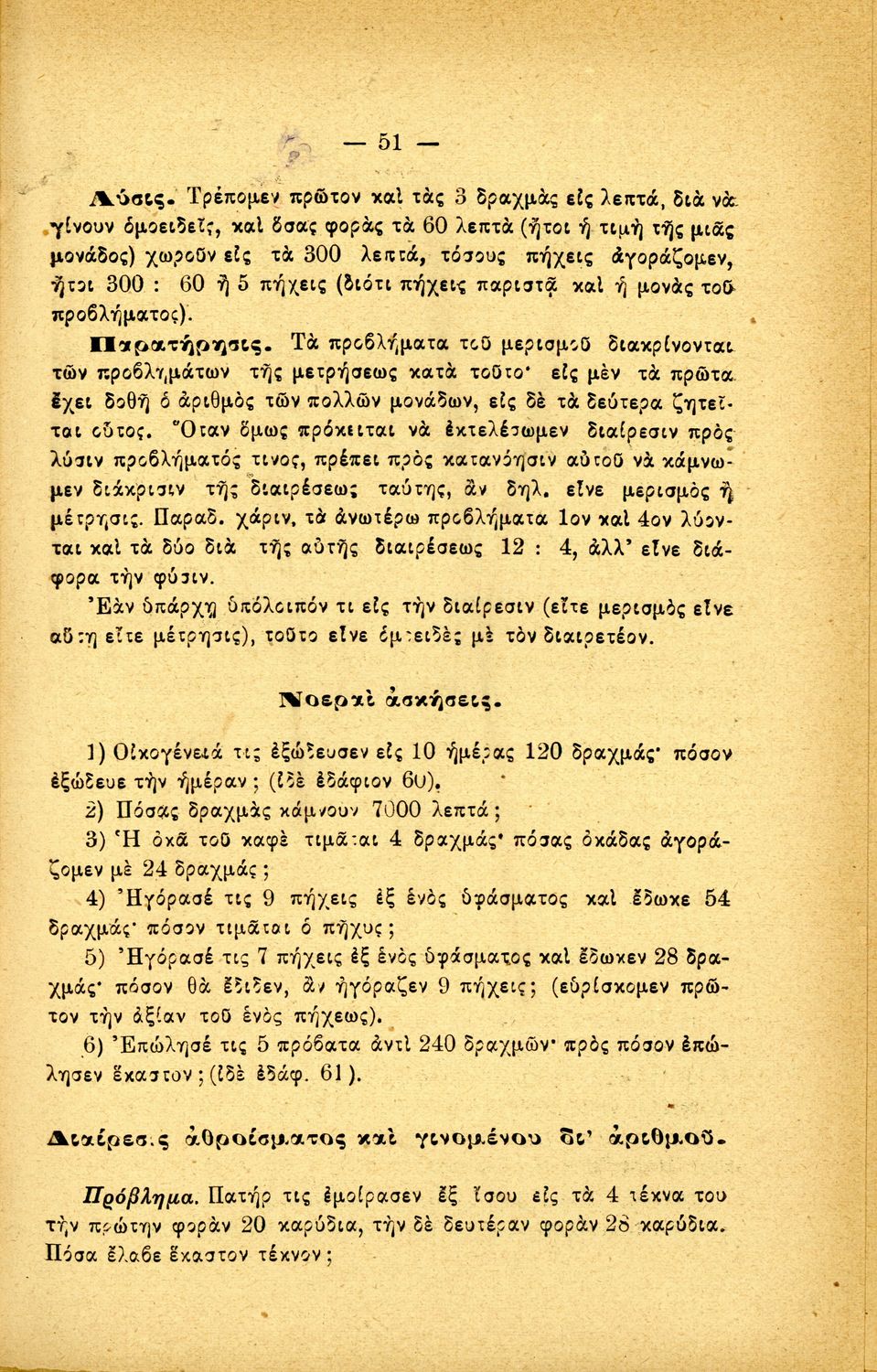 Σχολικό εγχειρίδιο Αριθμητικής για τα Ελληνικά και Αστικά Σχολεία και τα Παρθεναγωγεία που εστιάζει στις αριθμητικές πράξεις, τα κλάσματα, τους δεκαδικούς και συμμιγείς αριθμούς, και τις δυνάμεις. Περιέχει και