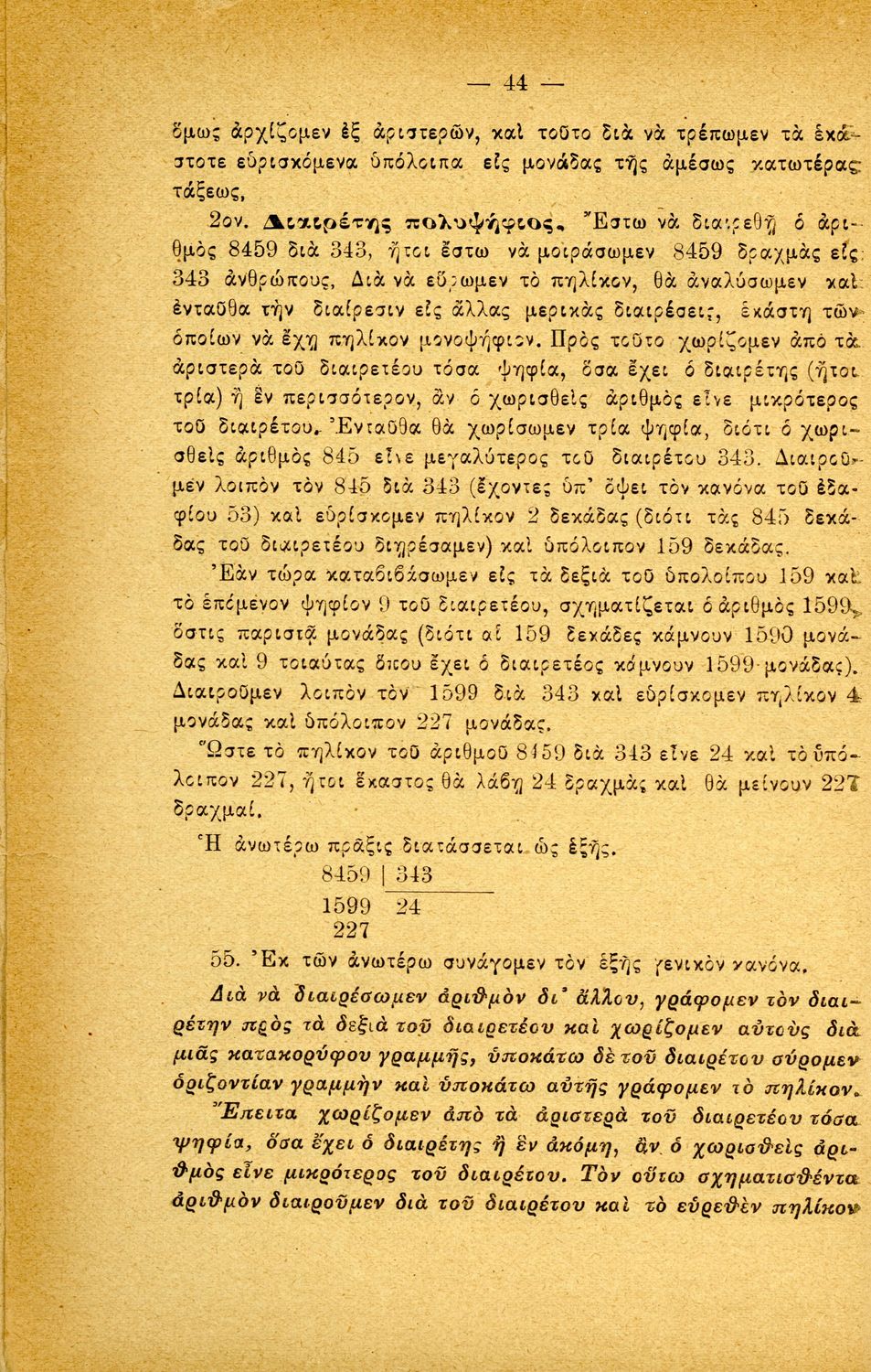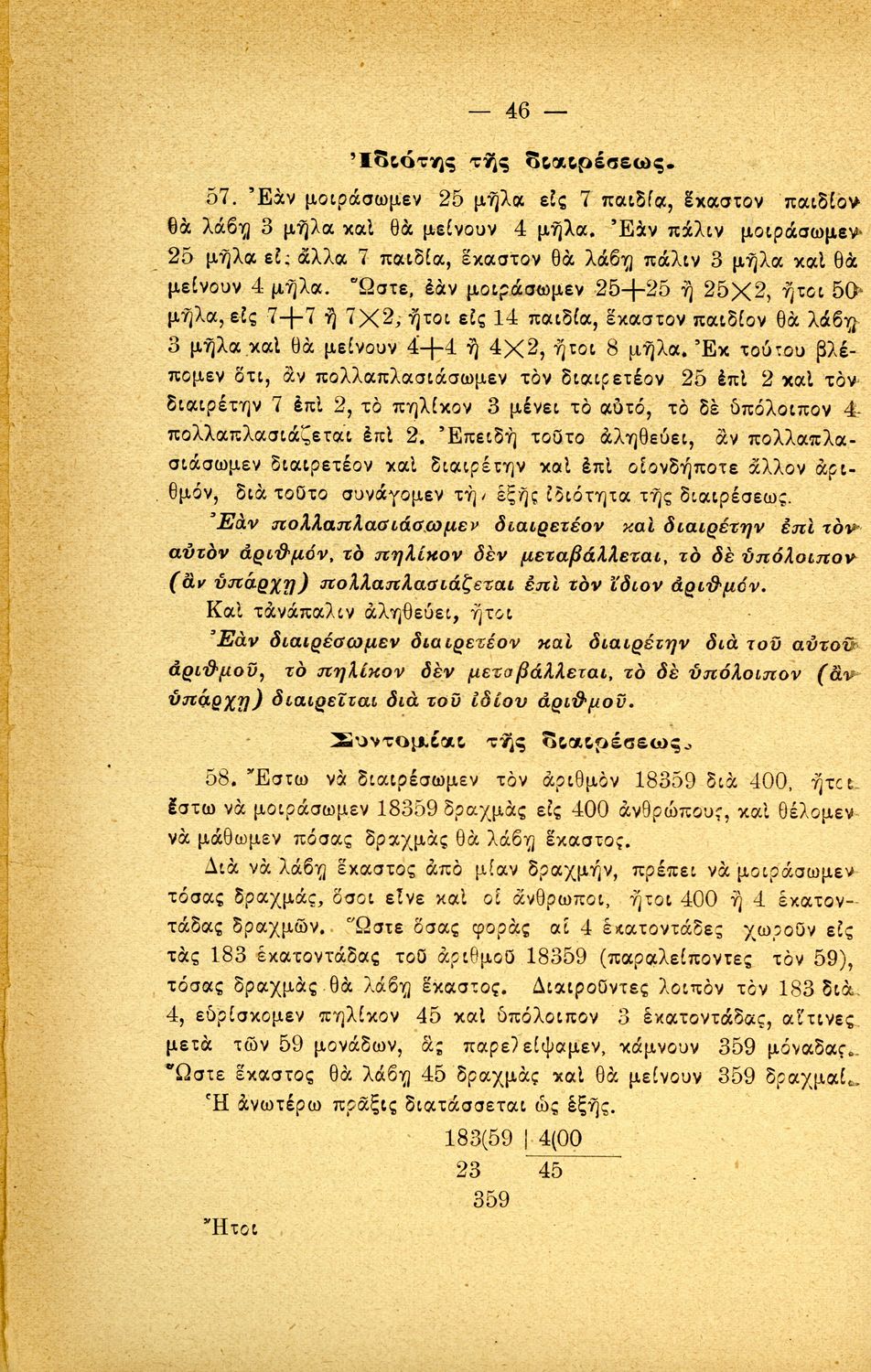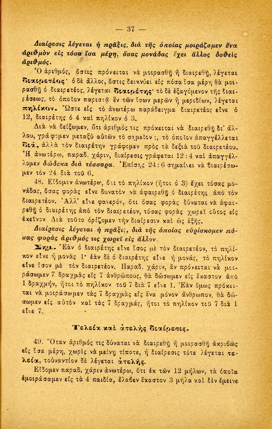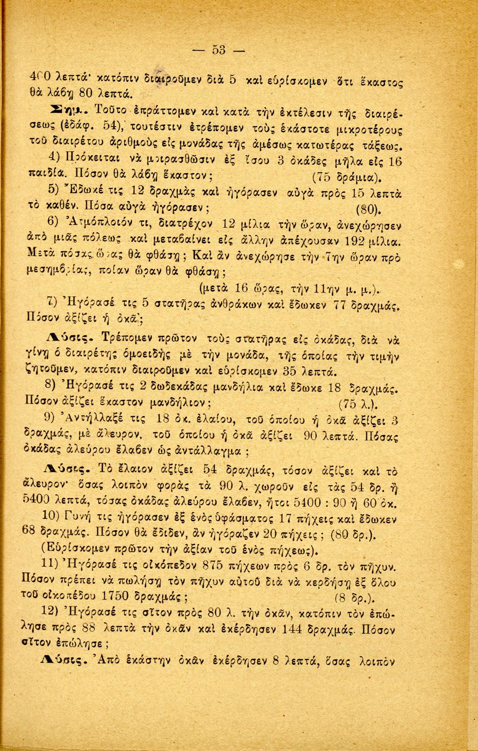 Σχολικό εγχειρίδιο Αριθμητικής για τα Ελληνικά και Αστικά Σχολεία και τα Παρθεναγωγεία που εστιάζει στις αριθμητικές πράξεις, τα κλάσματα, τους δεκαδικούς και συμμιγείς αριθμούς, και τις δυνάμεις. Περιέχει και