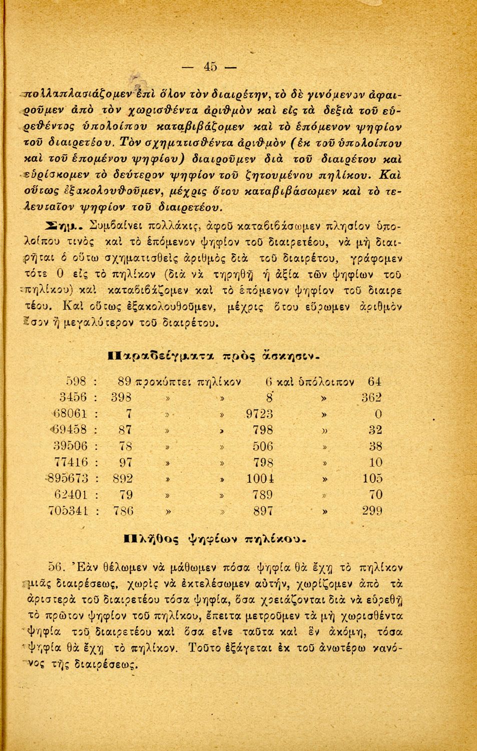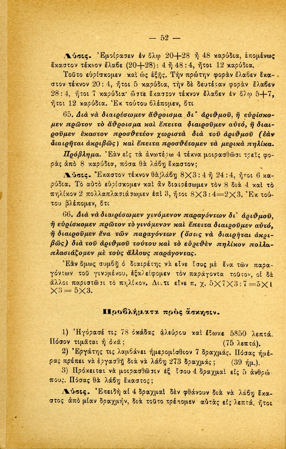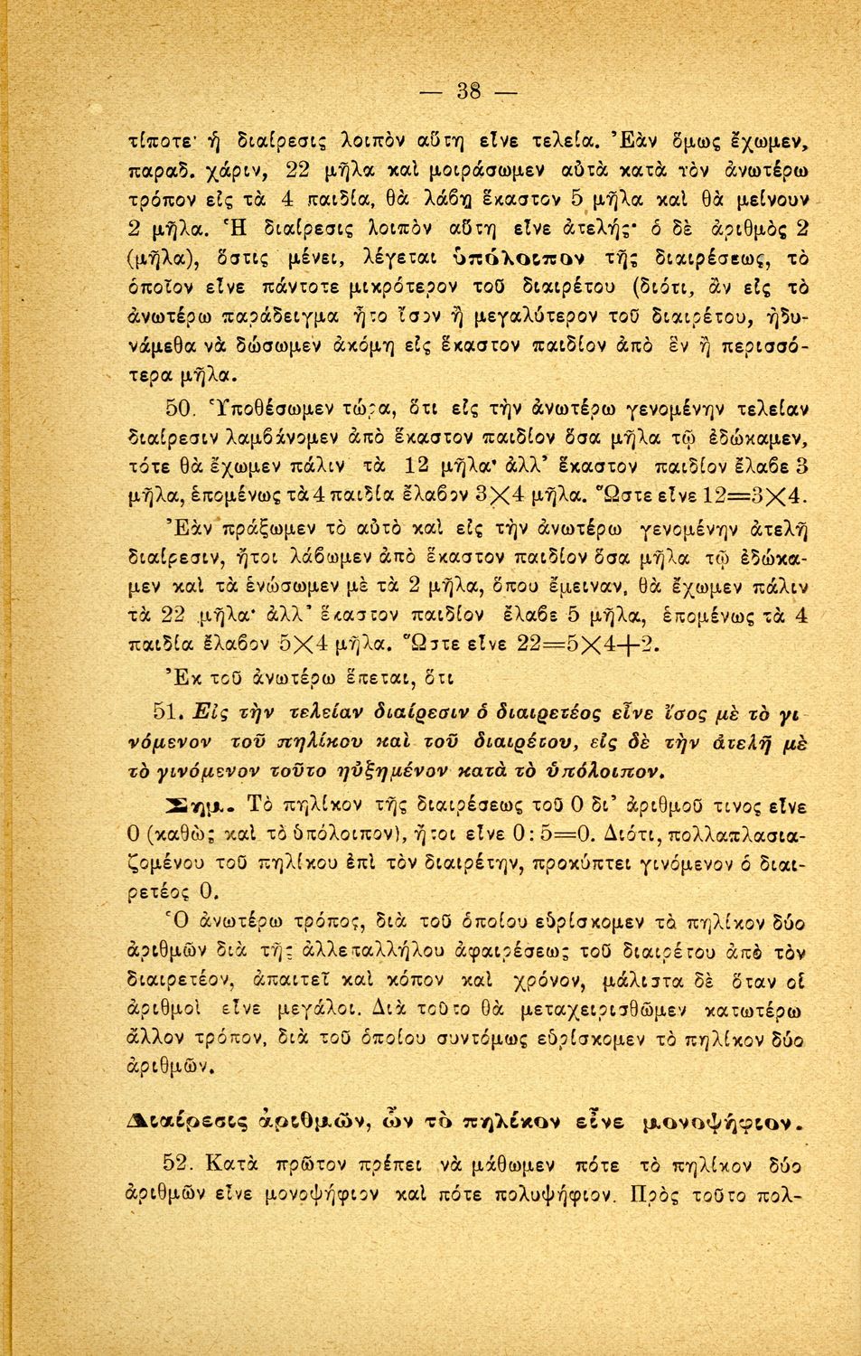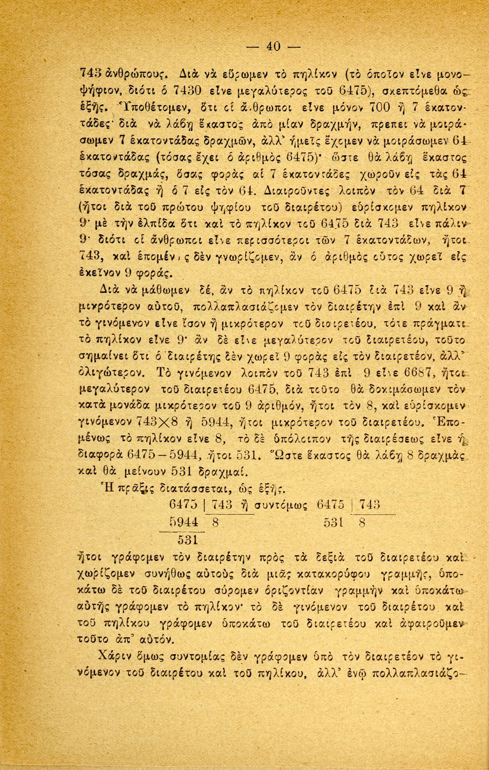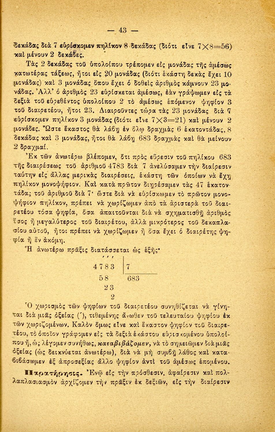 Σχολικό εγχειρίδιο Αριθμητικής για τα Ελληνικά και Αστικά Σχολεία και τα Παρθεναγωγεία που εστιάζει στις αριθμητικές πράξεις, τα κλάσματα, τους δεκαδικούς και συμμιγείς αριθμούς, και τις δυνάμεις. Περιέχει και