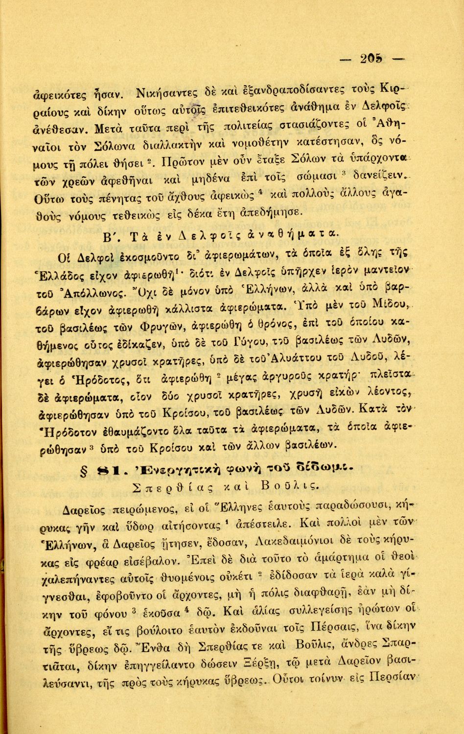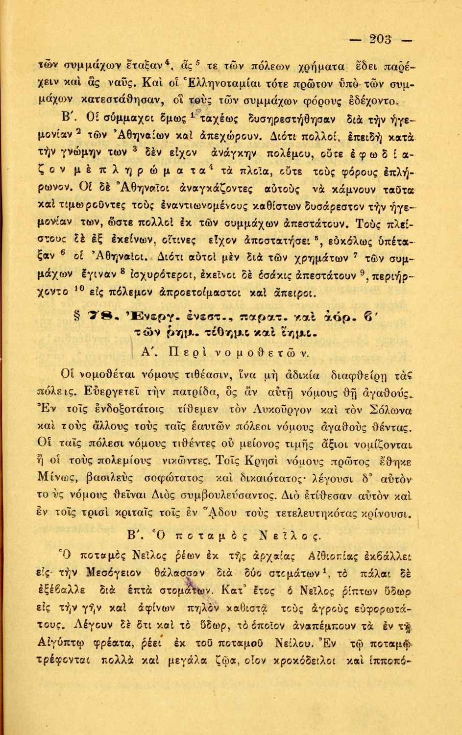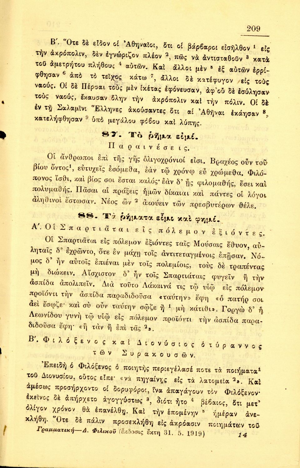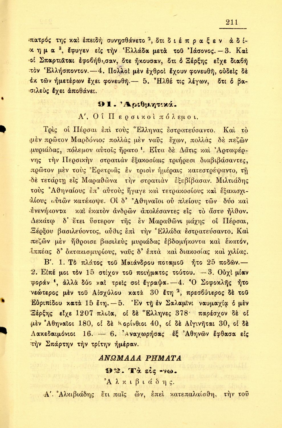 Βαθμίδα εκπαίδευσης: Δευτεροβάθμια Τάξη: Α' Ελληνικού Σχολείου / Β' Ελληνικού Σχολείου / Γ' Ελληνικού Σχολείου Μάθημα: Αρχαία Ελληνικά Γλώσσα: Καθαρεύουσα Παρουσίαση περιεχομένου: Σχολικό εγχειρίδιο Αρχαίων Ελληνικών για τις Α΄, Β΄ και Γ' Ελληνικού Σχολείου που περιλαμβάνει τη γραμματική της αρχαίας ελληνικής, πίνακα ανωμάλων ρημάτων και αρχικών χρόνων και ασκήσεις. |