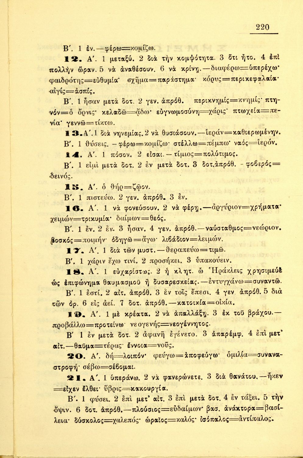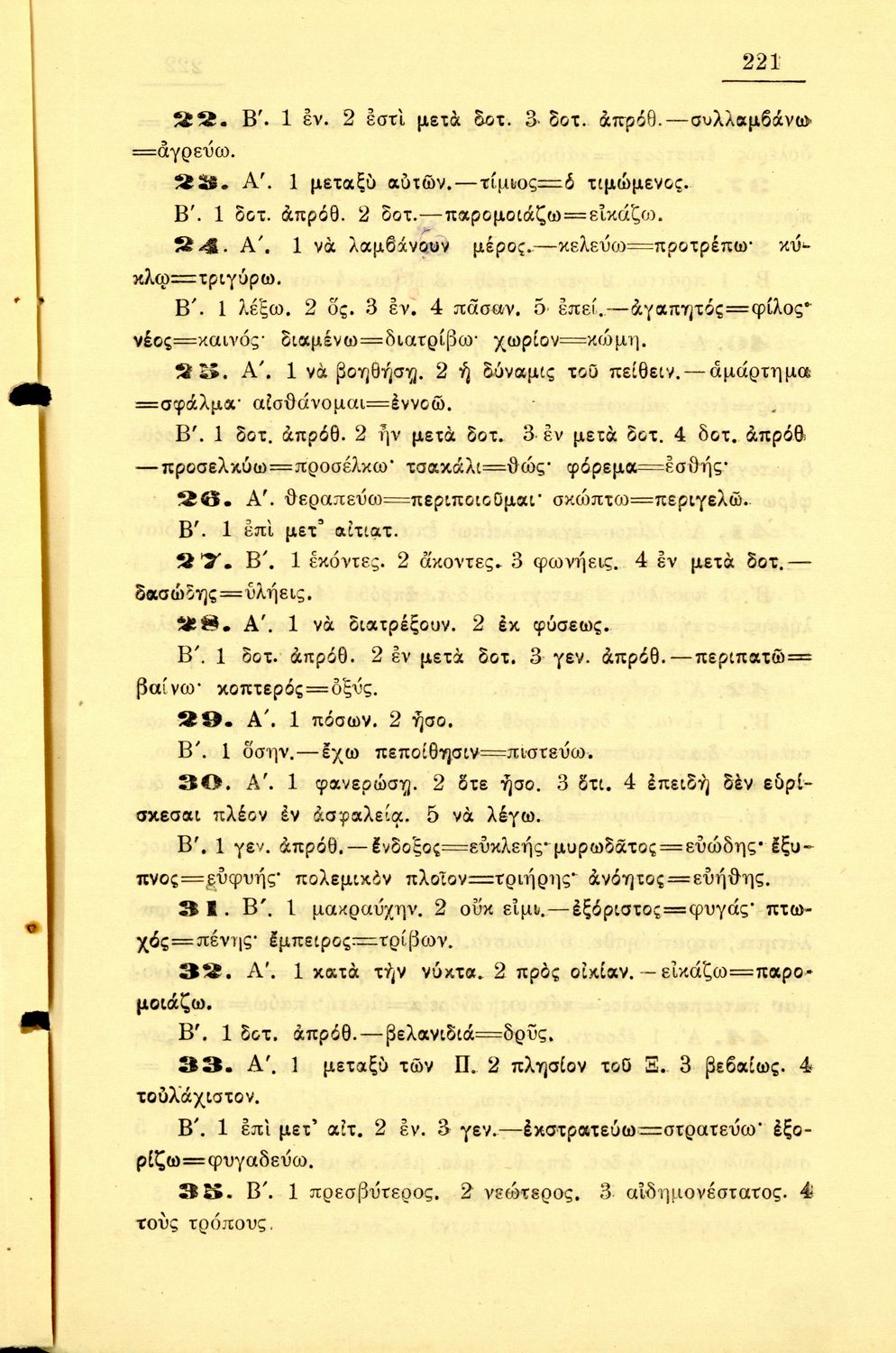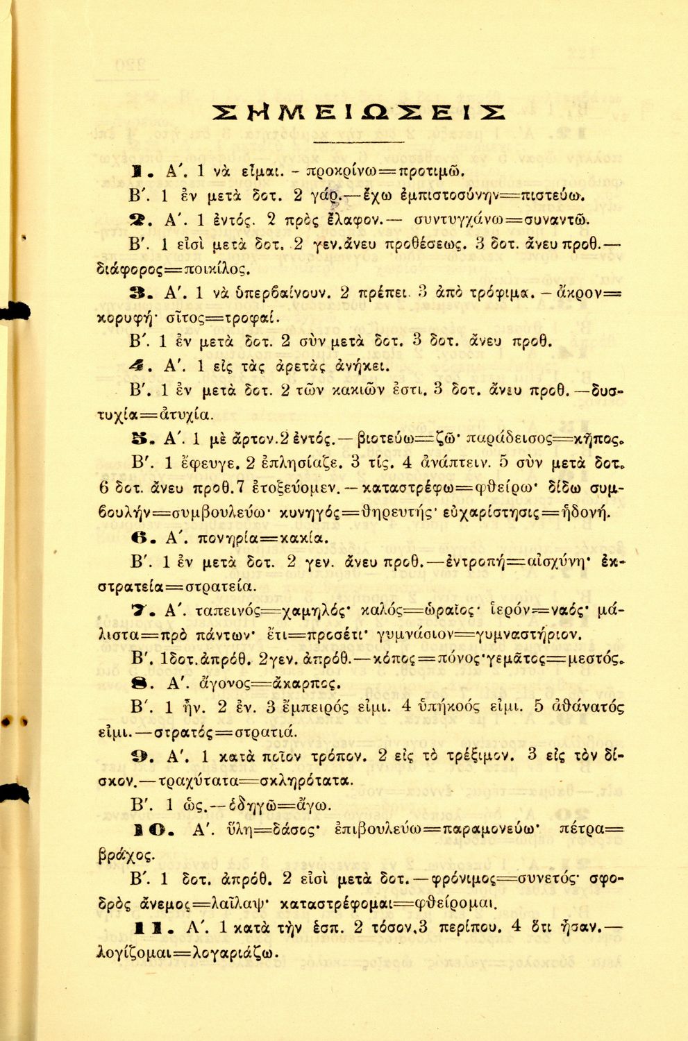 Βαθμίδα εκπαίδευσης: Δευτεροβάθμια Τάξη: Α' Ελληνικού Σχολείου / Β' Ελληνικού Σχολείου / Γ' Ελληνικού Σχολείου Μάθημα: Αρχαία Ελληνικά Γλώσσα: Καθαρεύουσα Παρουσίαση περιεχομένου: Σχολικό εγχειρίδιο Αρχαίων Ελληνικών για τις Α΄, Β΄ και Γ' Ελληνικού Σχολείου που περιλαμβάνει τη γραμματική της αρχαίας ελληνικής, πίνακα ανωμάλων ρημάτων και αρχικών χρόνων και ασκήσεις. |