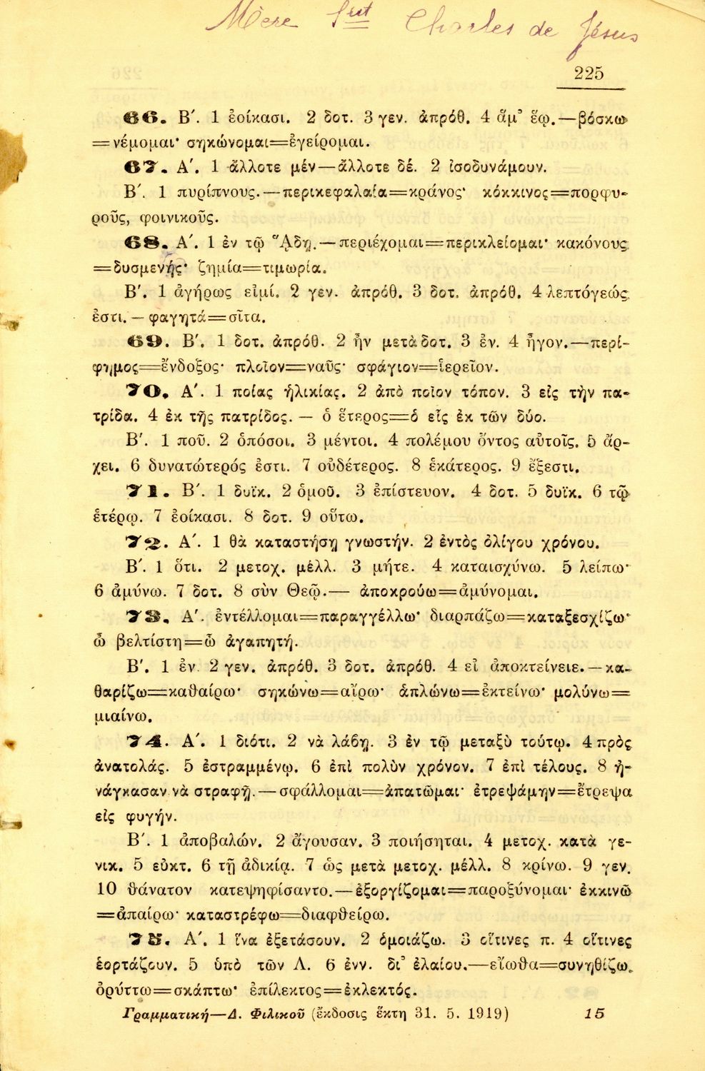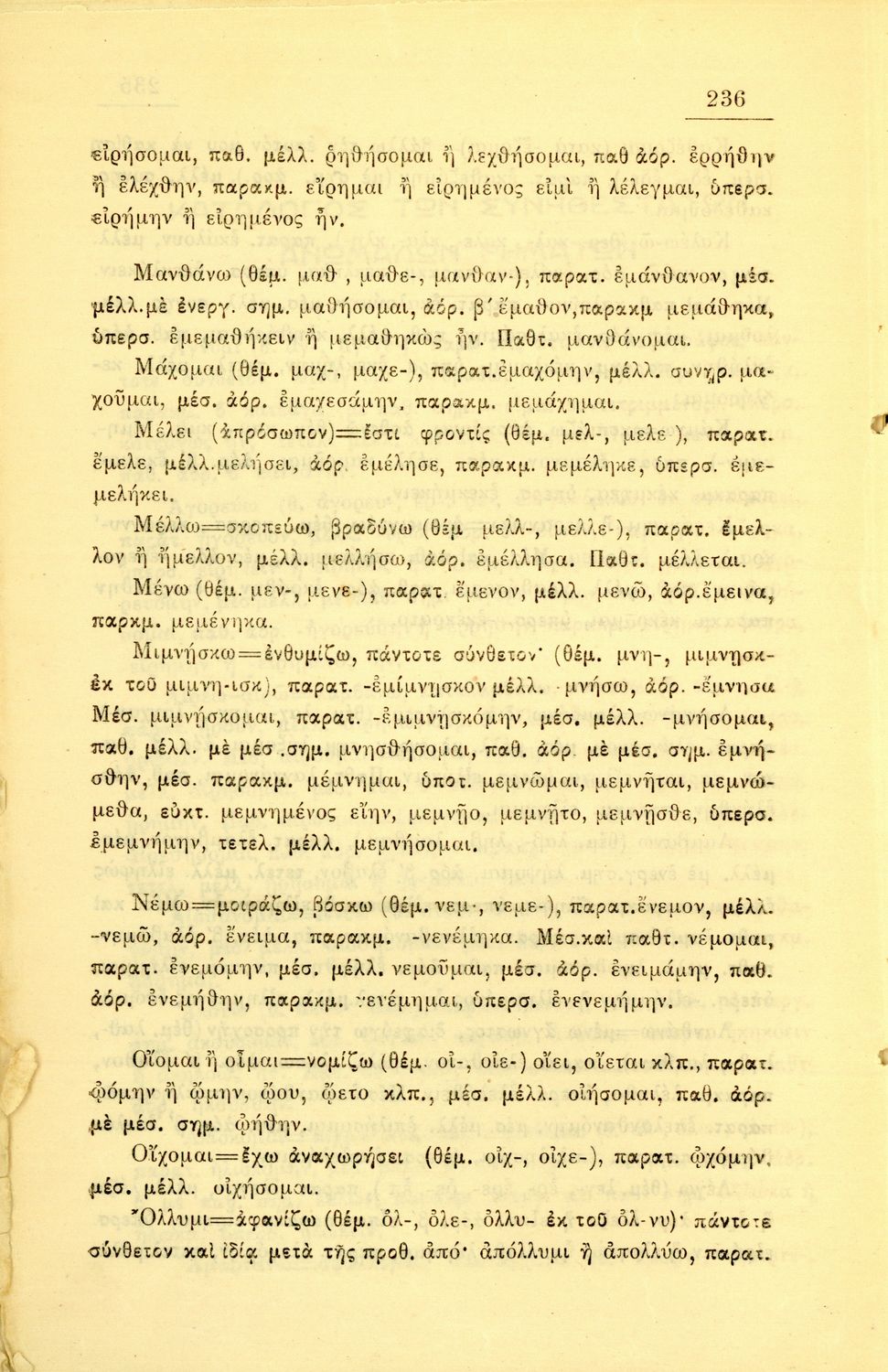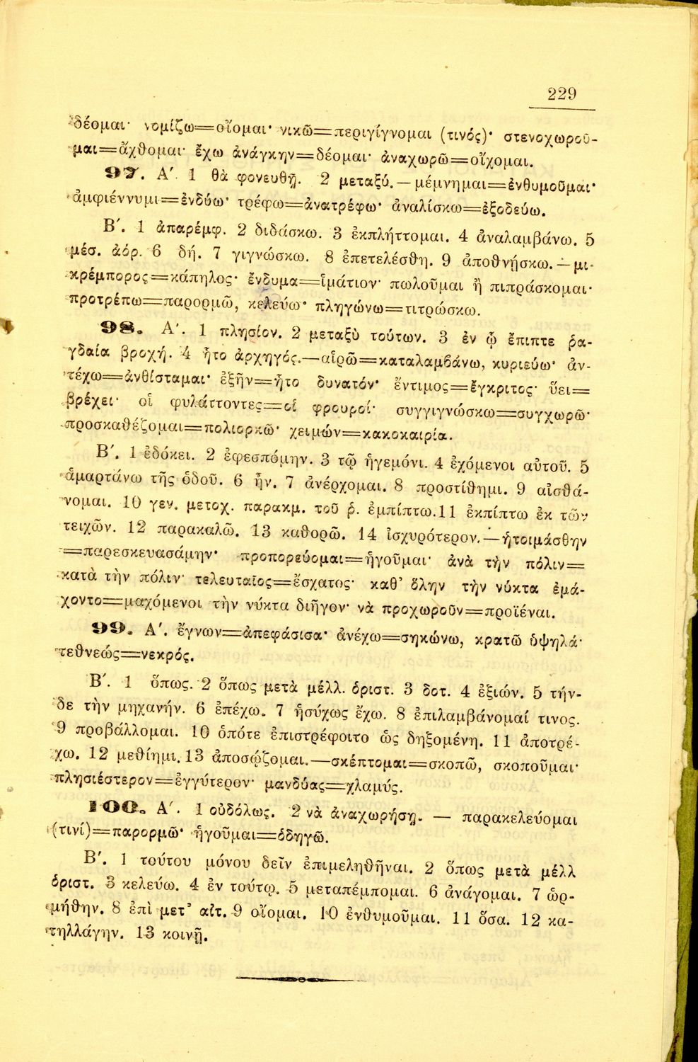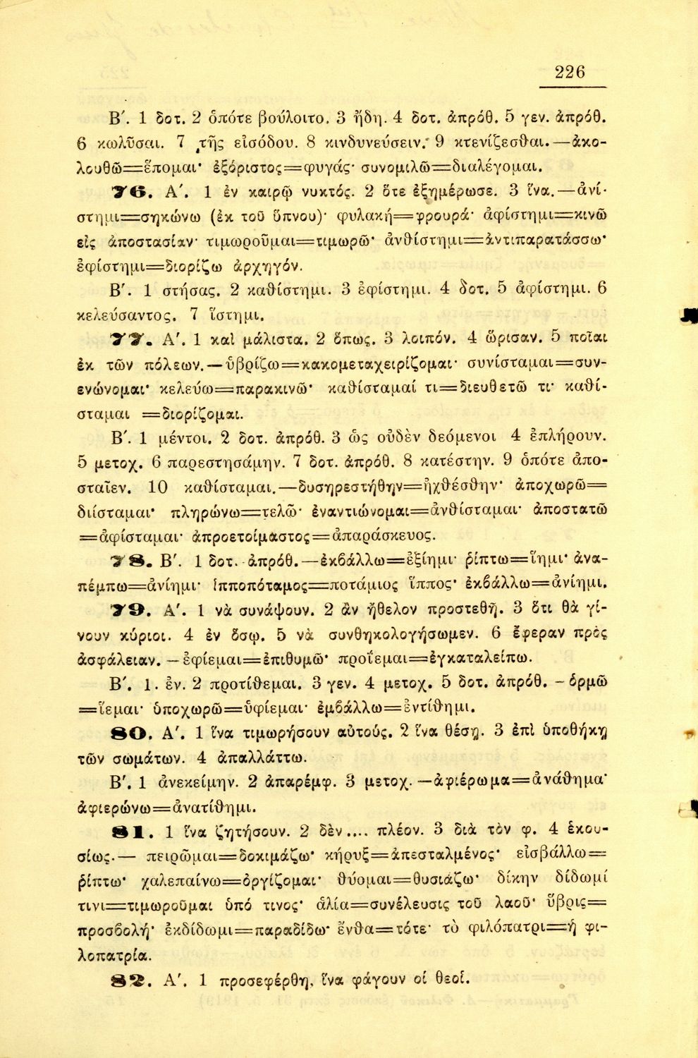 Βαθμίδα εκπαίδευσης: Δευτεροβάθμια Τάξη: Α' Ελληνικού Σχολείου / Β' Ελληνικού Σχολείου / Γ' Ελληνικού Σχολείου Μάθημα: Αρχαία Ελληνικά Γλώσσα: Καθαρεύουσα Παρουσίαση περιεχομένου: Σχολικό εγχειρίδιο Αρχαίων Ελληνικών για τις Α΄, Β΄ και Γ' Ελληνικού Σχολείου που περιλαμβάνει τη γραμματική της αρχαίας ελληνικής, πίνακα ανωμάλων ρημάτων και αρχικών χρόνων και ασκήσεις. |