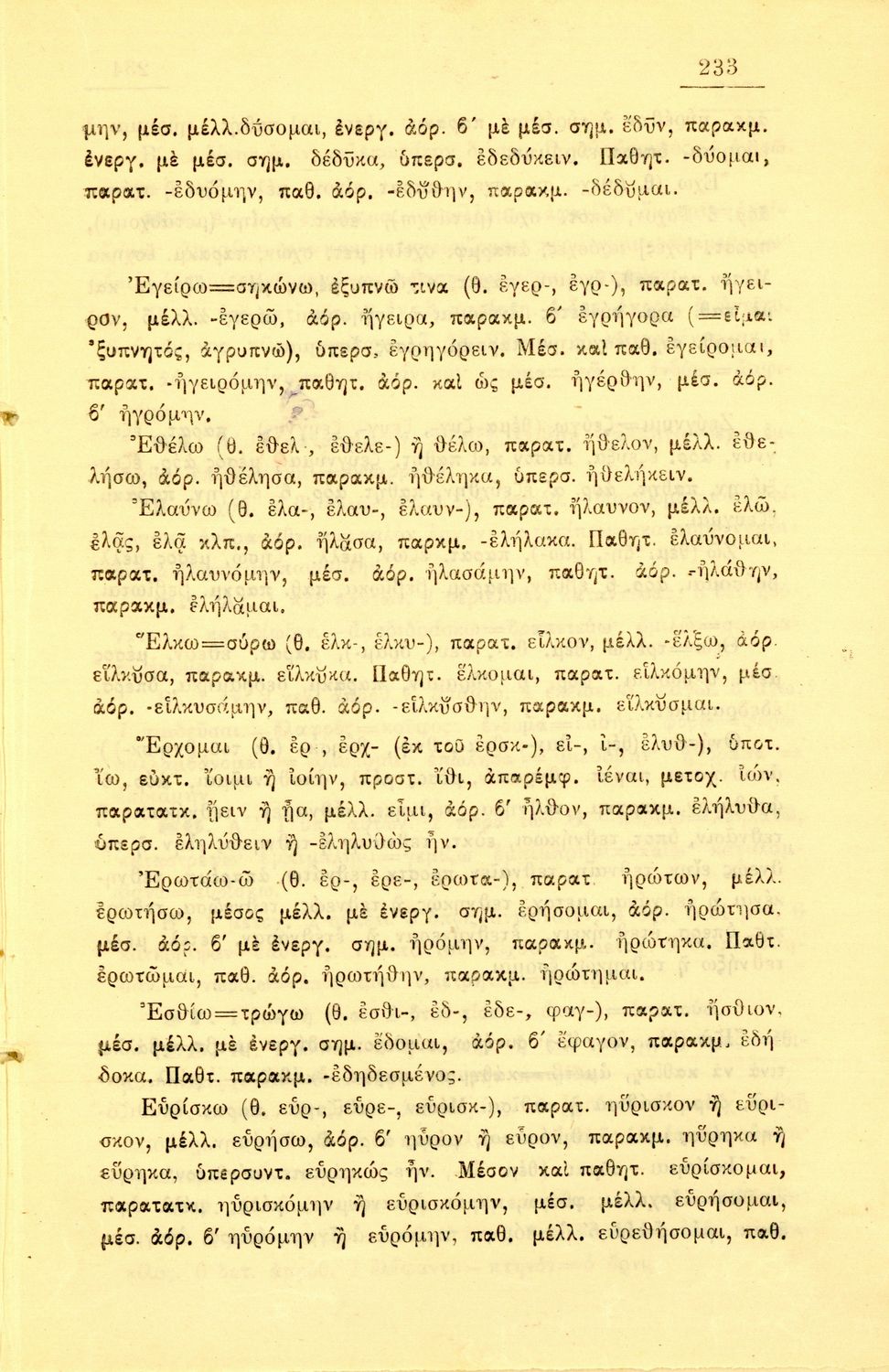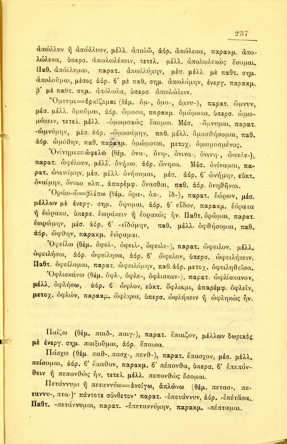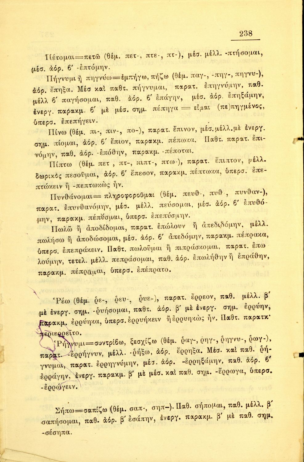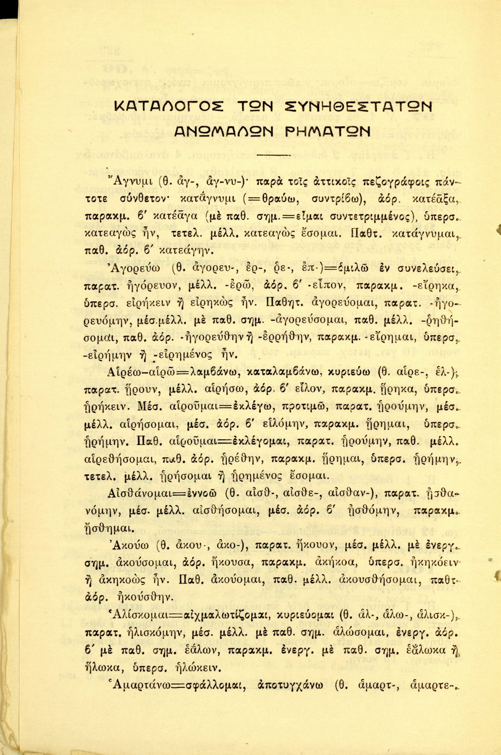 Σχολικό εγχειρίδιο Αρχαίων Ελληνικών για τις Α΄, Β΄ και Γ' Ελληνικού Σχολείου που περιλαμβάνει τη γραμματική της αρχαίας ελληνικής, πίνακα ανωμάλων ρημάτων και αρχικών χρόνων και ασκήσεις.