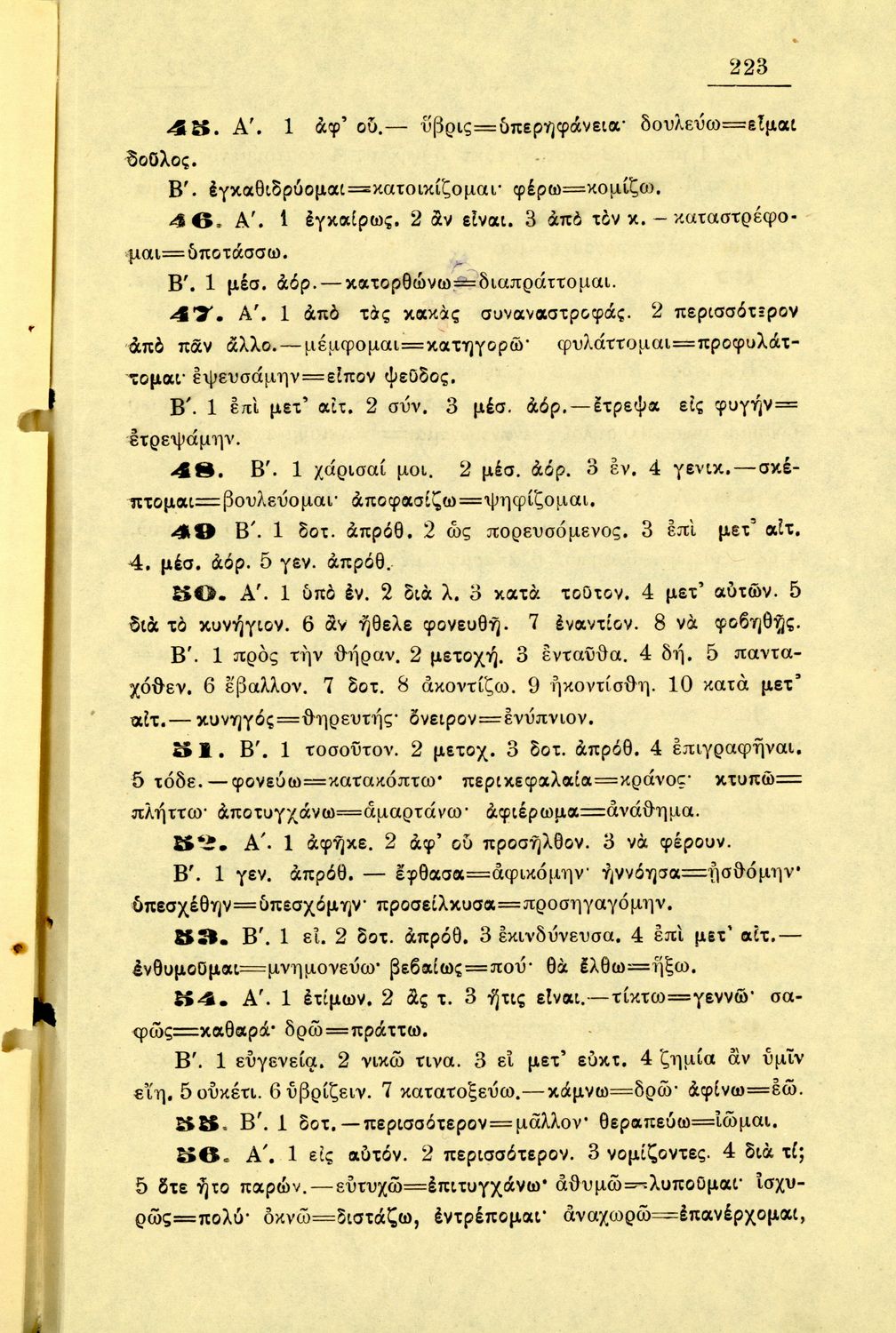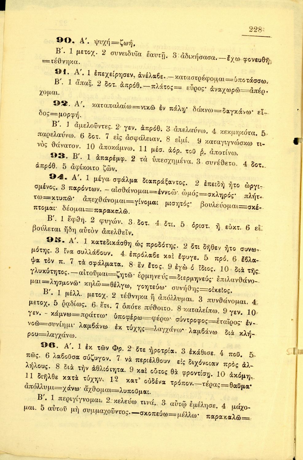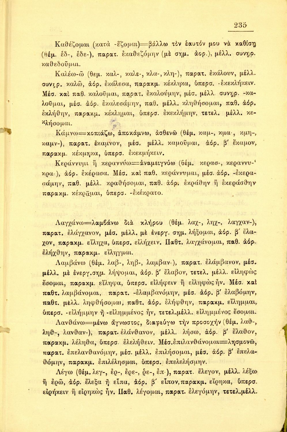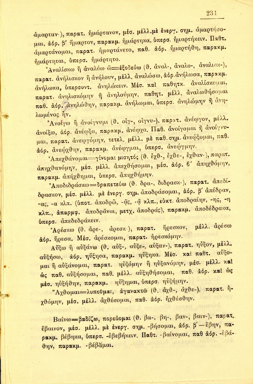 Σχολικό εγχειρίδιο Αρχαίων Ελληνικών για τις Α΄, Β΄ και Γ' Ελληνικού Σχολείου που περιλαμβάνει τη γραμματική της αρχαίας ελληνικής, πίνακα ανωμάλων ρημάτων και αρχικών χρόνων και ασκήσεις.
