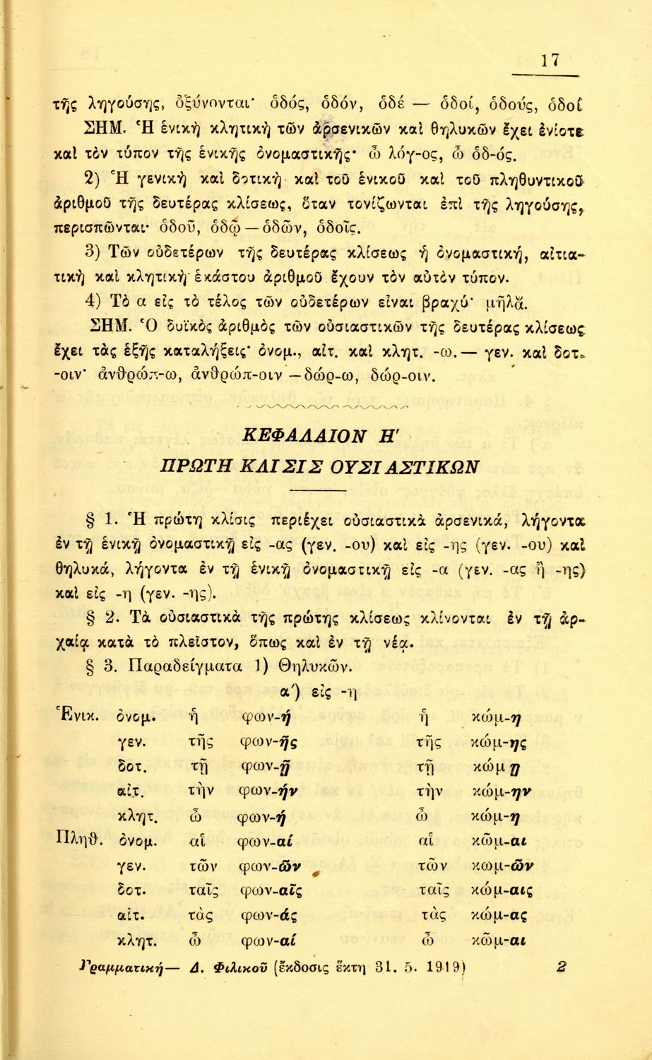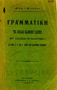 Σχολικό εγχειρίδιο Αρχαίων Ελληνικών Α΄, Β΄, Γ' Ελληνικού Σχολείου που αποτελεί γραμματική της αρχαίας ελληνικής και είναι χωρισμένο στο φθογγολογικό και το τυπολογικό μέρος. Περιέχει και σύντομα κείμενα που ...