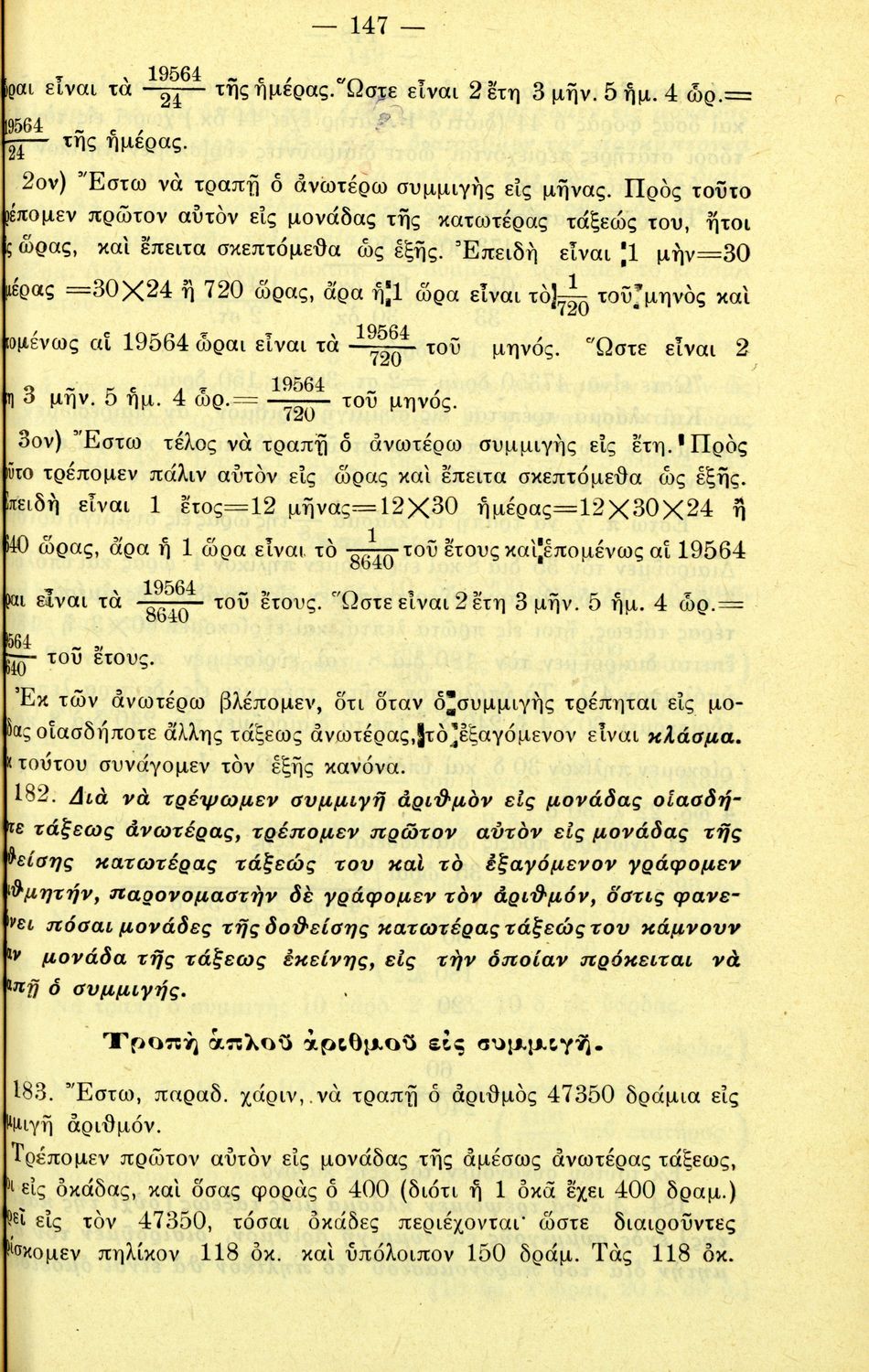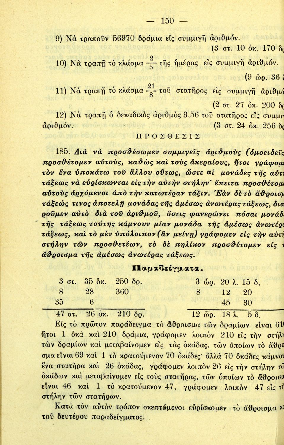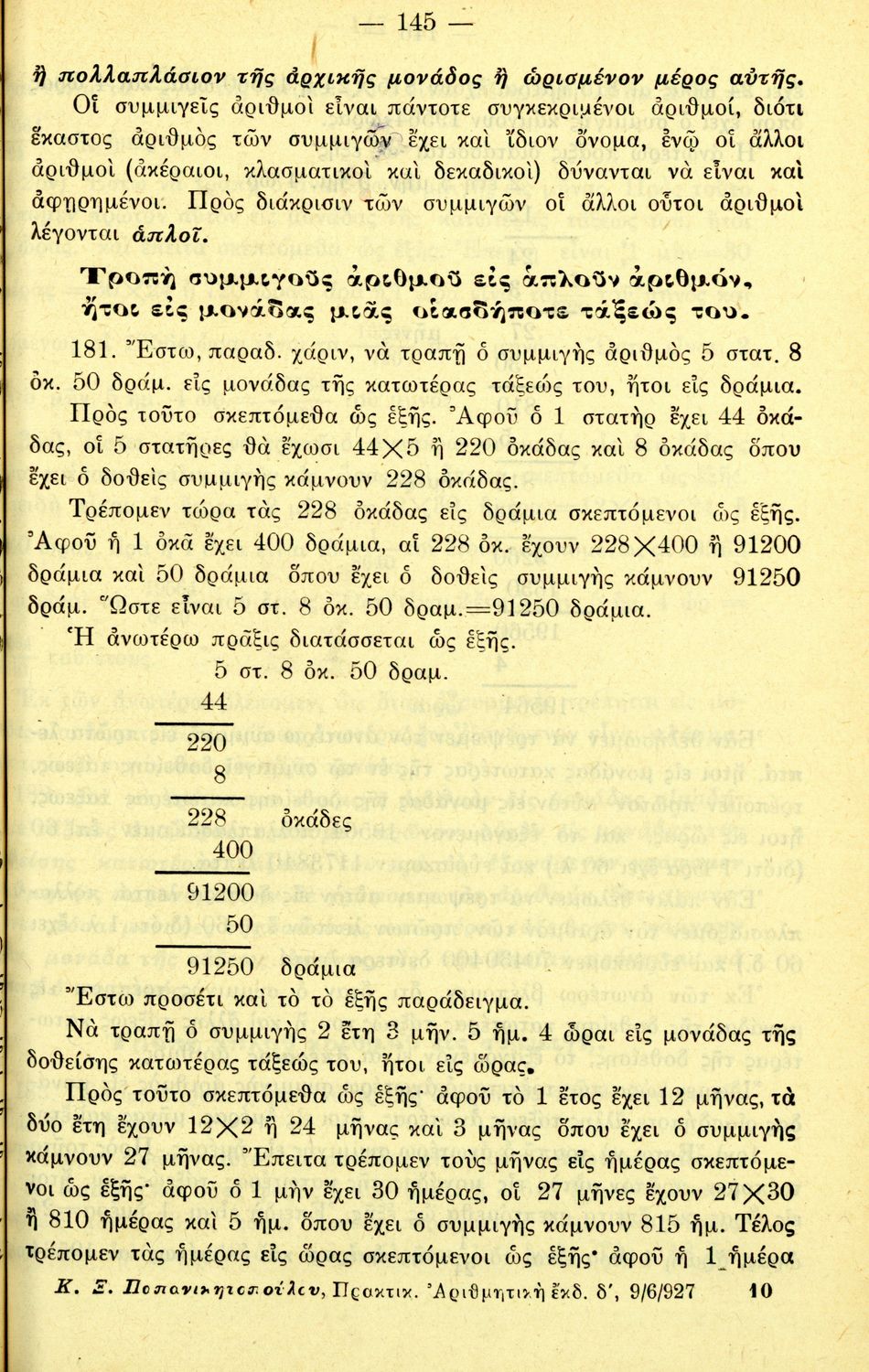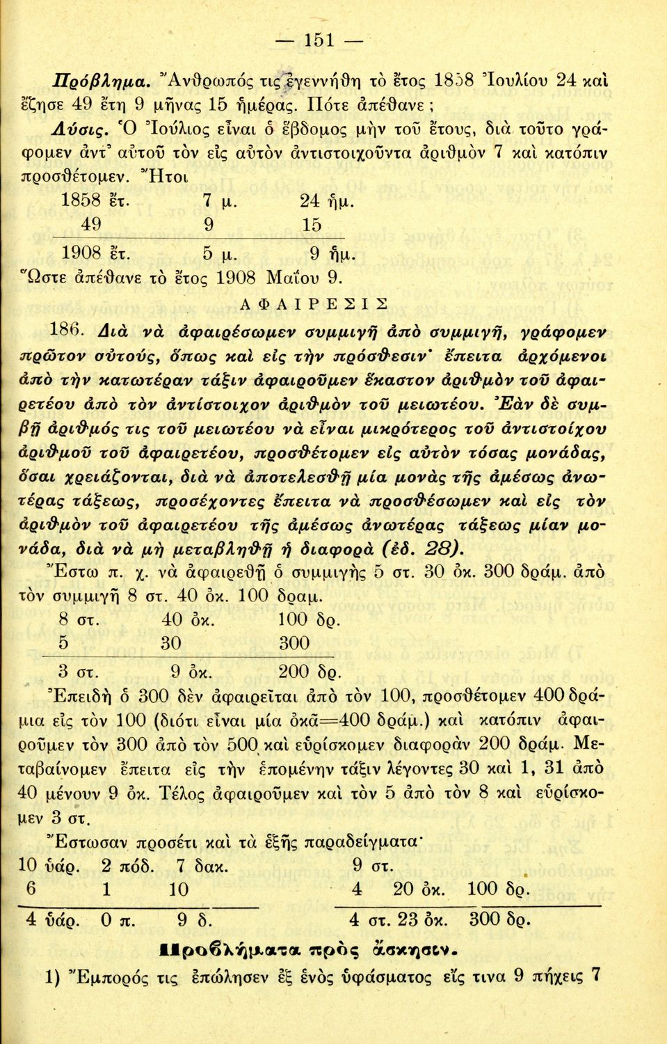 Σχολικό εγχειρίδιο Αριθμητικής για τα Ελληνικά και Αστικά Σχολεία και τα Παρθεναγωγεία που εστιάζει στις αριθμητικές πράξεις, τα κλάσματα, τους δεκαδικούς και συμμιγείς αριθμούς, και τις δυνάμεις. Περιέχει και