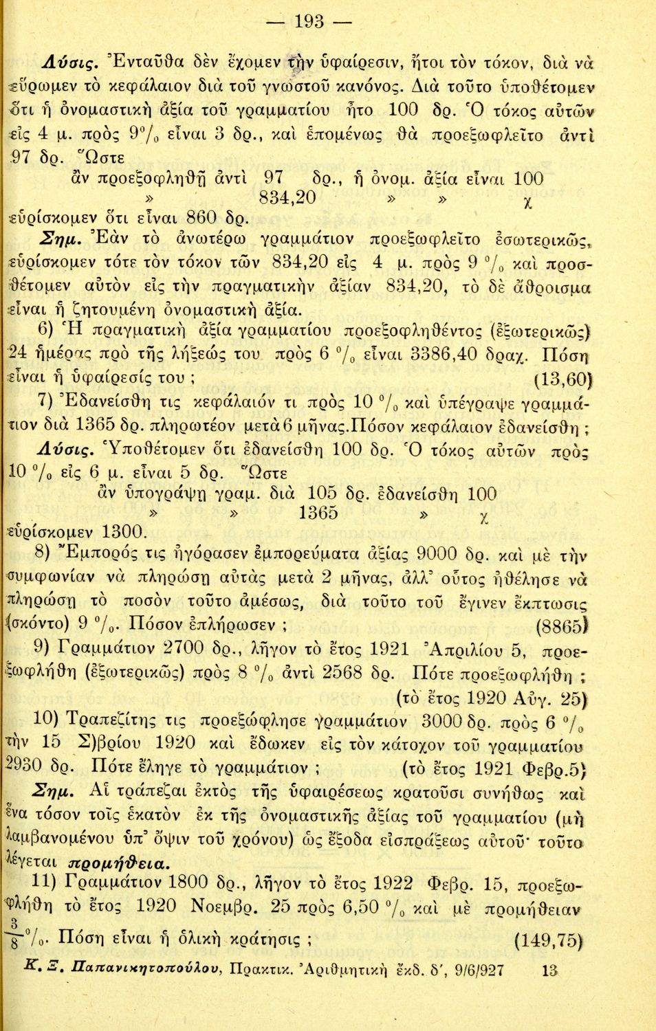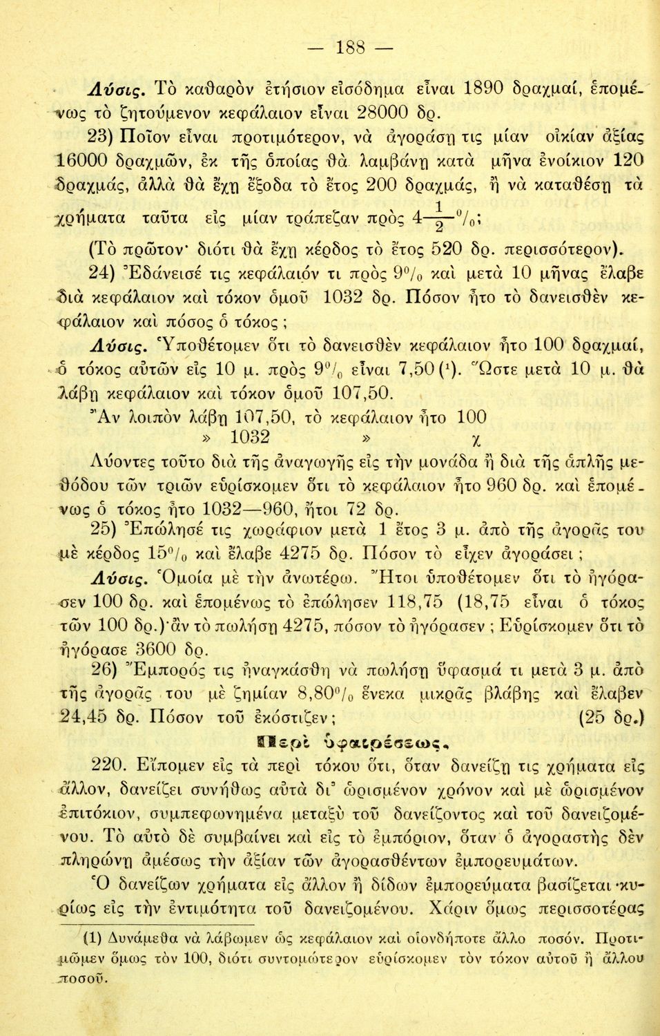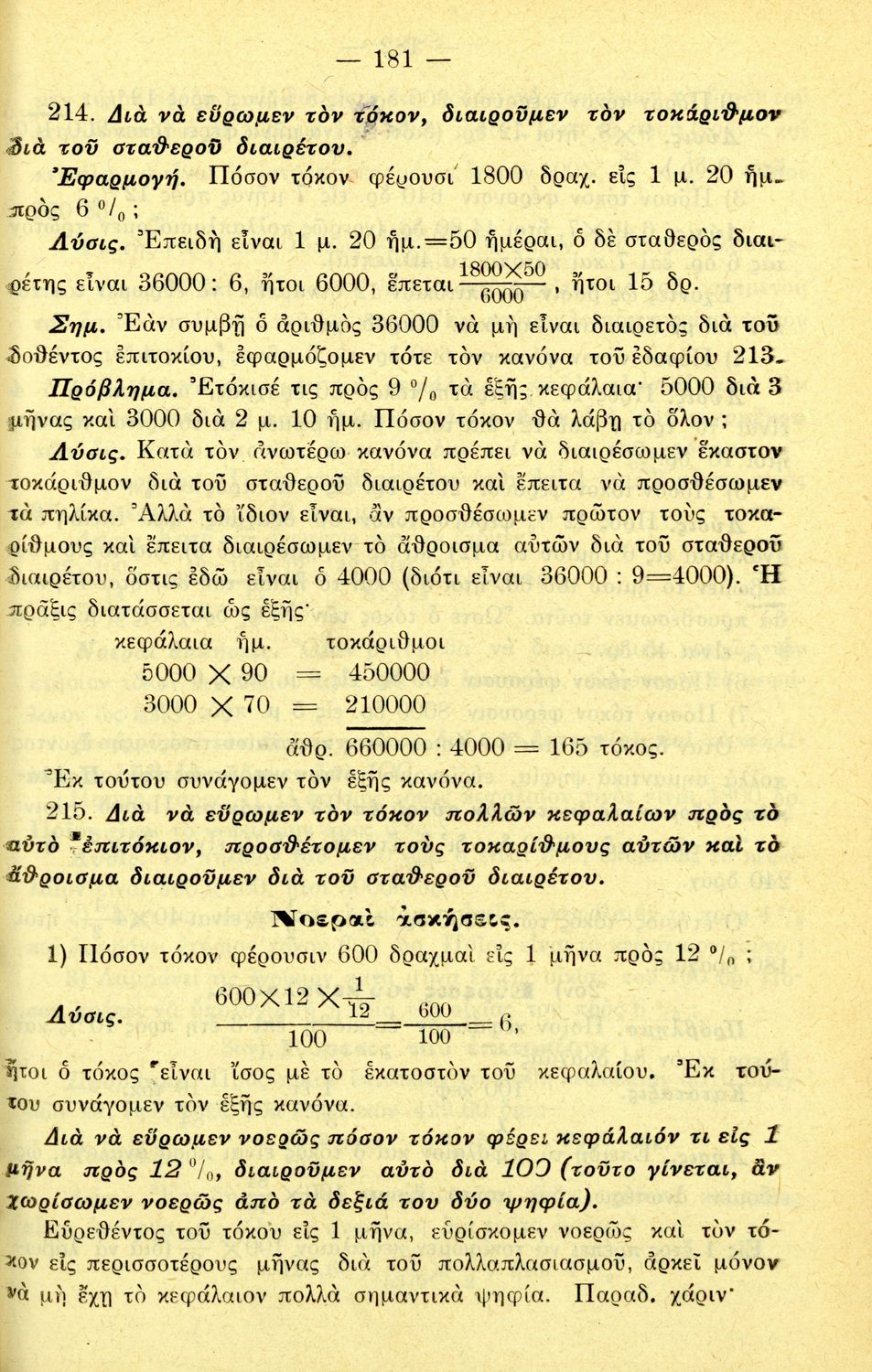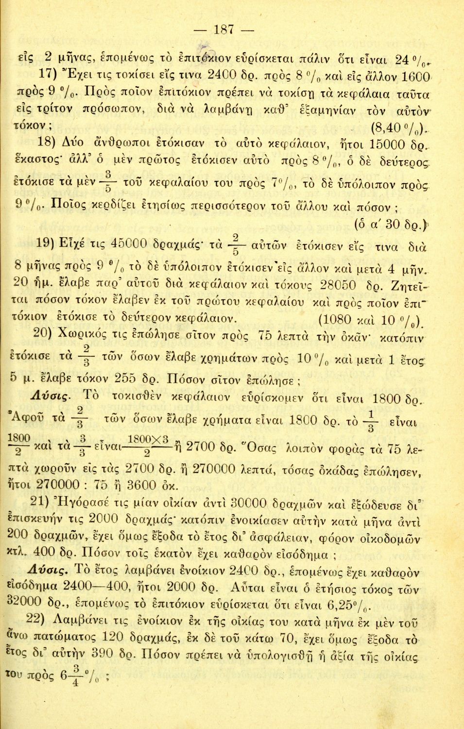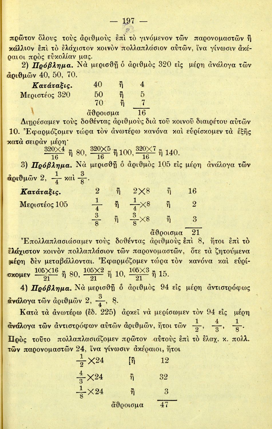 Σχολικό εγχειρίδιο Αριθμητικής για τα Ελληνικά και Αστικά Σχολεία και τα Παρθεναγωγεία που εστιάζει στις αριθμητικές πράξεις, τα κλάσματα, τους δεκαδικούς και συμμιγείς αριθμούς, και τις δυνάμεις. Περιέχει και
