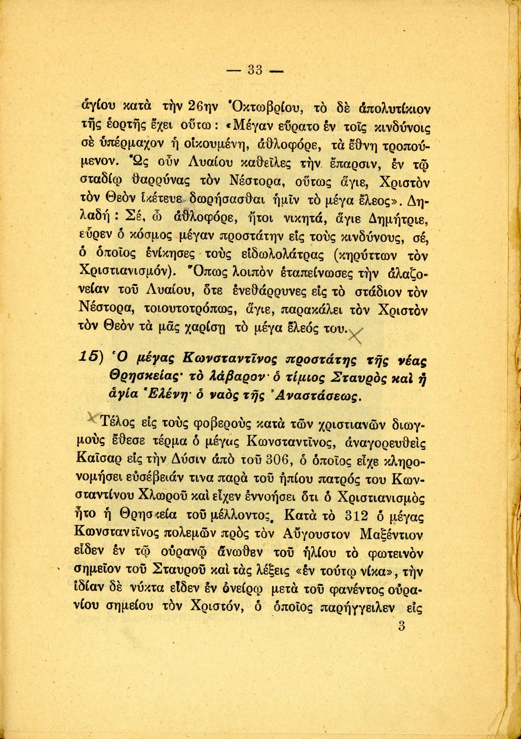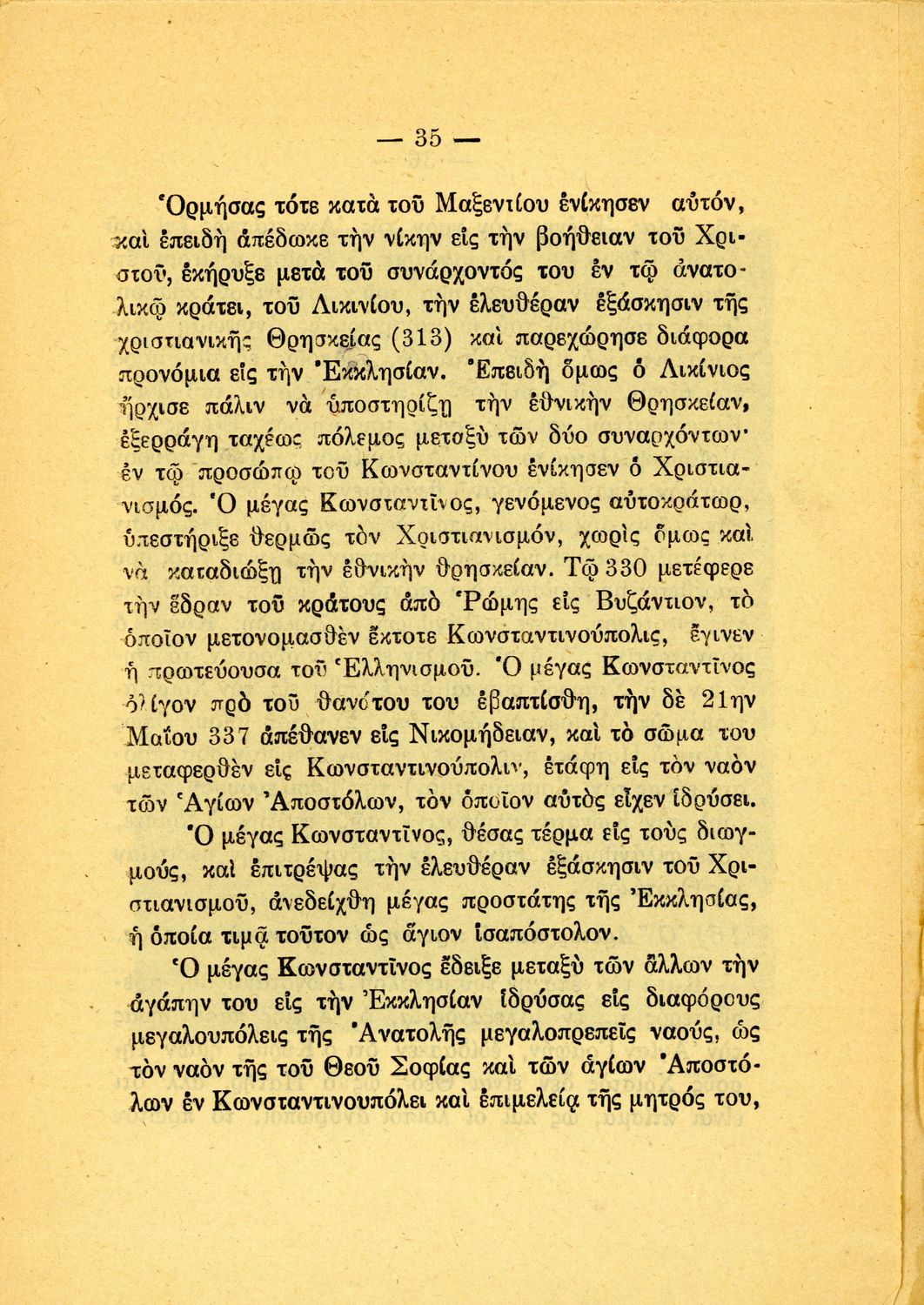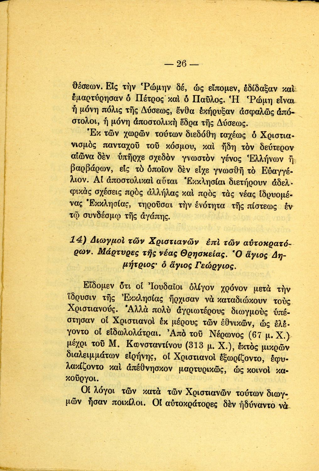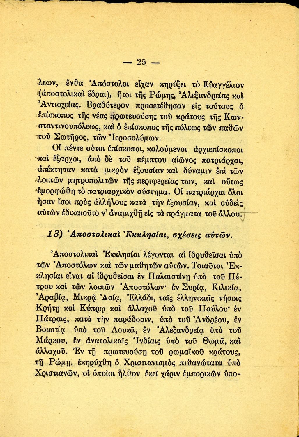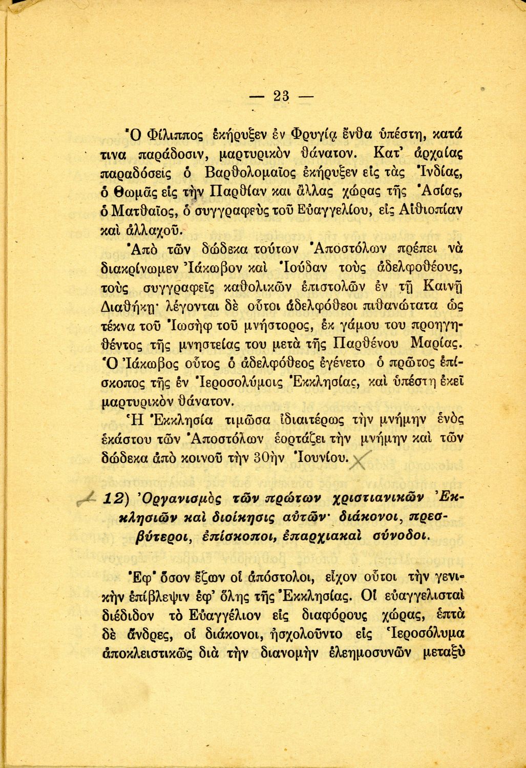 Σχολικό εγχειρίδιο Θρησκευτικών. Το βιβλίο συντάχθηκε σύμφωνα με το πρόγραμμα της 1ης Σεπτεμβρίου 1921 του Υπουργείου Εκκλησιαστικών και Δημόσιας Εκπαιδεύσεως. Περιέχει την ιστορία της Εκκλησίας από την ίδρυσή