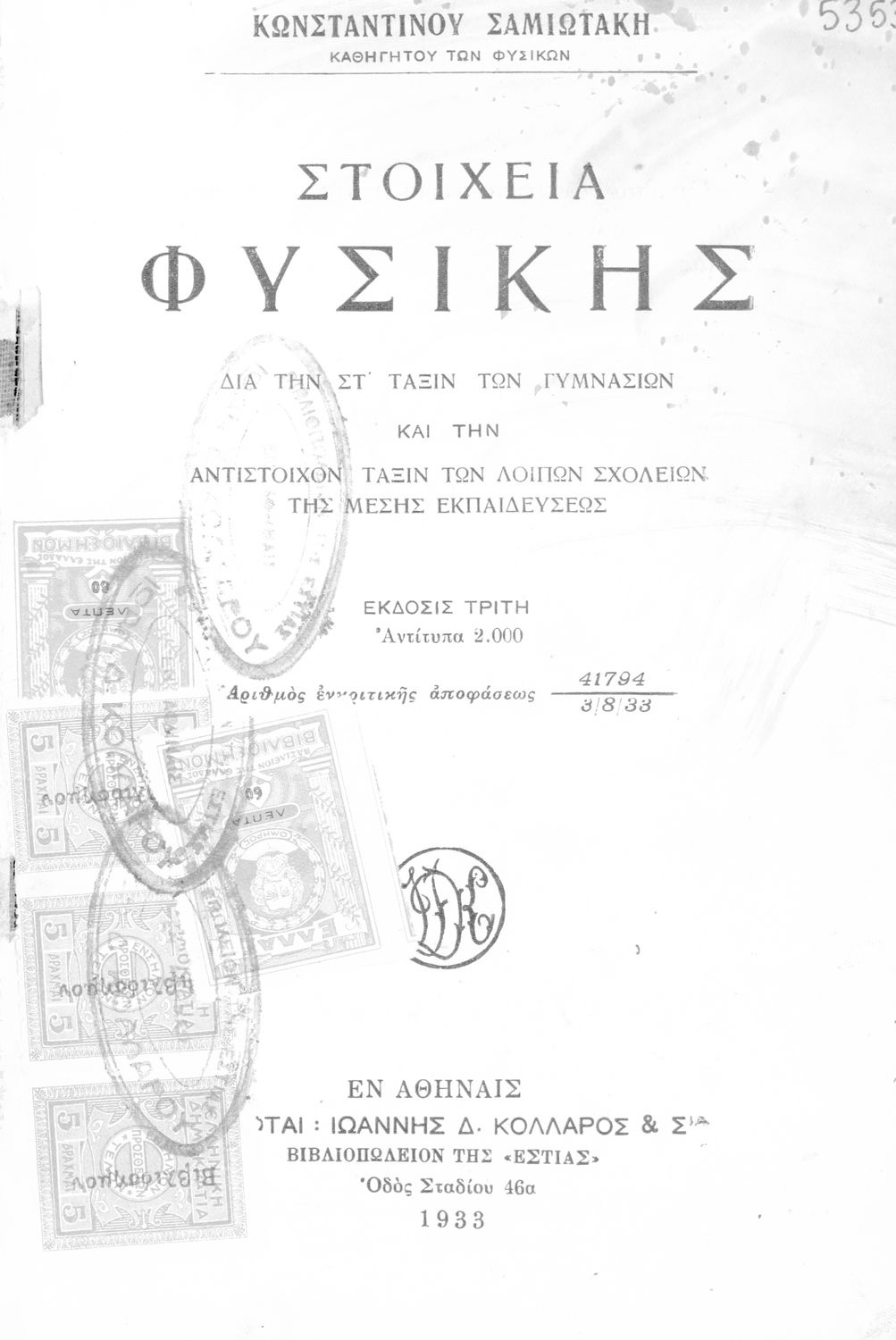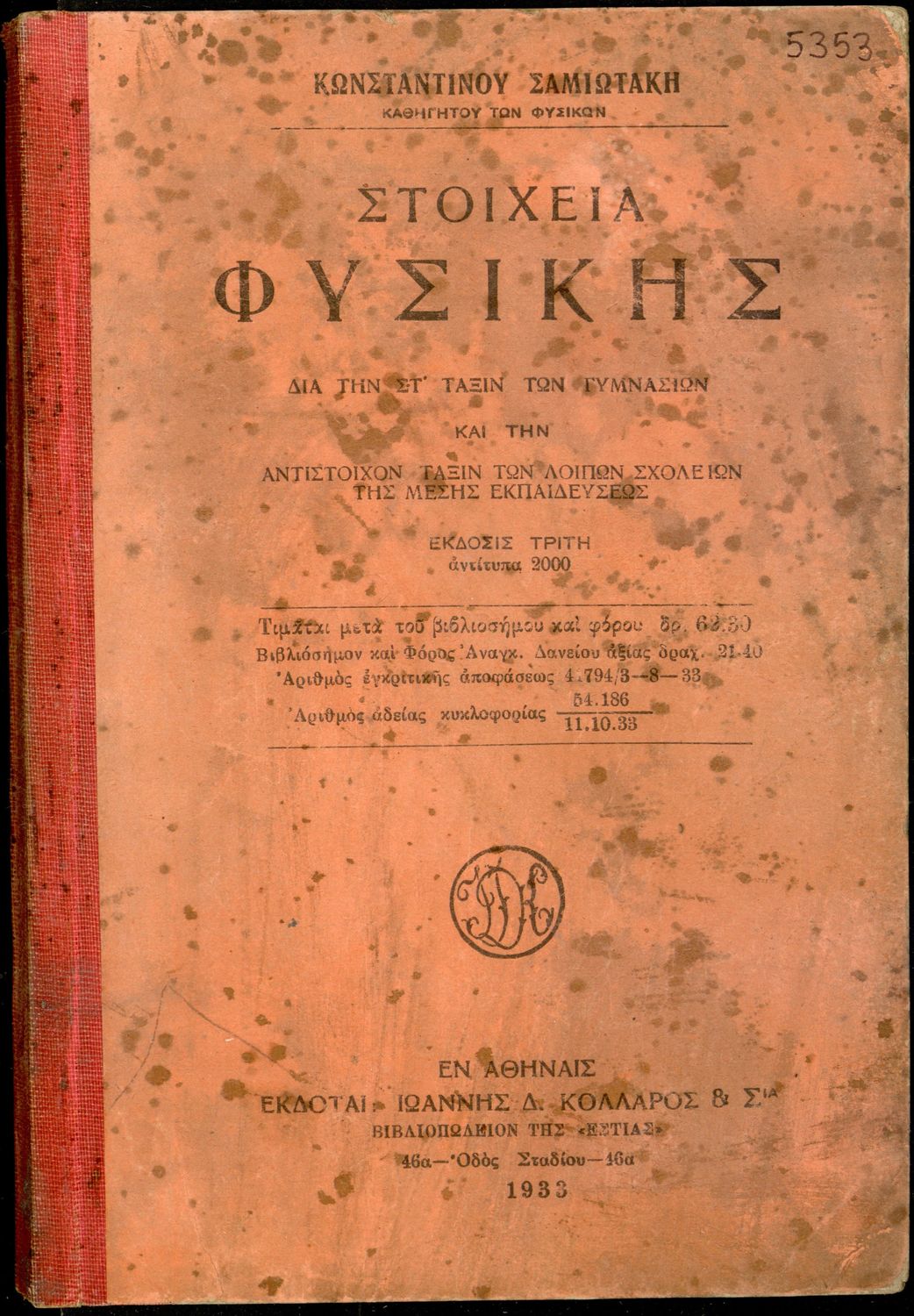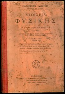Κωδικός αναγνώρισης: 20-05353 Τίτλος: Στοιχεία φυσικής διά την ΣΤ΄ τάξιν των Γυμνασίων και την αντιστοίχον τάξιν των λοιπών σχολείων της Μ. Εκπαιδεύσεως Συγγραφέας: Κωνσταντίνος Σαμιωτάκης Μέγεθος και υπόστρωμα: Σχολικό εγχειρίδιο, 20εκ., σκληρό εξώφυλλο, 296 σελίδες. Σκίτσα (ασπρόμαυρα). |