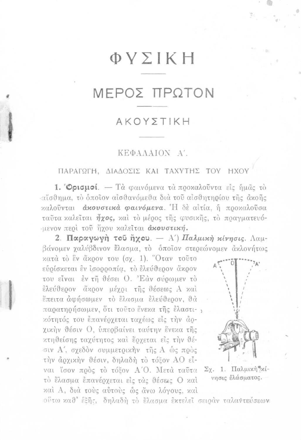 Βαθμίδα εκπαίδευσης: Δευτεροβάθμια Τάξη: ΣΤ' Γυμνασίου Μάθημα: Φυσική Γλώσσα: Καθαρεύουσα Παρουσίαση περιεχομένου: Σχολικό εγχειρίδιο Φυσικής ΣΤ΄ Γυμνασίου που εστιάζει στα φυσικά φαινόμενα που άπτονται της ακουστικής, της οπτικής, του μαγνητισμού και του ηλεκτρισμού. |