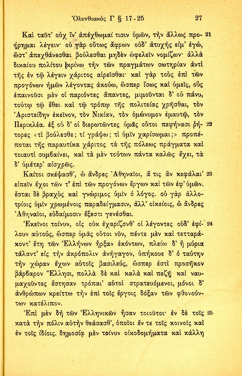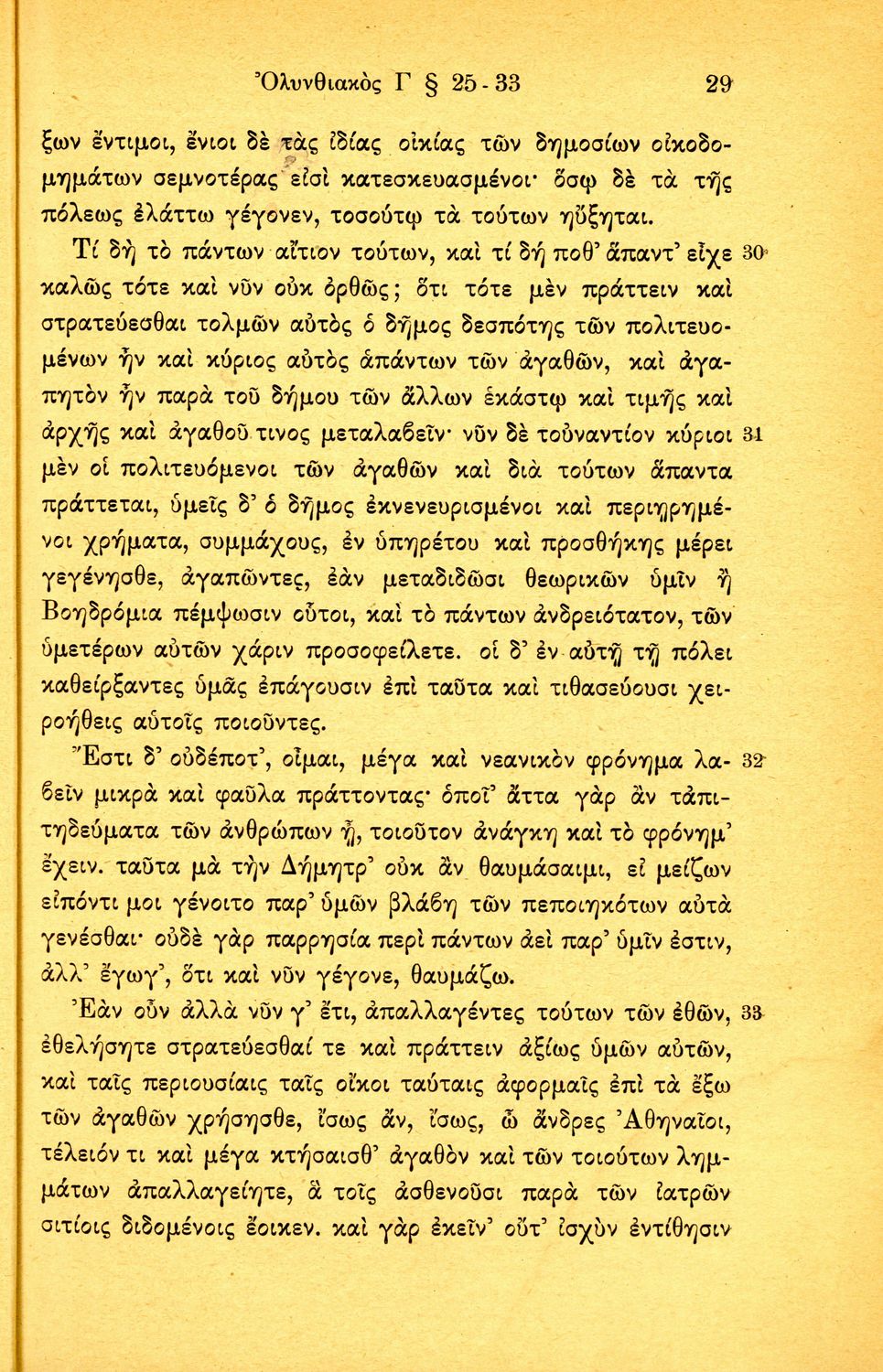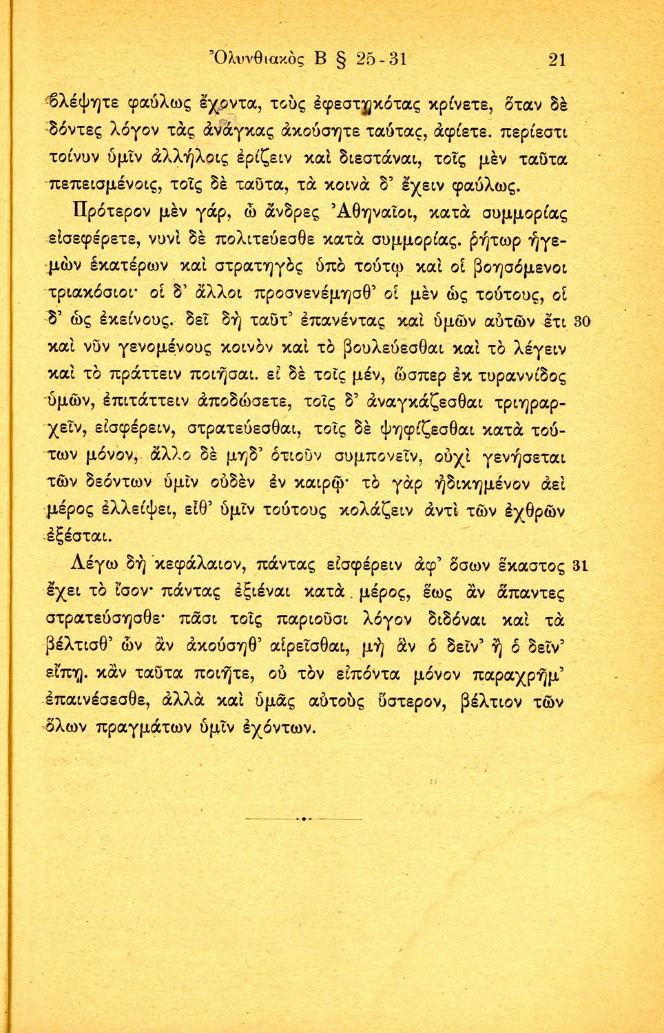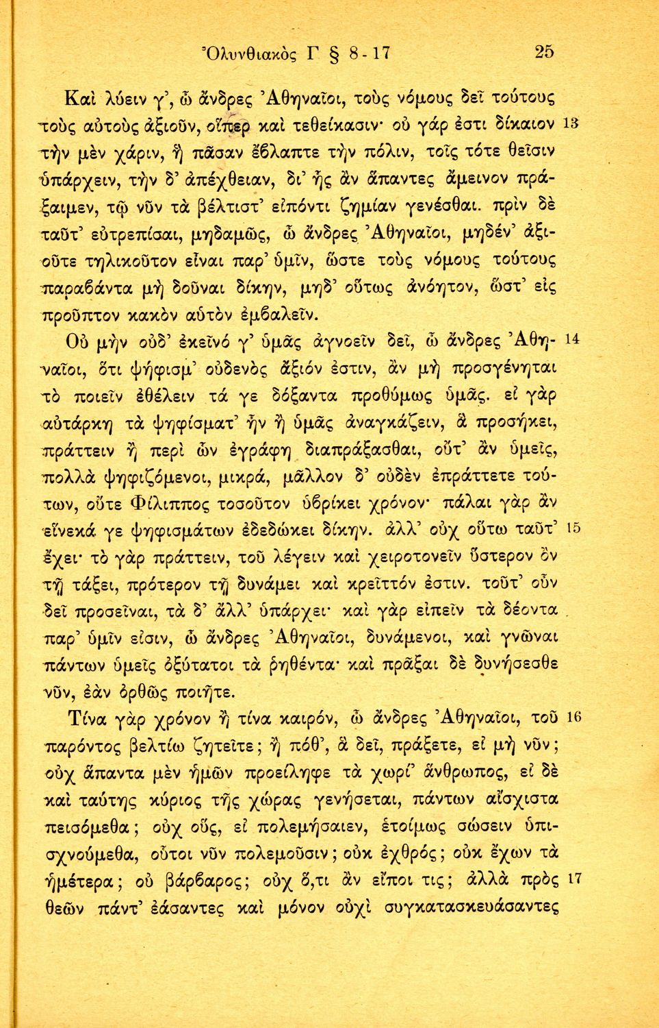 Σχολικό εγχειρίδιο Αρχαίων Ελληνικών Β΄ Γυμνασίου που περιλαμβάνει τους τρεις Ολυνθιακούς Λόγους του Δημοσθένη, ερμηνευτικά και πραγματολογικά σχόλια, λεξιλόγιο, γραμματικές παρατηρήσεις, εισαγωγικά σχόλια για τον ζωή και το έργο του Δημοσθένη, την πλοκή και την υπόθεση των Λόγων, και πίνακα των κυριοτέρων ονομάτων και ορισμών.