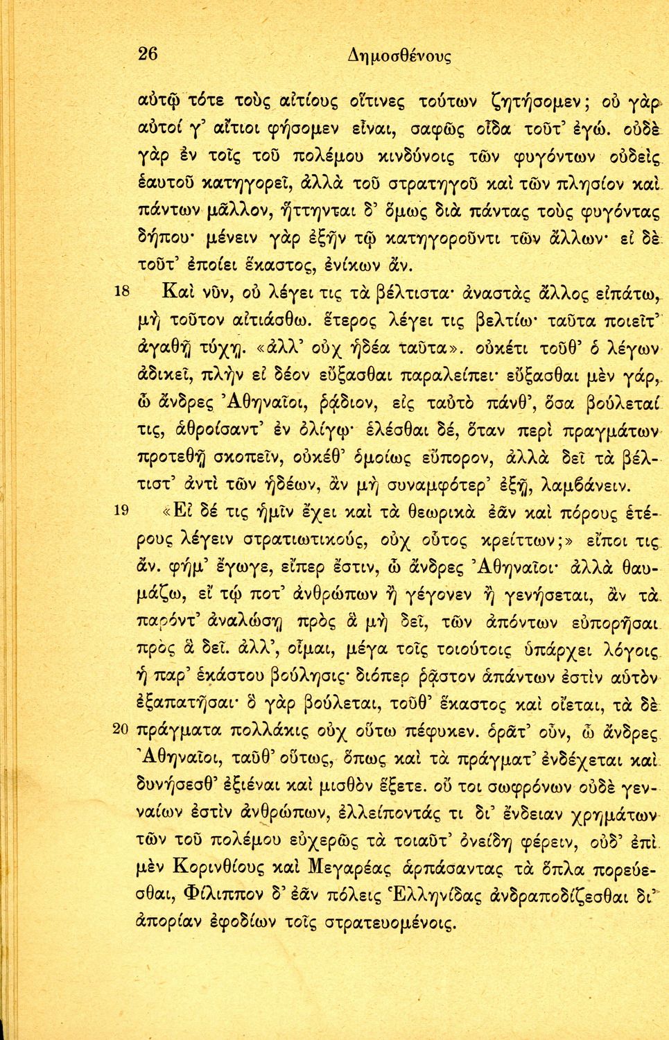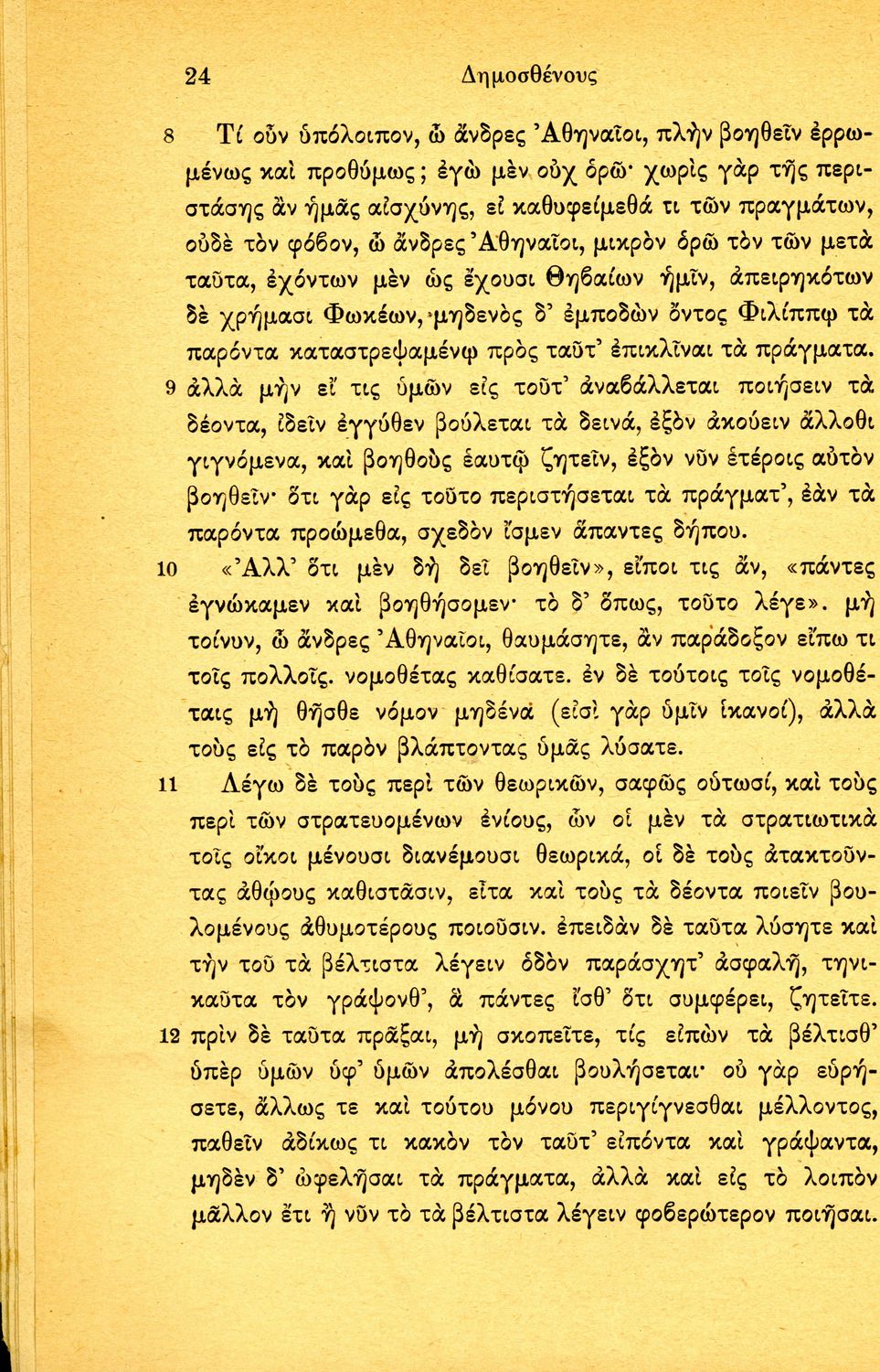 Σχολικό εγχειρίδιο Αρχαίων Ελληνικών Δ΄ Γυμνασίου που περιέχει τους Ολυνθιακούς Α΄ και Β΄ και τους Φιλιππικούς Α΄ και Β' του Δημοσθένη, ερμηνευτικά και πραγματολογικά σχόλια και γραμματικές παρατηρήσεις.