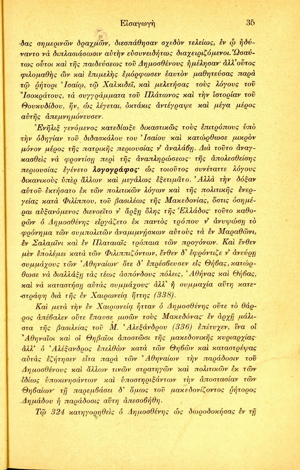 Σχολικό εγχειρίδιο Αρχαίων Ελληνικών Ε΄ Γυμνασίου που περιέχει τους Ολυνθιακούς Α΄ και Β΄ και τους Φιλιππικούς Α΄ και Β΄ του Δημοσθένη, βιογραφικό σημείωμα, λεξιλόγιο και ερμηνευτικά και ετυμολογικά σχόλια.