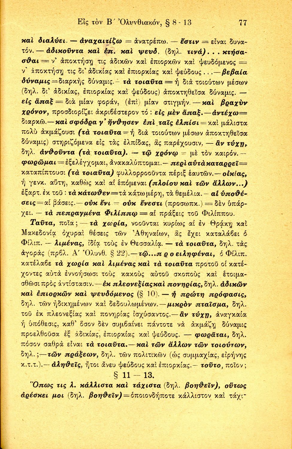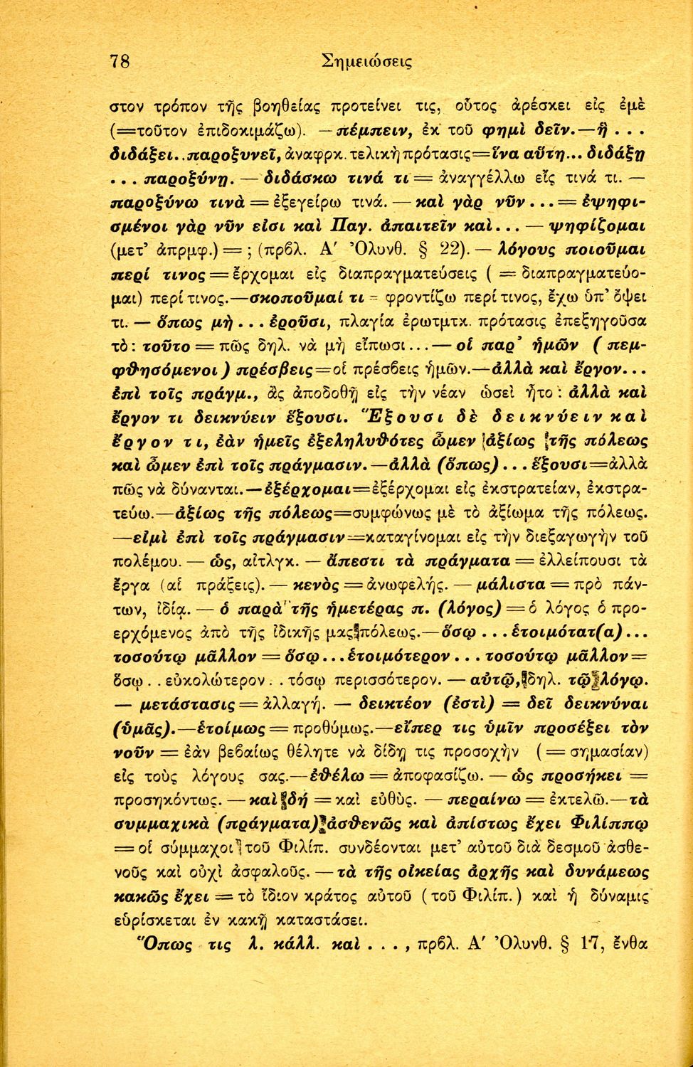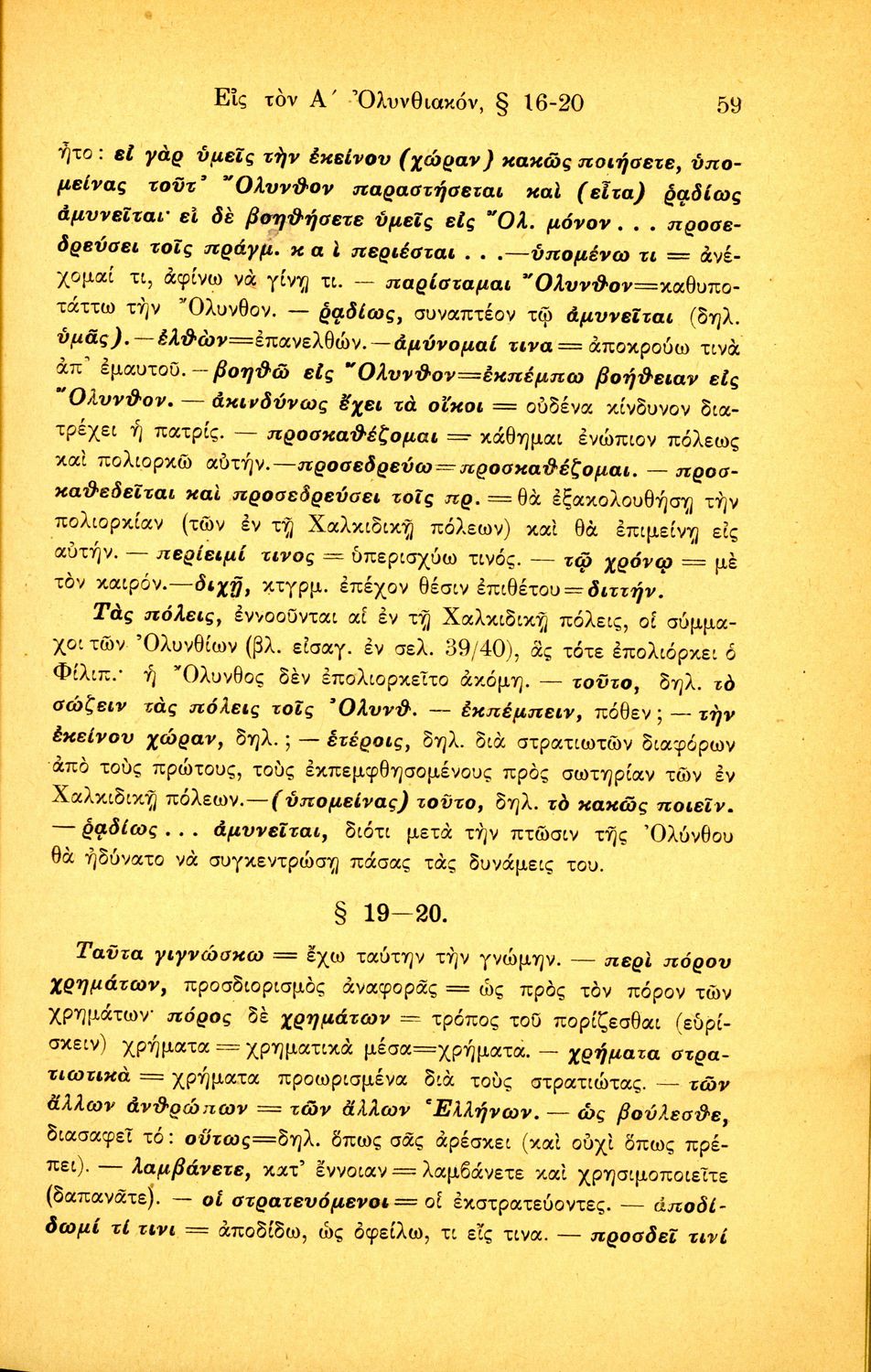 Σχολικό εγχειρίδιο Αρχαίων Ελληνικών Β΄ Γυμνασίου που περιλαμβάνει τους τρεις Ολυνθιακούς Λόγους του Δημοσθένη, ερμηνευτικά και πραγματολογικά σχόλια, λεξιλόγιο, γραμματικές παρατηρήσεις, εισαγωγικά σχόλια για τον ζωή και το έργο του Δημοσθένη, την πλοκή και την υπόθεση των Λόγων, και πίνακα των κυριοτέρων ονομάτων και ορισμών.