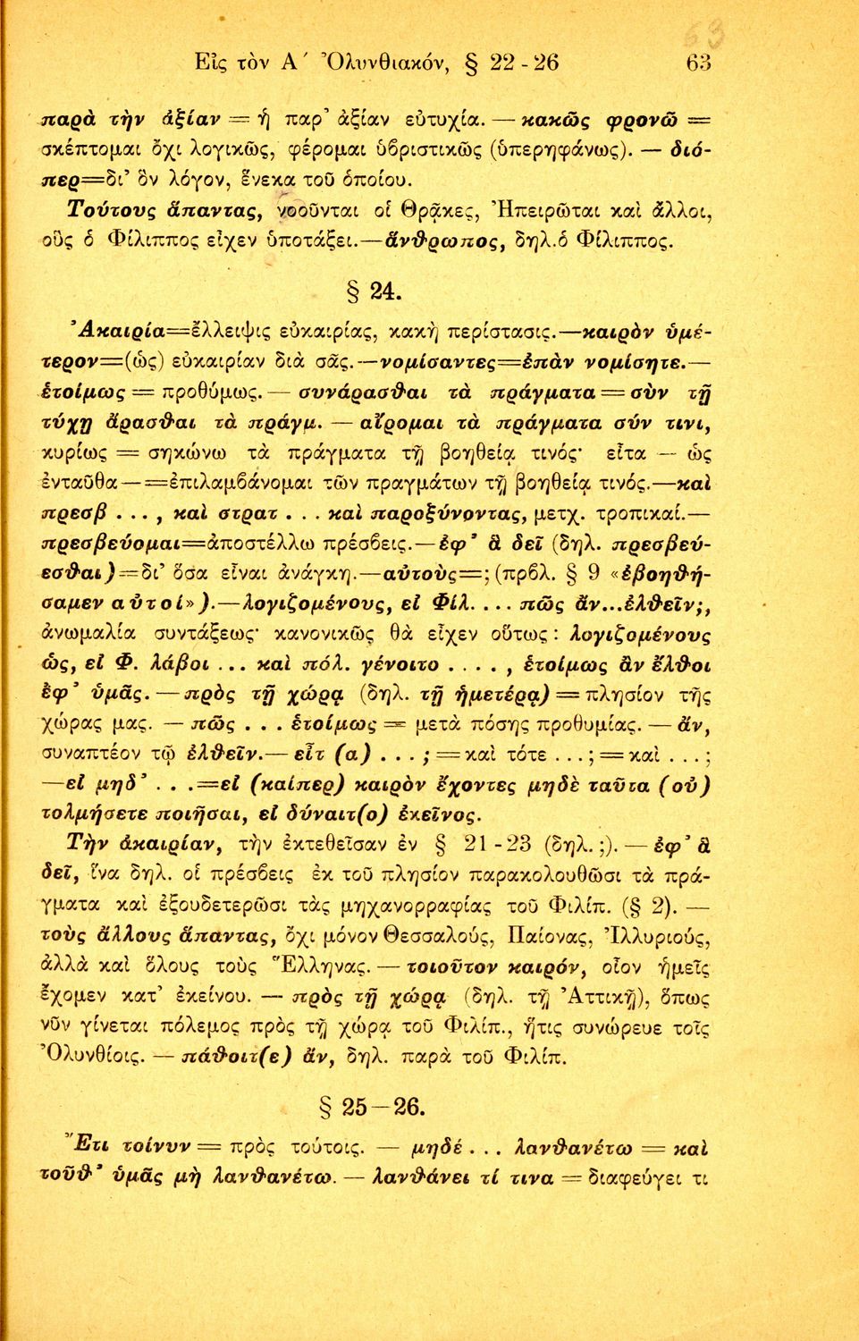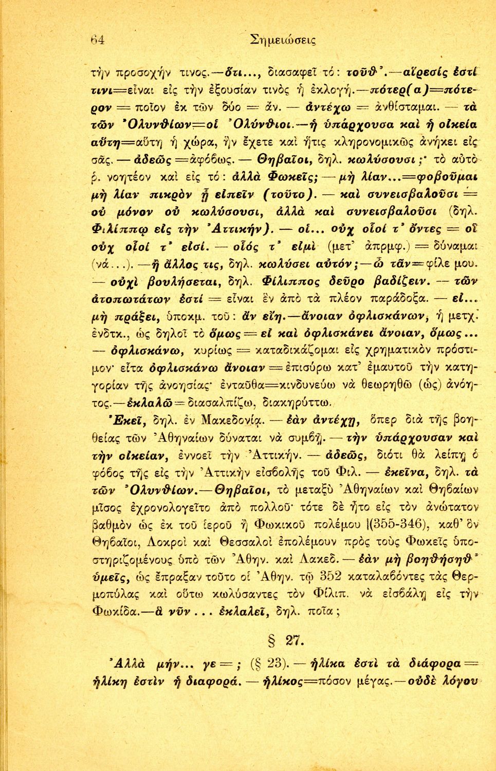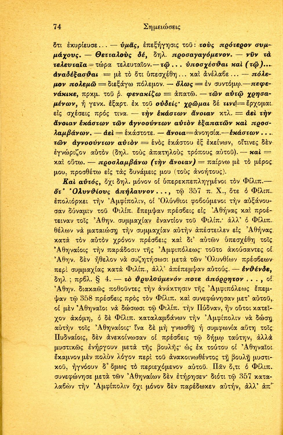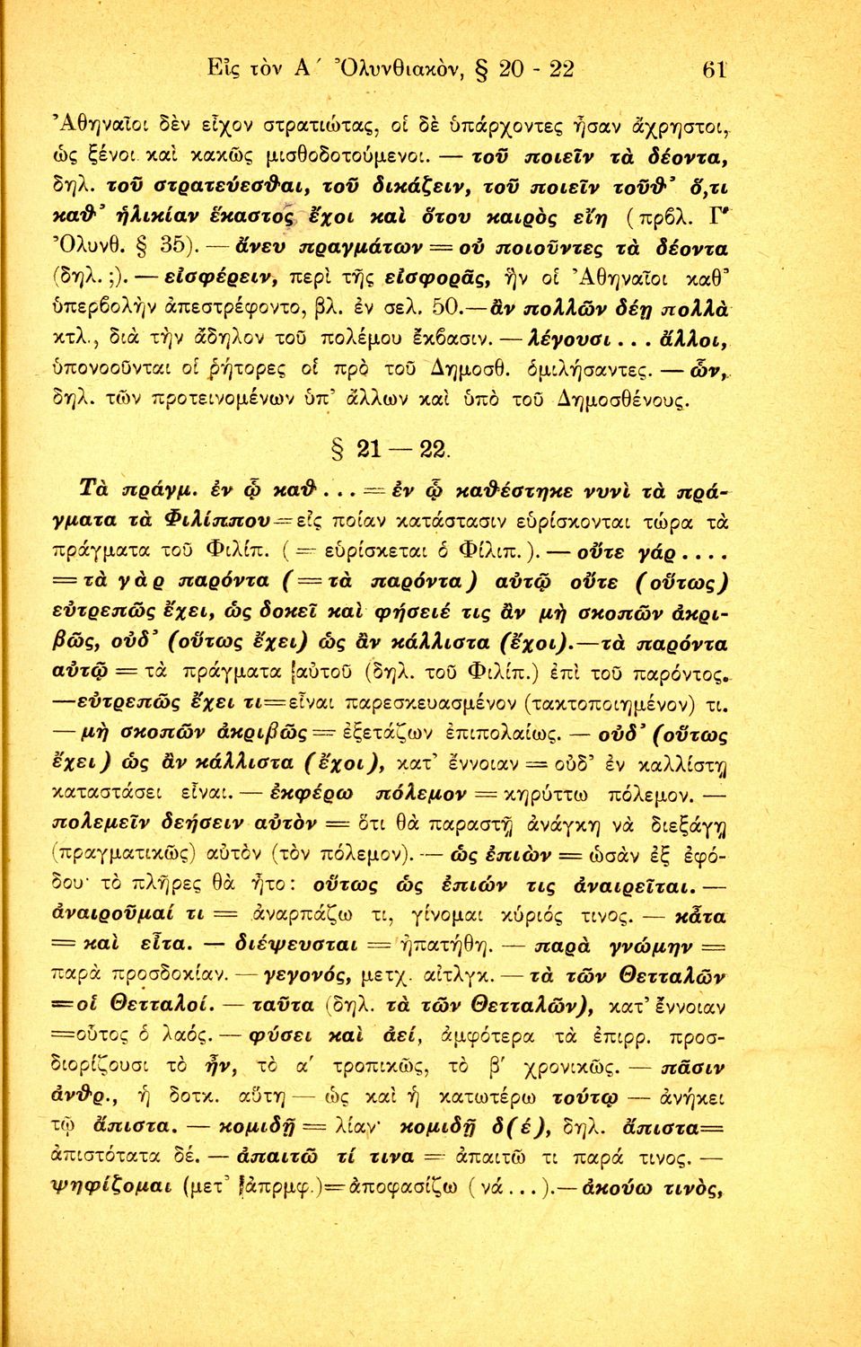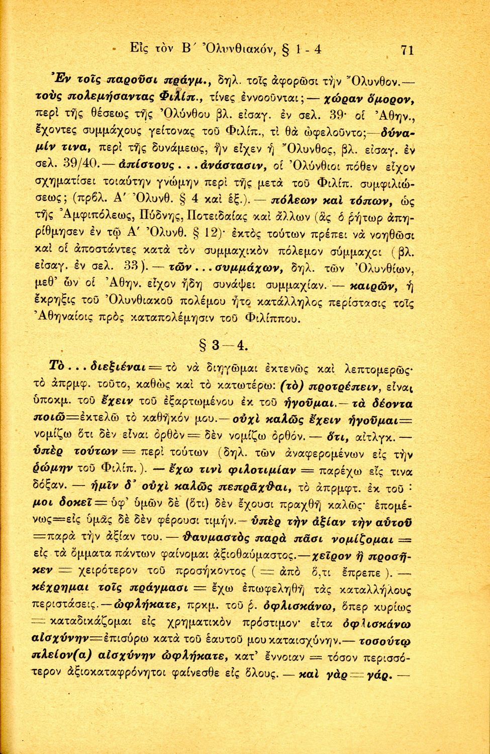 Σχολικό εγχειρίδιο Αρχαίων Ελληνικών Δ΄ Γυμνασίου που περιέχει τους Ολυνθιακούς Α΄ και Β΄ και τους Φιλιππικούς Α΄ και Β' του Δημοσθένη, ερμηνευτικά και πραγματολογικά σχόλια και γραμματικές παρατηρήσεις.